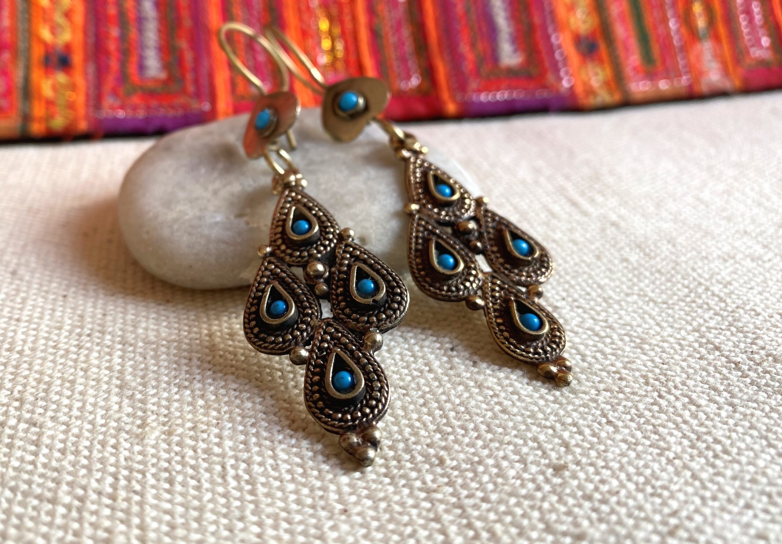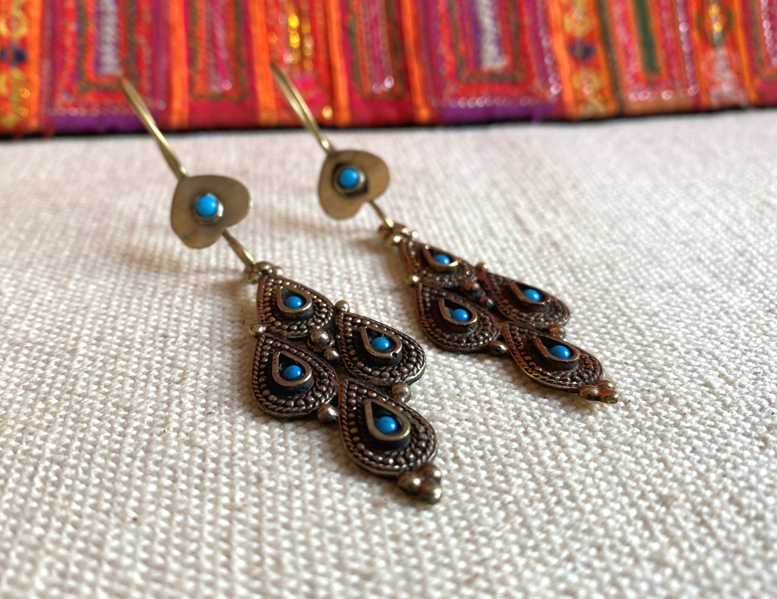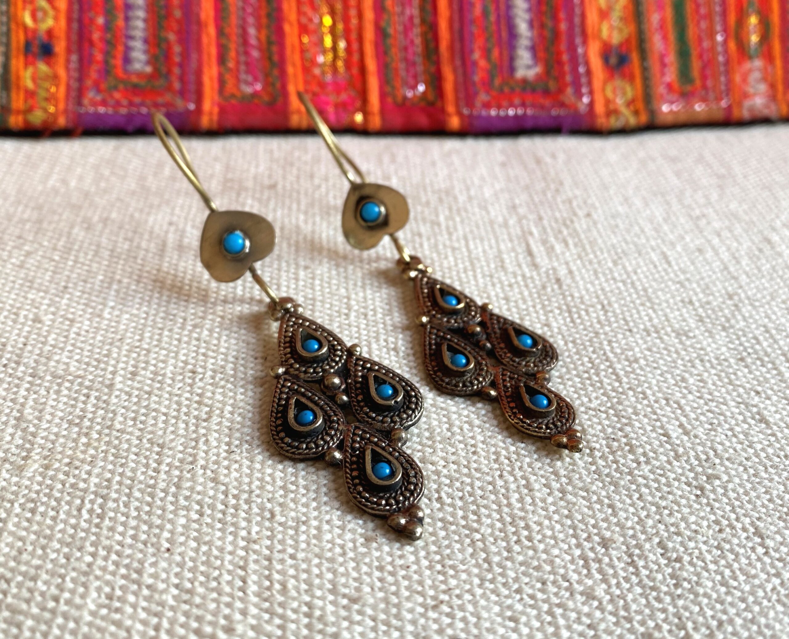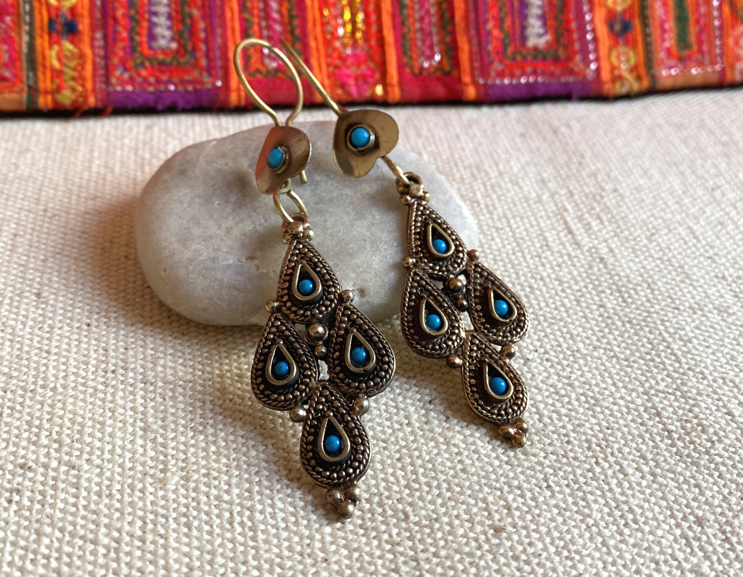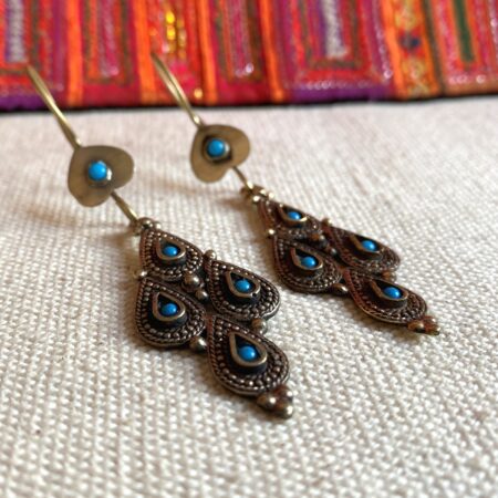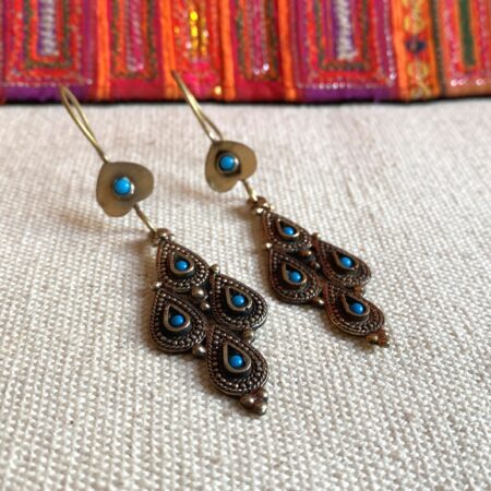 Une paire de boucles d’oreilles d’inspiration Afghane, joliment travaillées en métal ciselé incrusté de Turquoise.