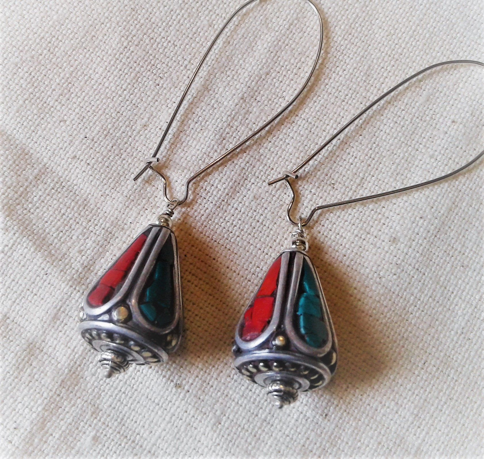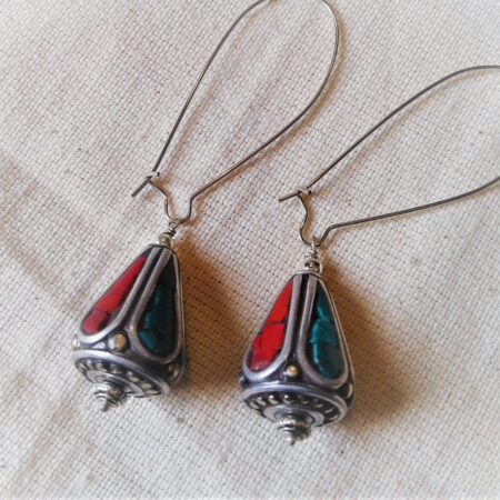 Ces boucles d’oreilles d’inspiration de la culture du Tibet se composent de turquoise et corail.