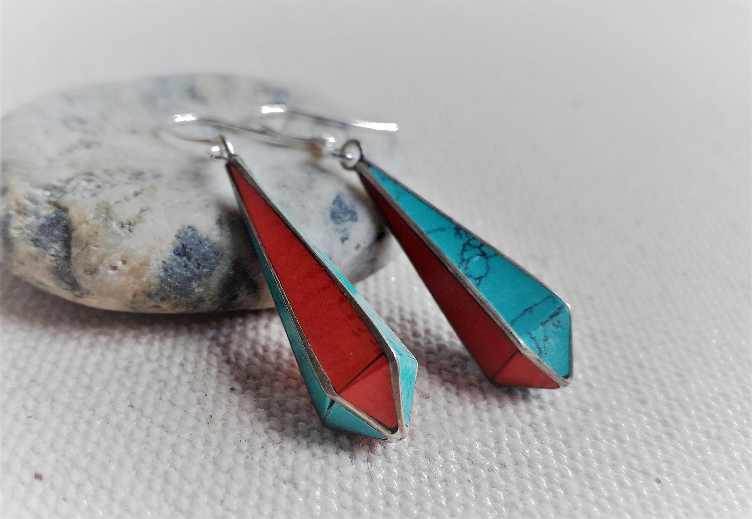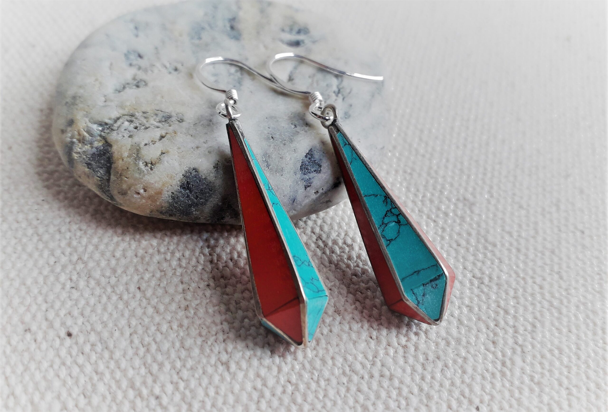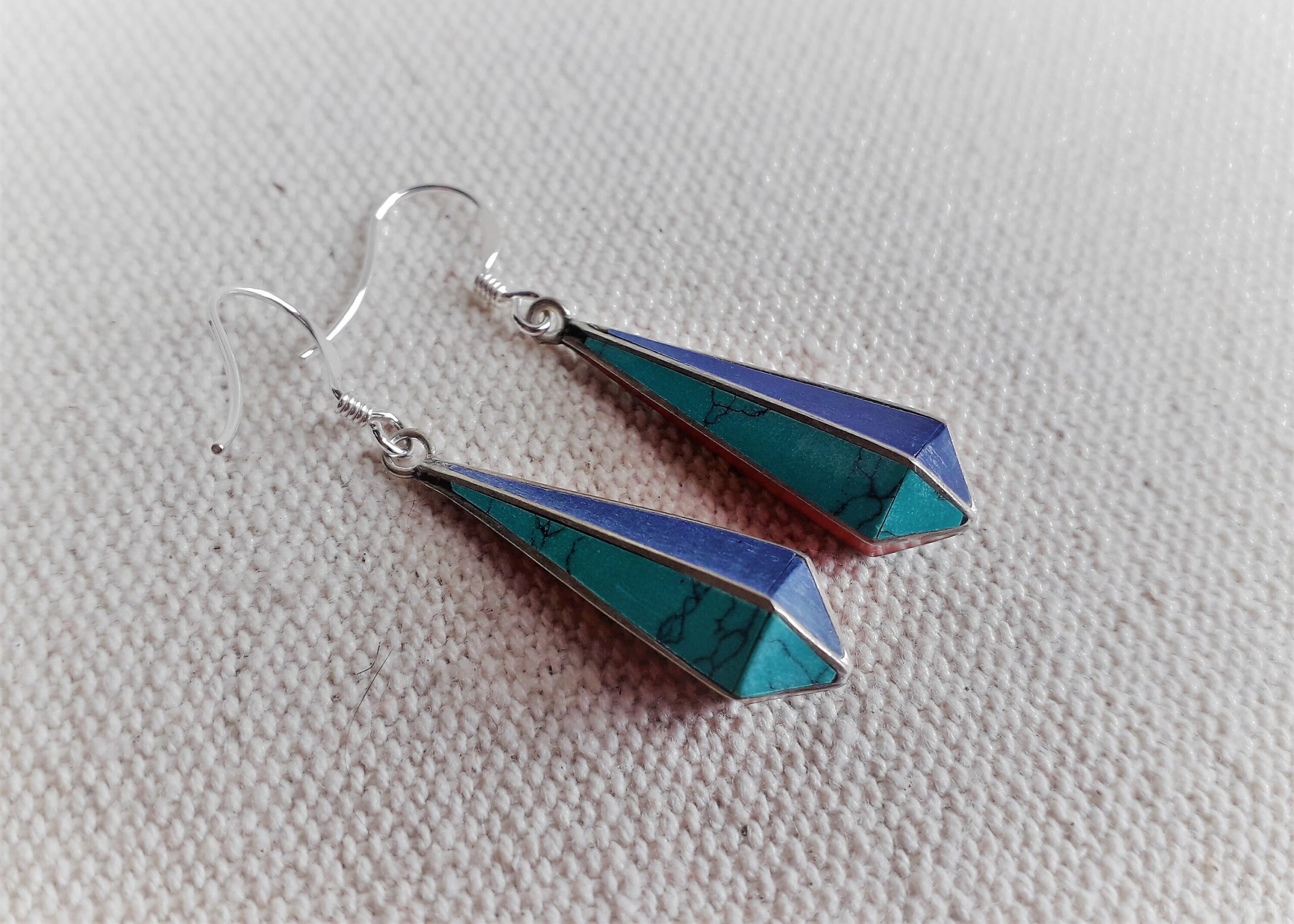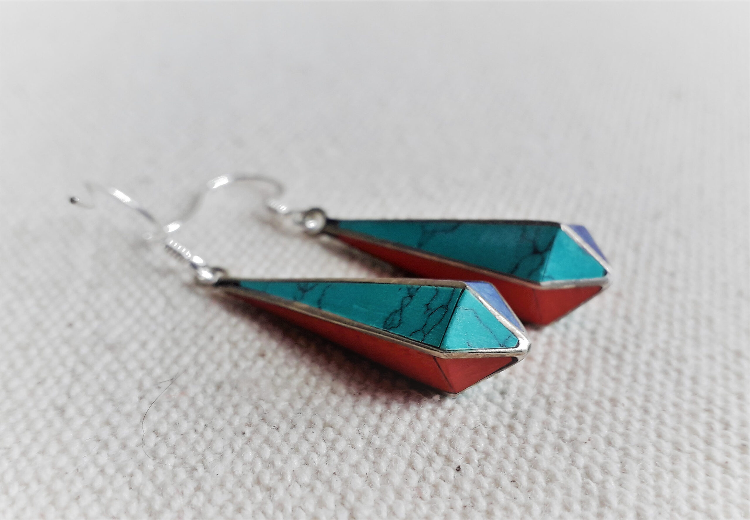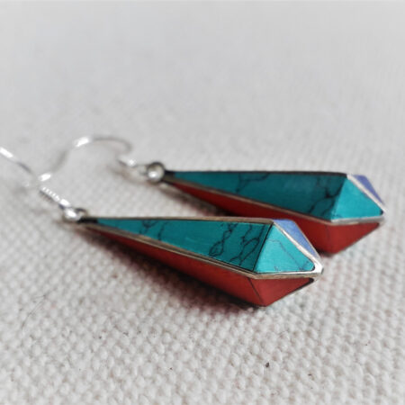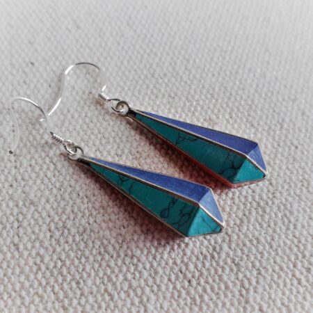 Belle paire de boucles d’oreilles composées d’argent tibétain, de turquoise, de corail et de lapis lazuli . En forme de goutte, elles se marient très bien aux cheveux courts ou longs.