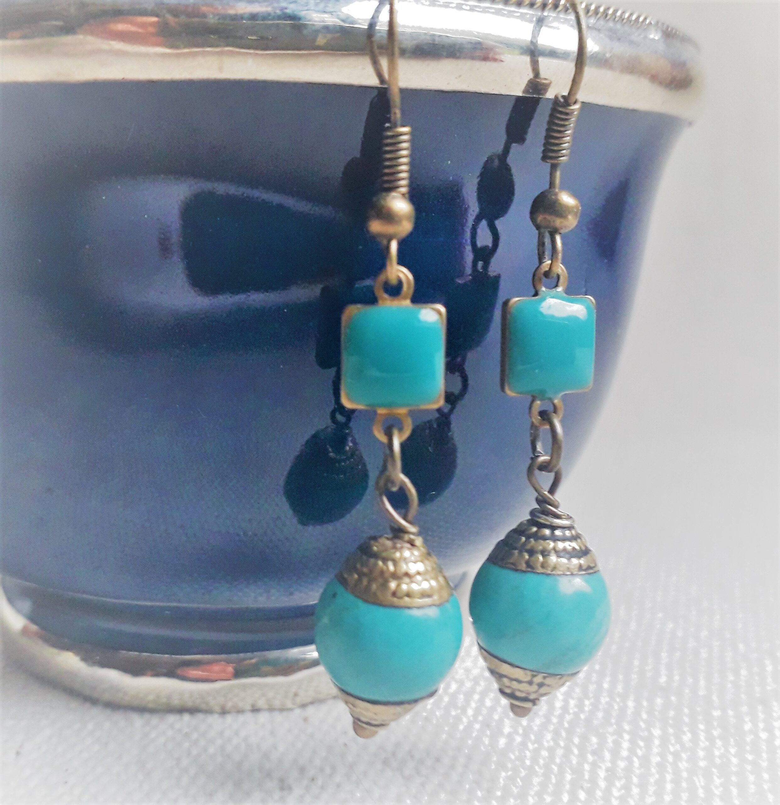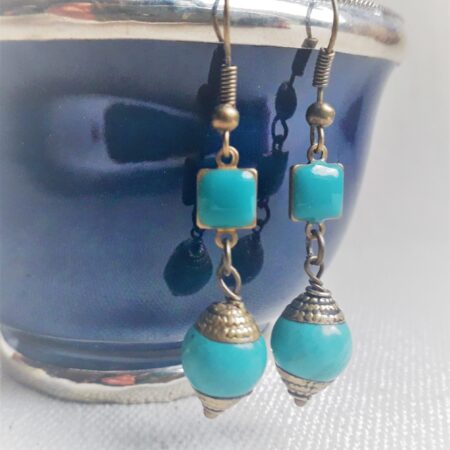 Une paire de boucle d’oreille entre modernité et tradition tibétaine. Elles se composent de perles en Turquoise et laiton et d’apprêts en Céramique .
