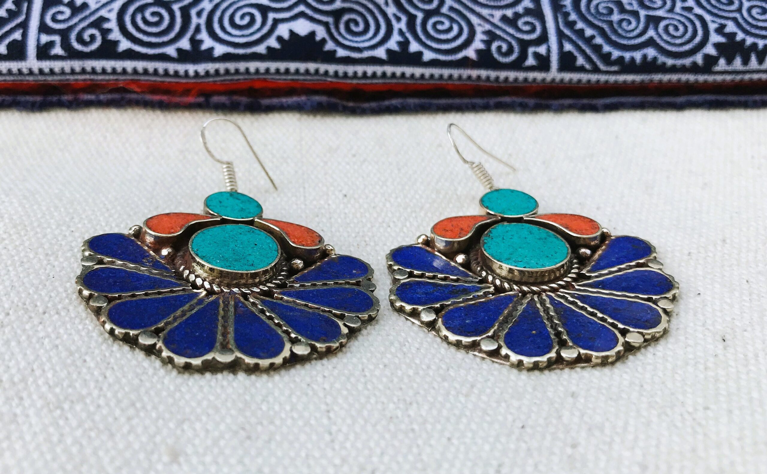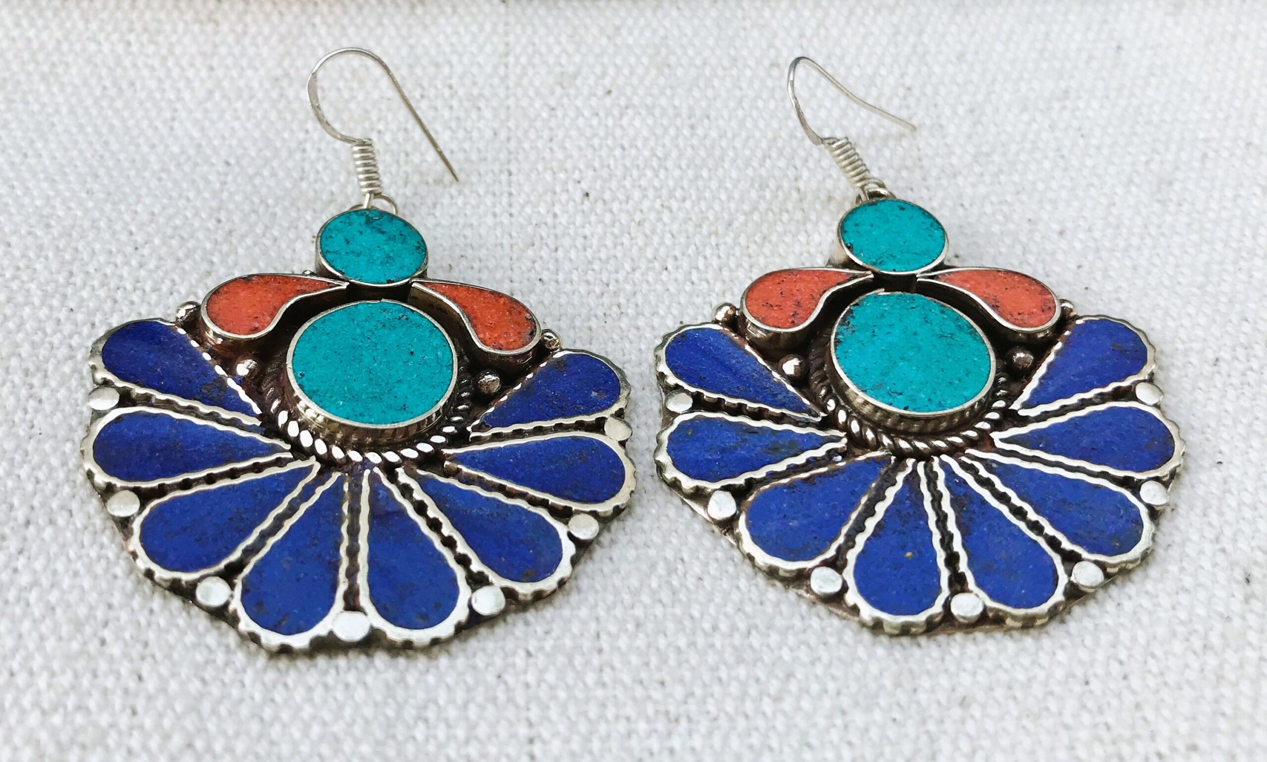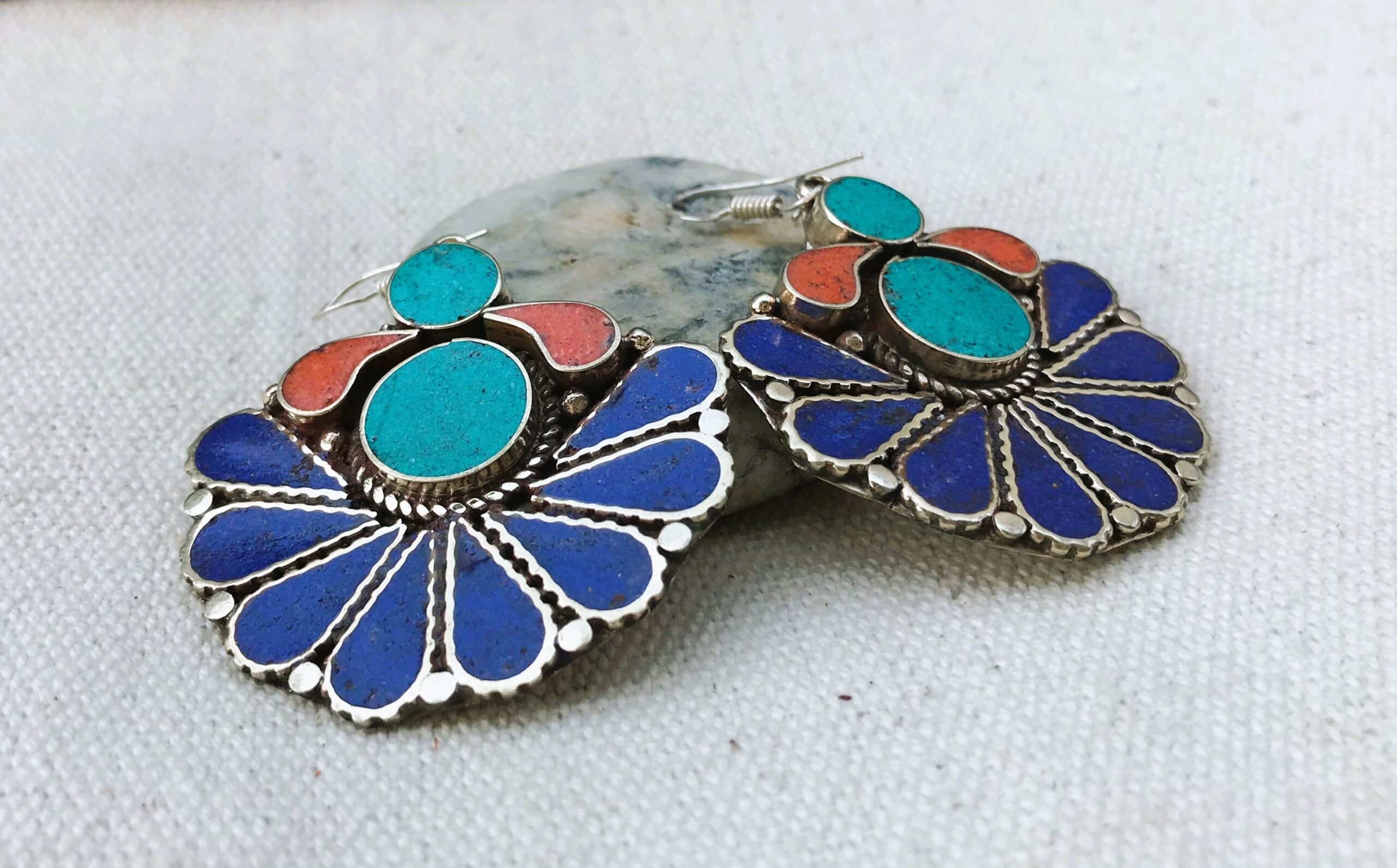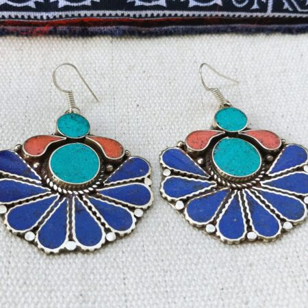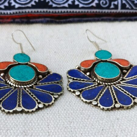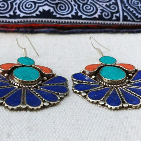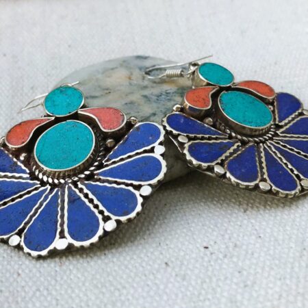 Une très belle paire de boucles d’oreilles composée d’argent tibétain, de turquoise, de lapis lazuli et de Corail. Elles accompagneront vos tenues dans un style ethnique vintage bohème.
