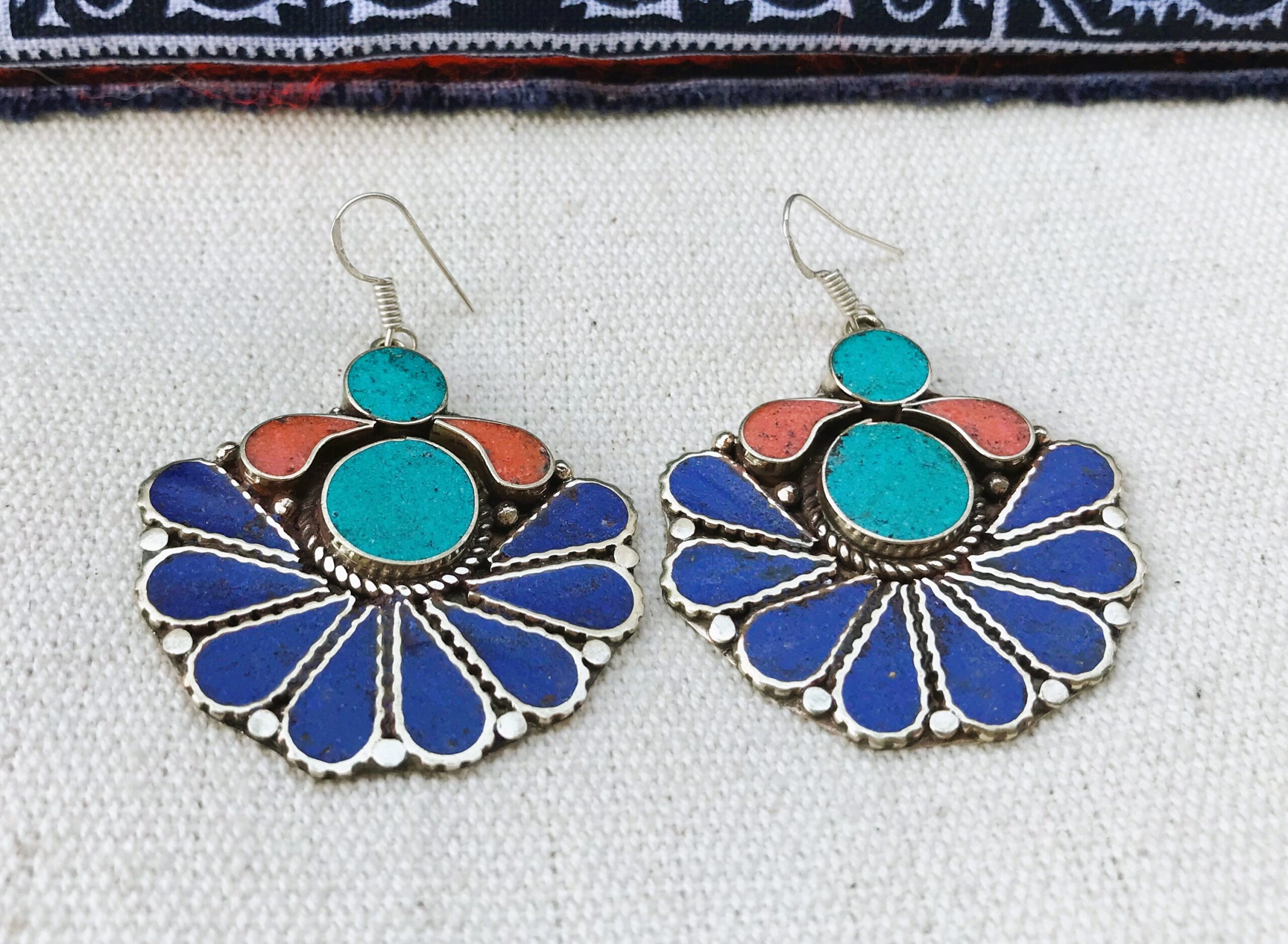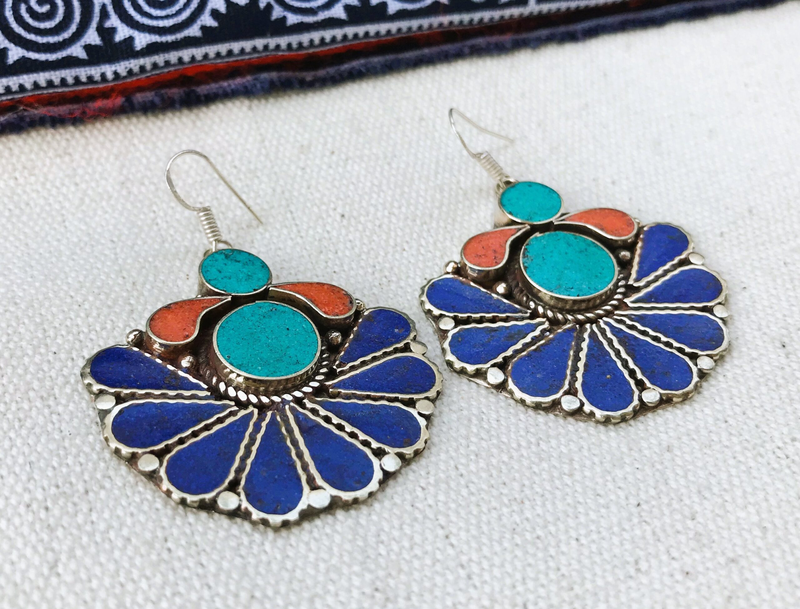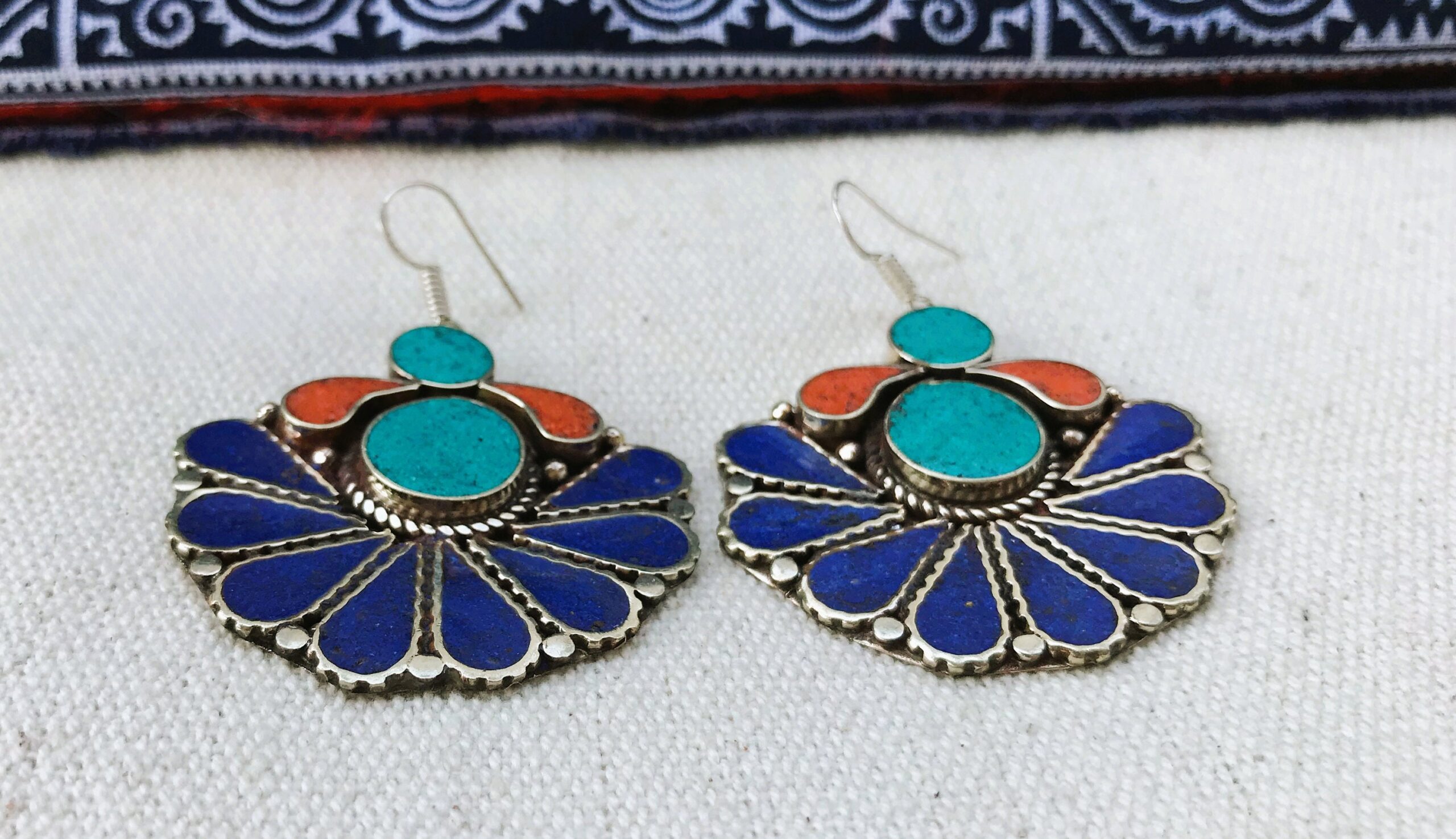 Une très belle paire de boucles d’oreilles composée d’argent tibétain, de turquoise, de lapis lazuli et de Corail. Elles accompagneront vos tenues dans un style ethnique vintage bohème.