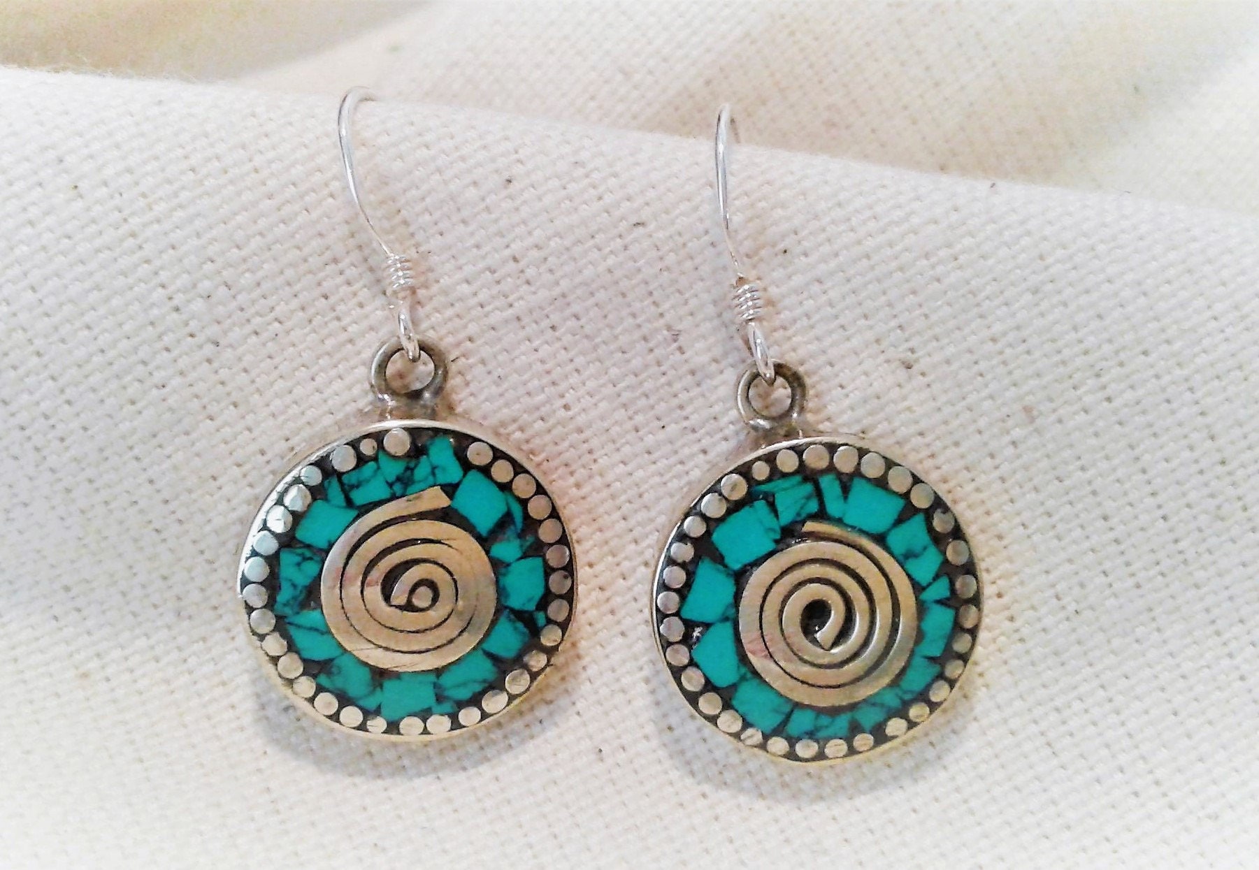 Une belle paire de boucles d’oreilles composées d’argent tibétain et de turquoise .