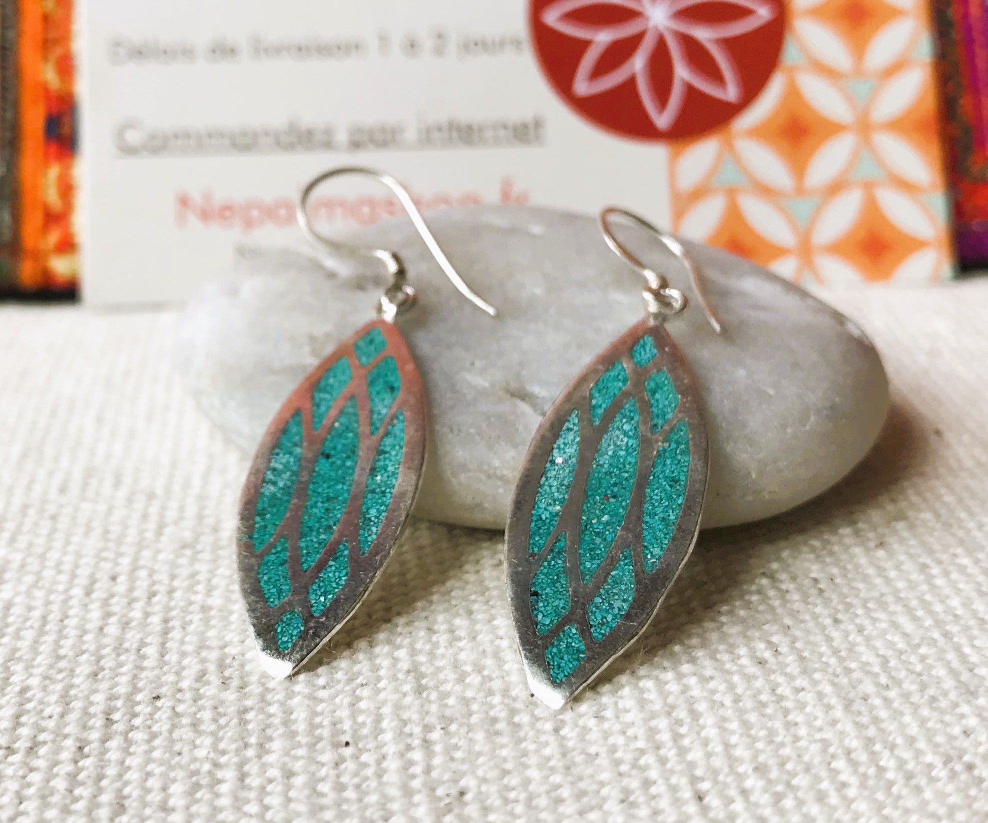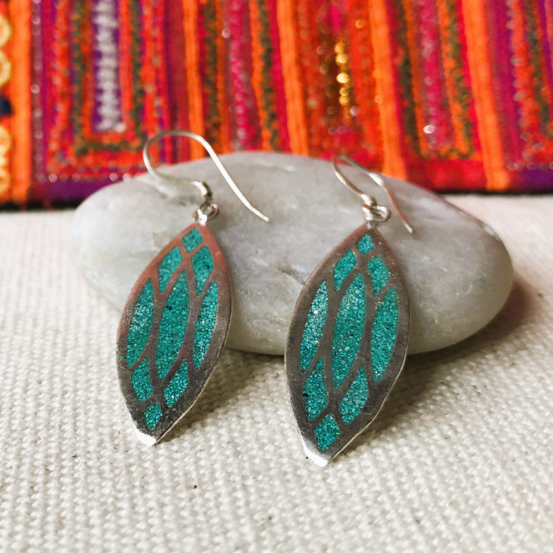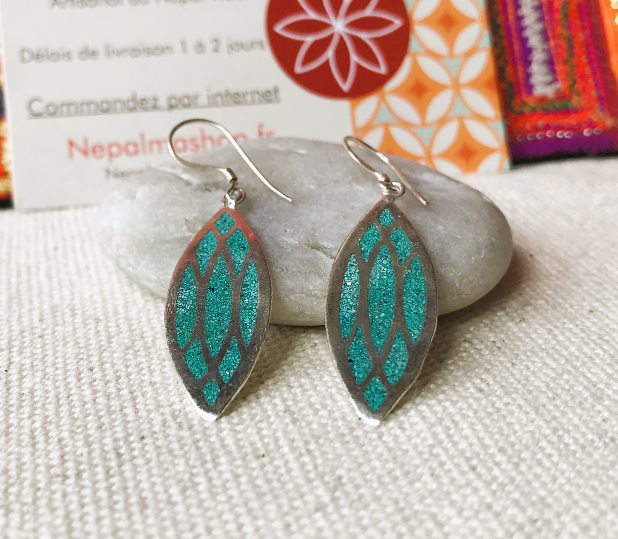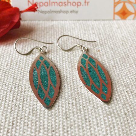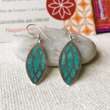 Une fine paire de boucles d’oreilles composée d’argent tibétain et de Turquoise. Elles ont une forme allongée, très facile à porter avec leur petit côté chic !
