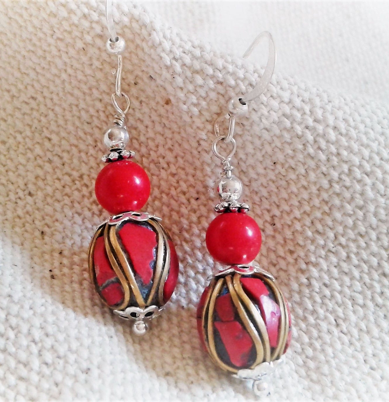 Ces boucles d’oreilles inspirées de design Népalais se composent de perles traditionnelles du Tibet en corail laiton et de perles en argent 925.