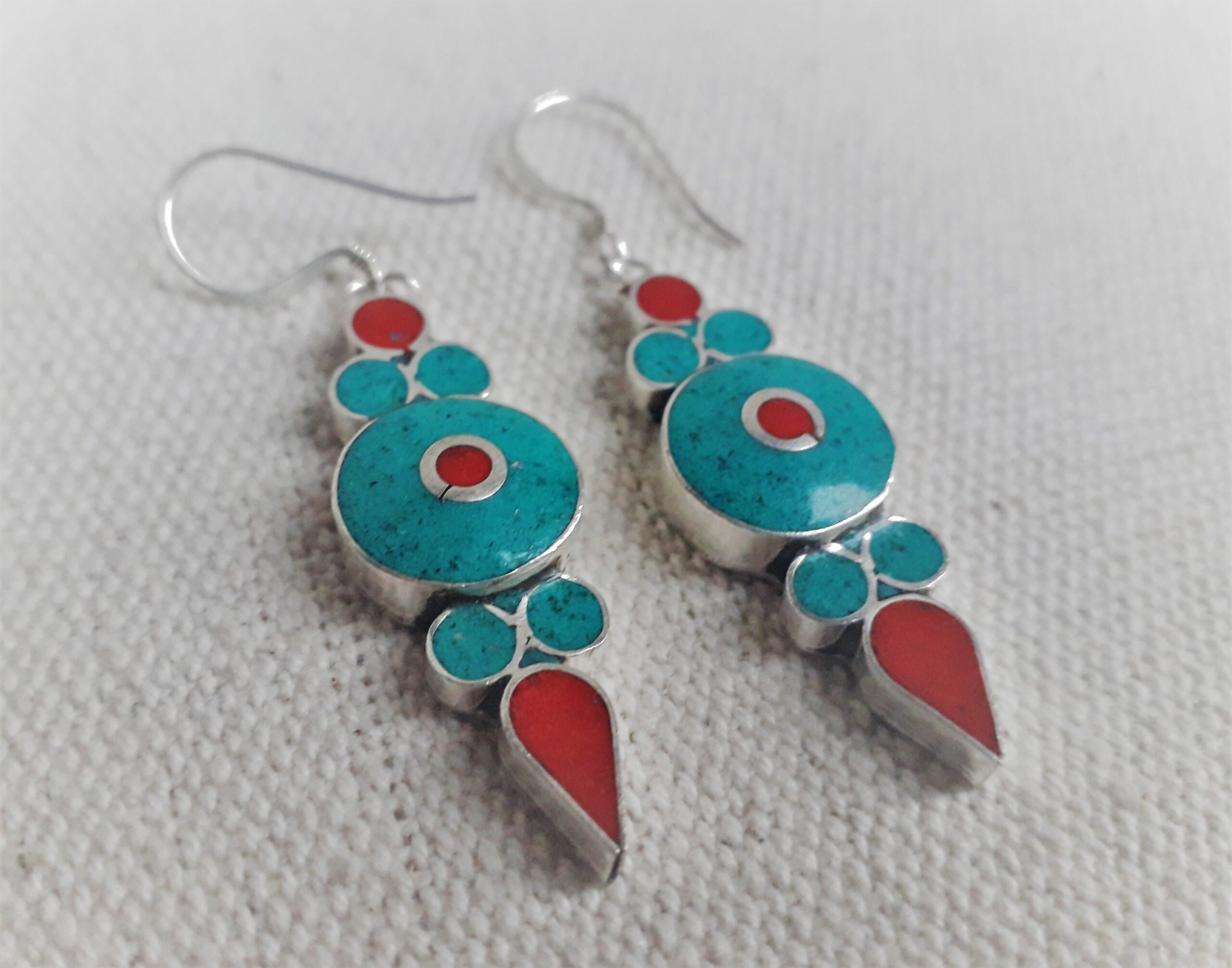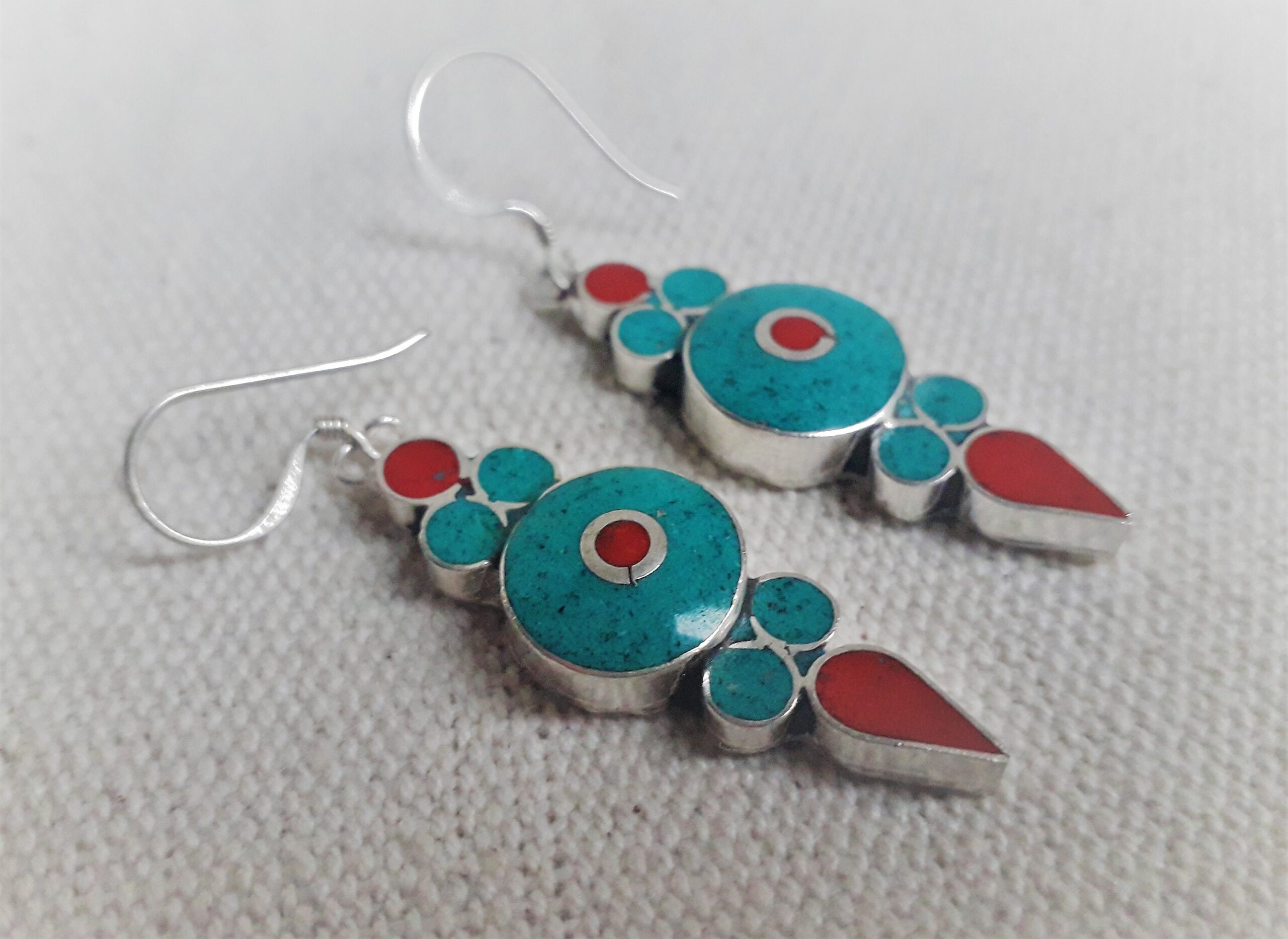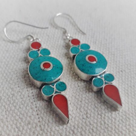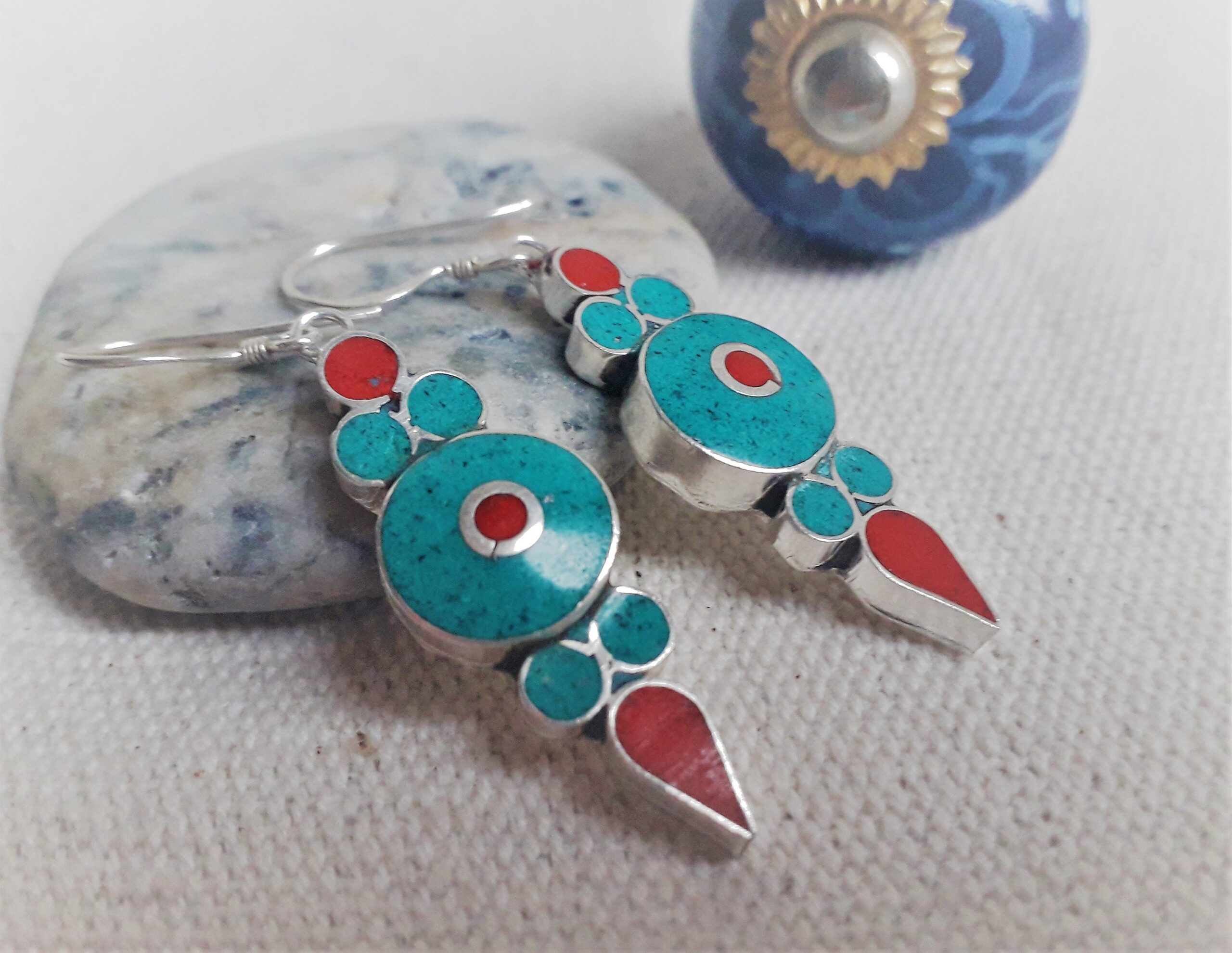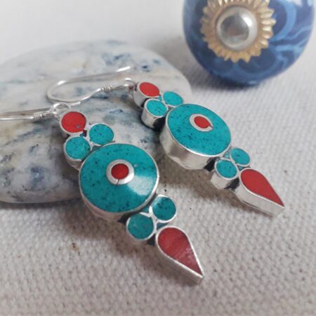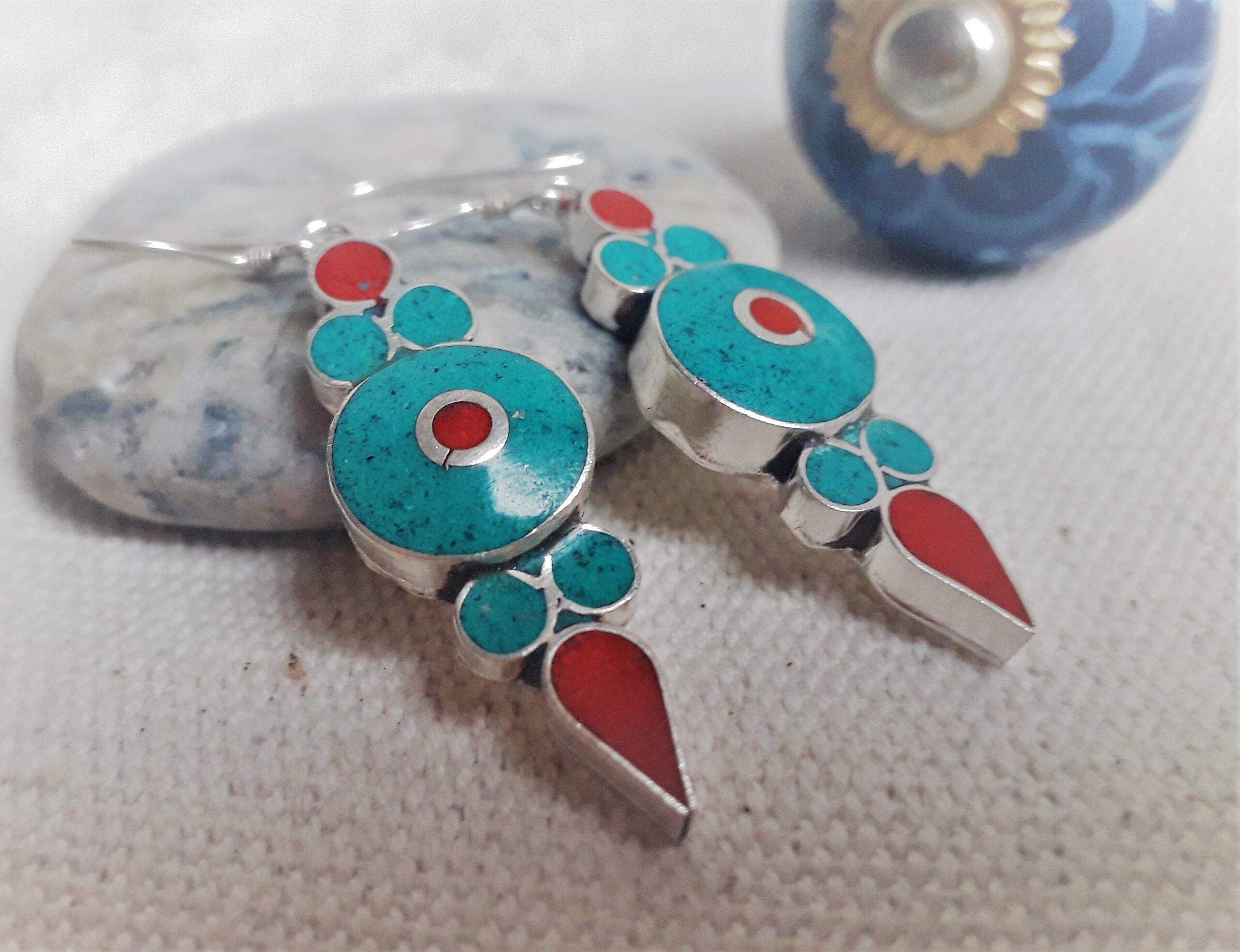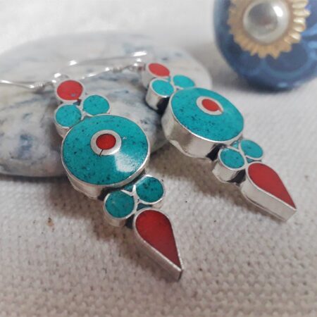 Une très belle paire de boucles d’oreilles d’inspiration tibétaine en forme de goutte composée d’argent tibétain, de turquoise et de corail.