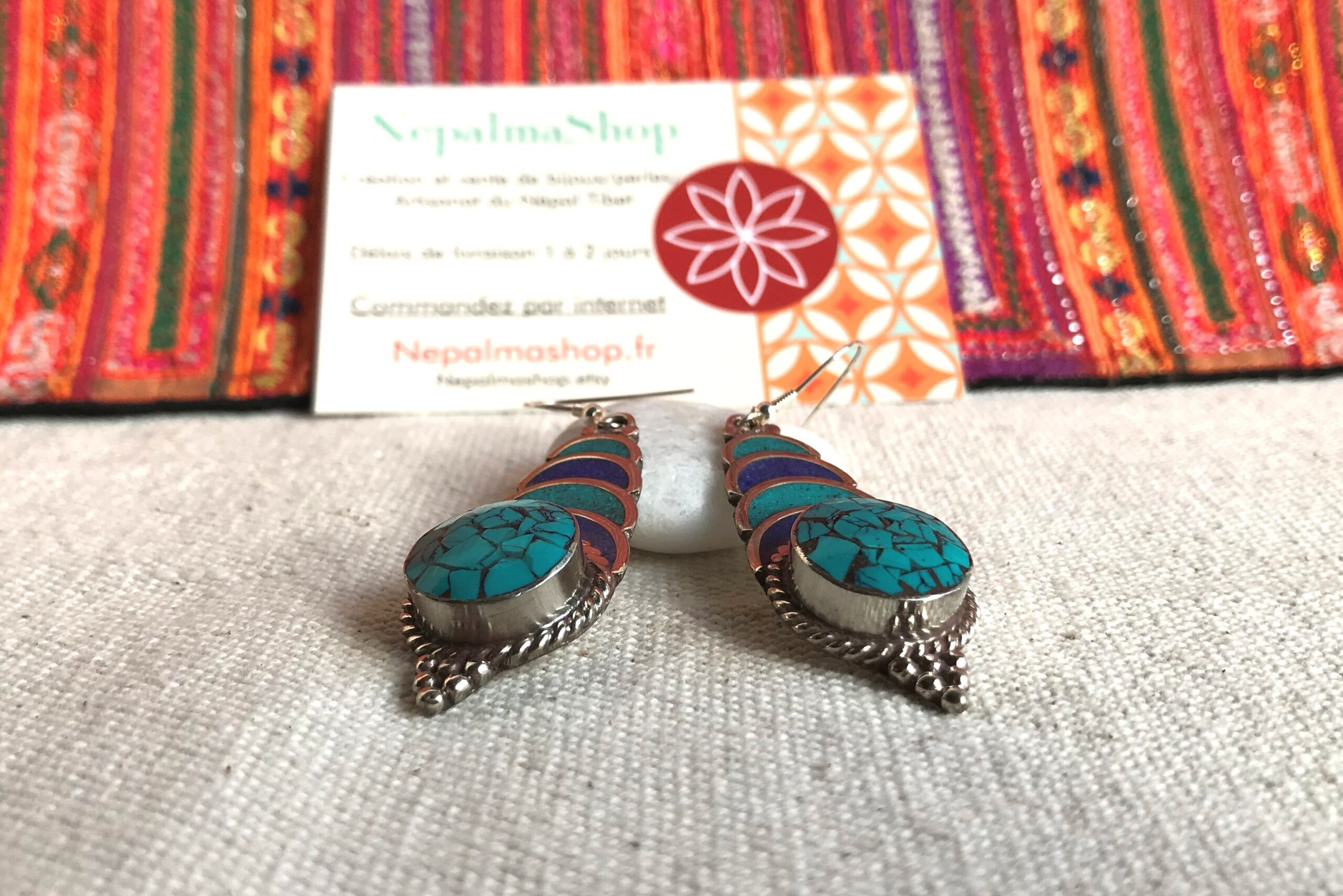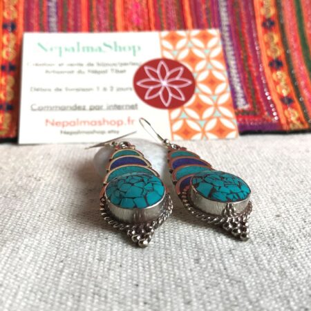 Boucles d’oreilles Tibétaines Népalaises-Bijoux du Monde Nature en Turquoise et Lapis Lazuli