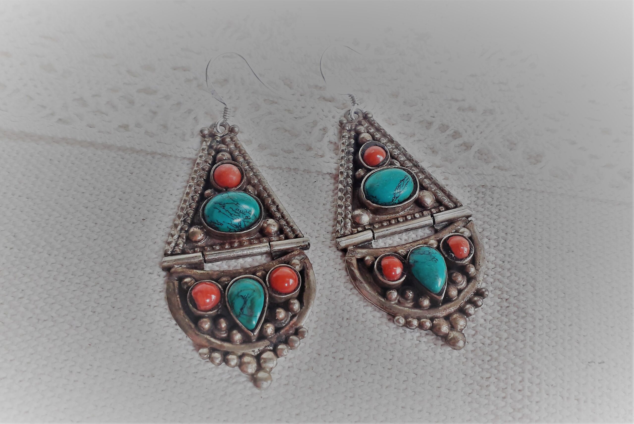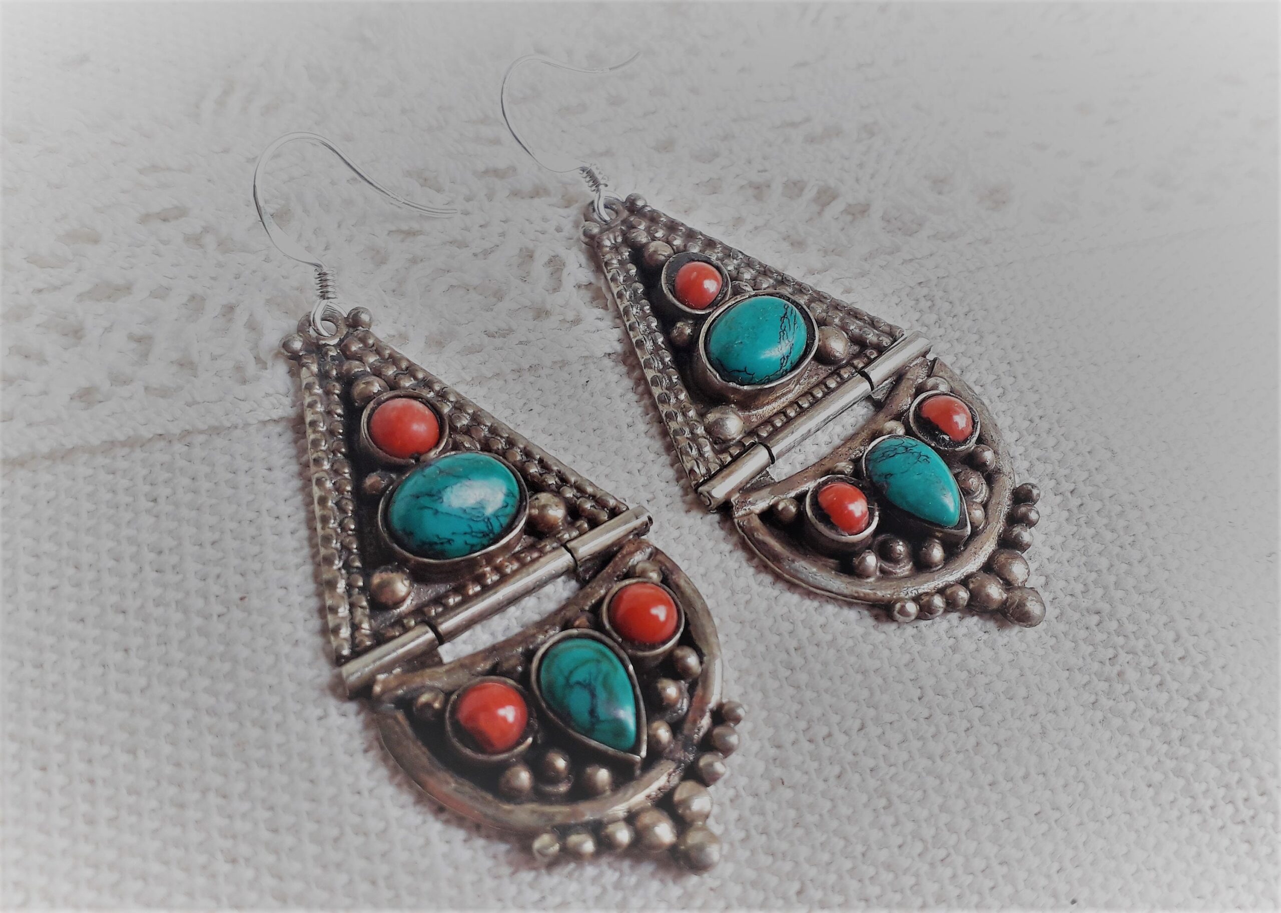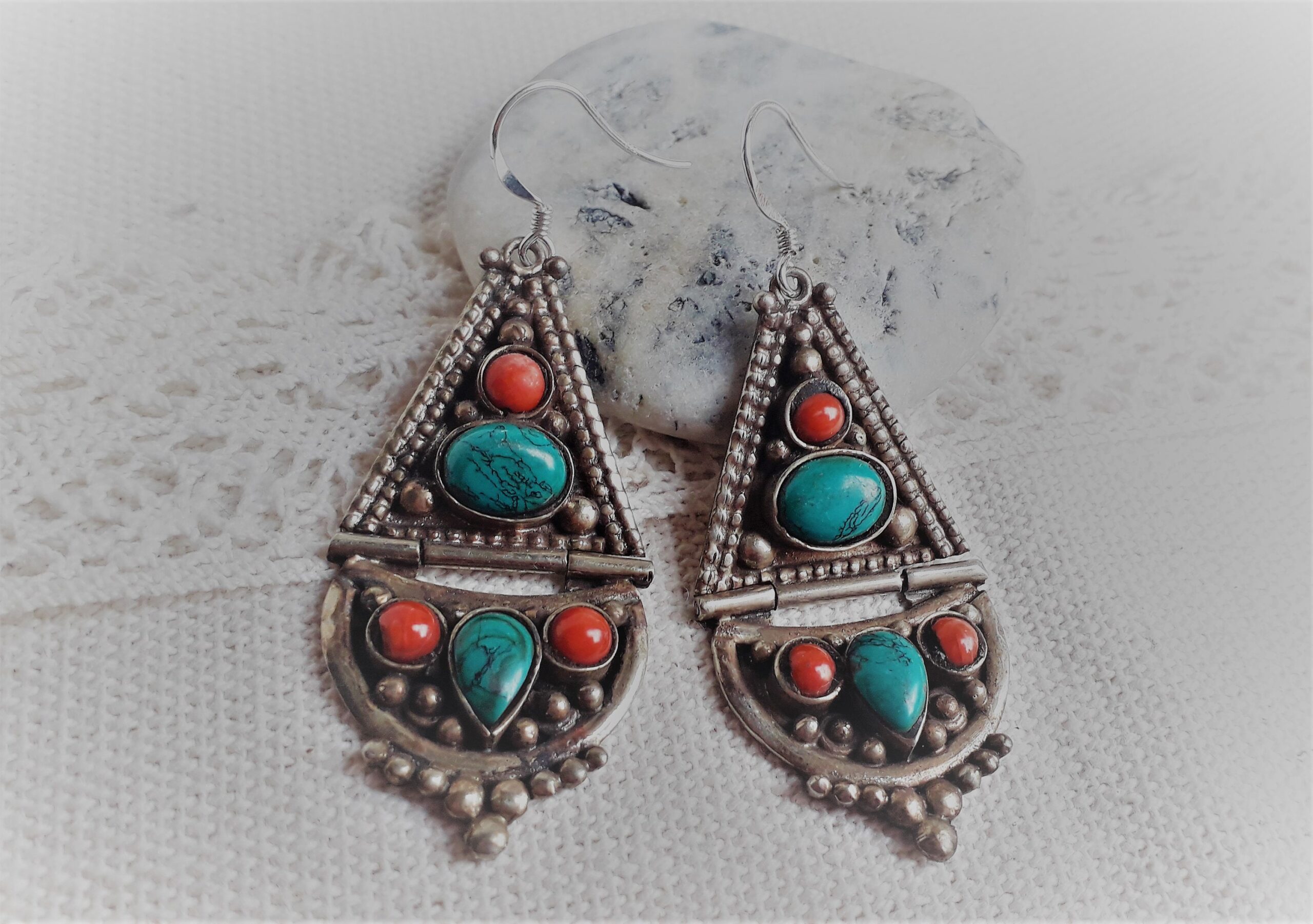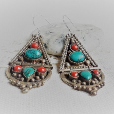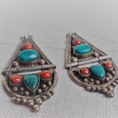 Une très belle paire de Grandes Boucles d’oreilles composée d’argent tibétain, de turquoise et de Corail.