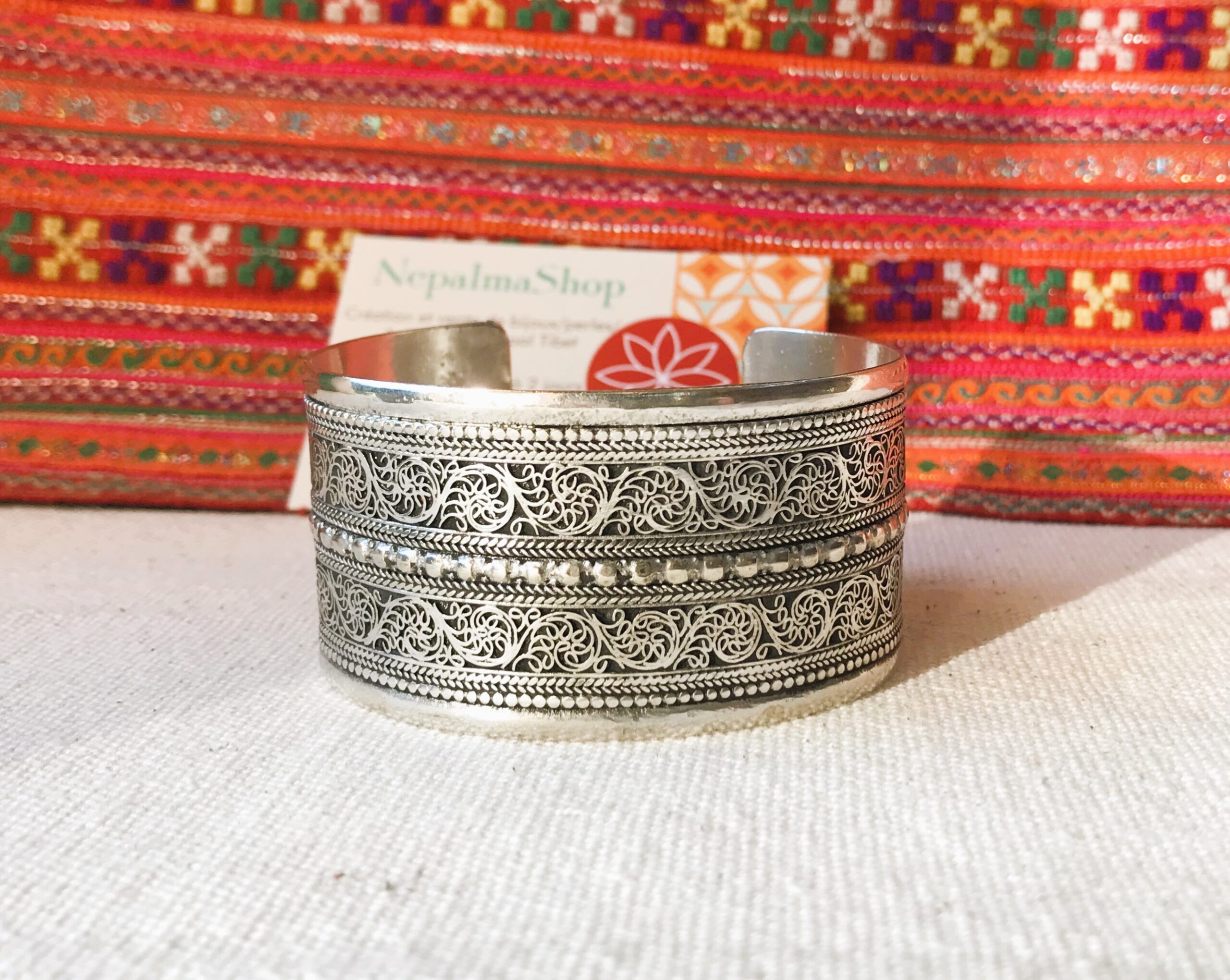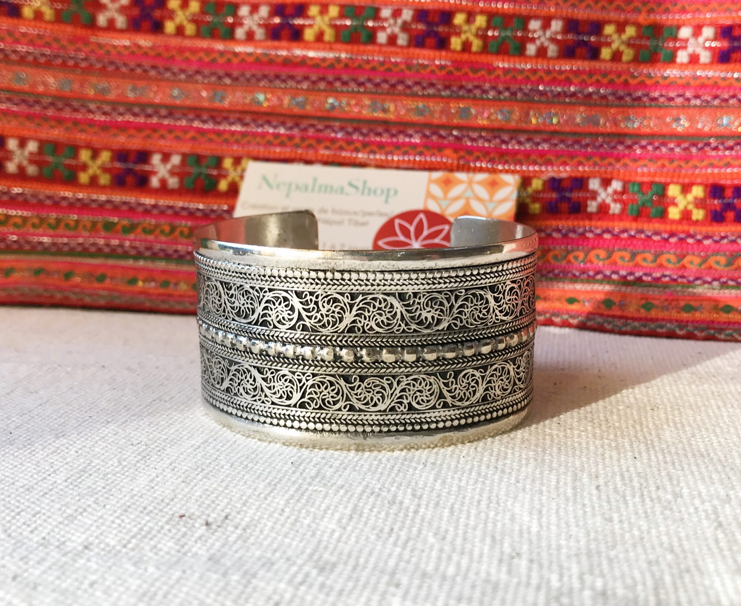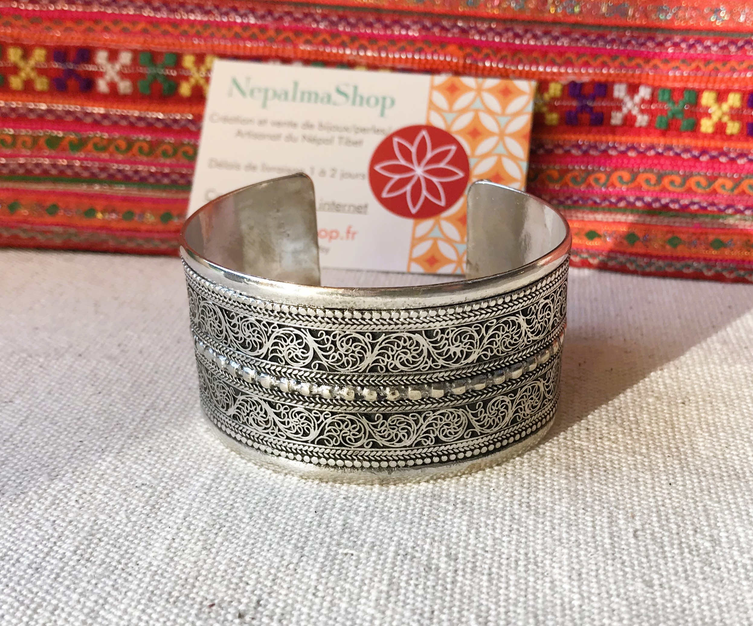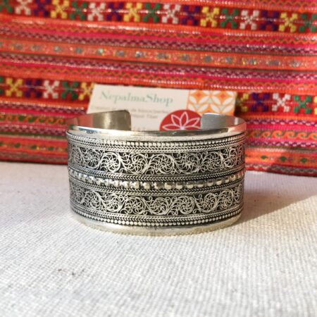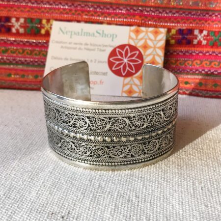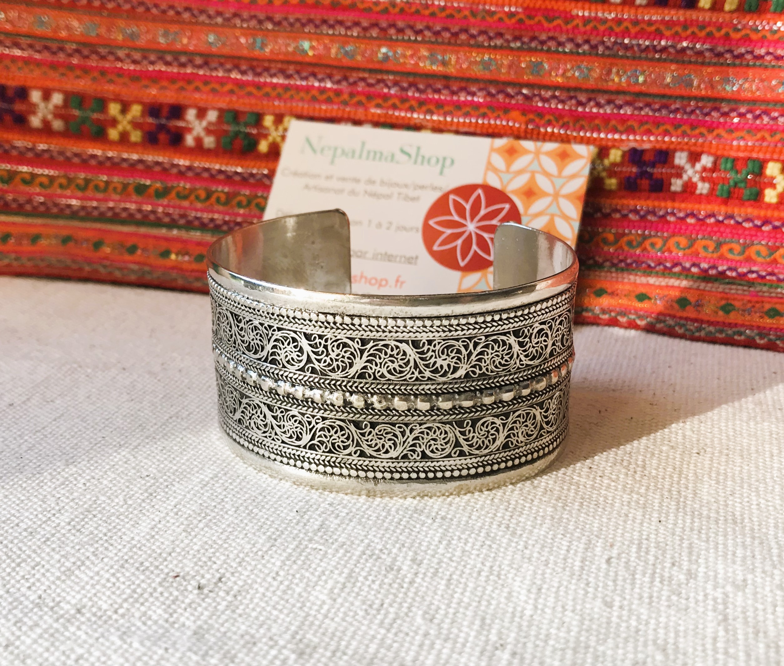 Magnifique bracelet manchette en argent tibétain, il est entièrement réalisé à la main, un travail d’une grande précision.