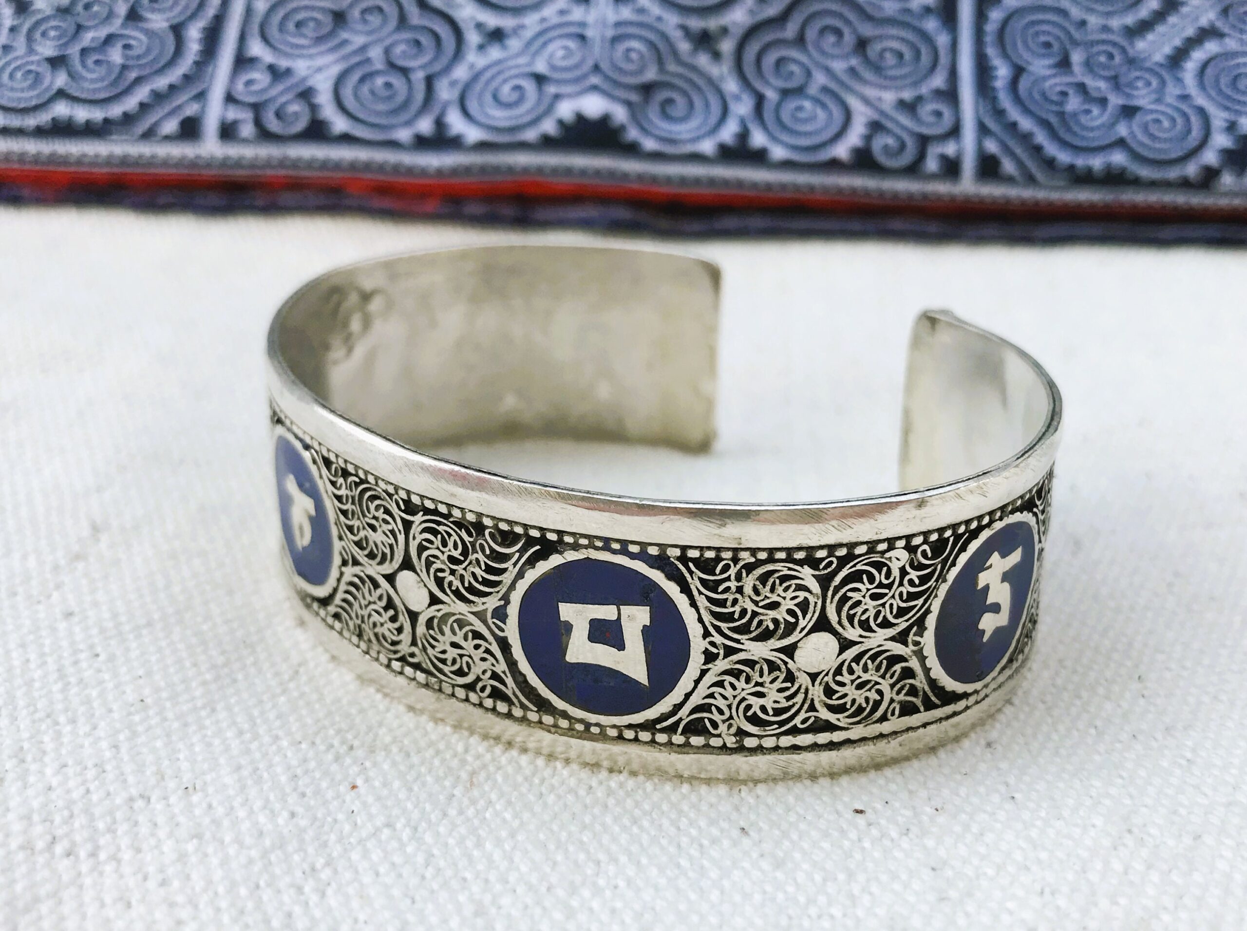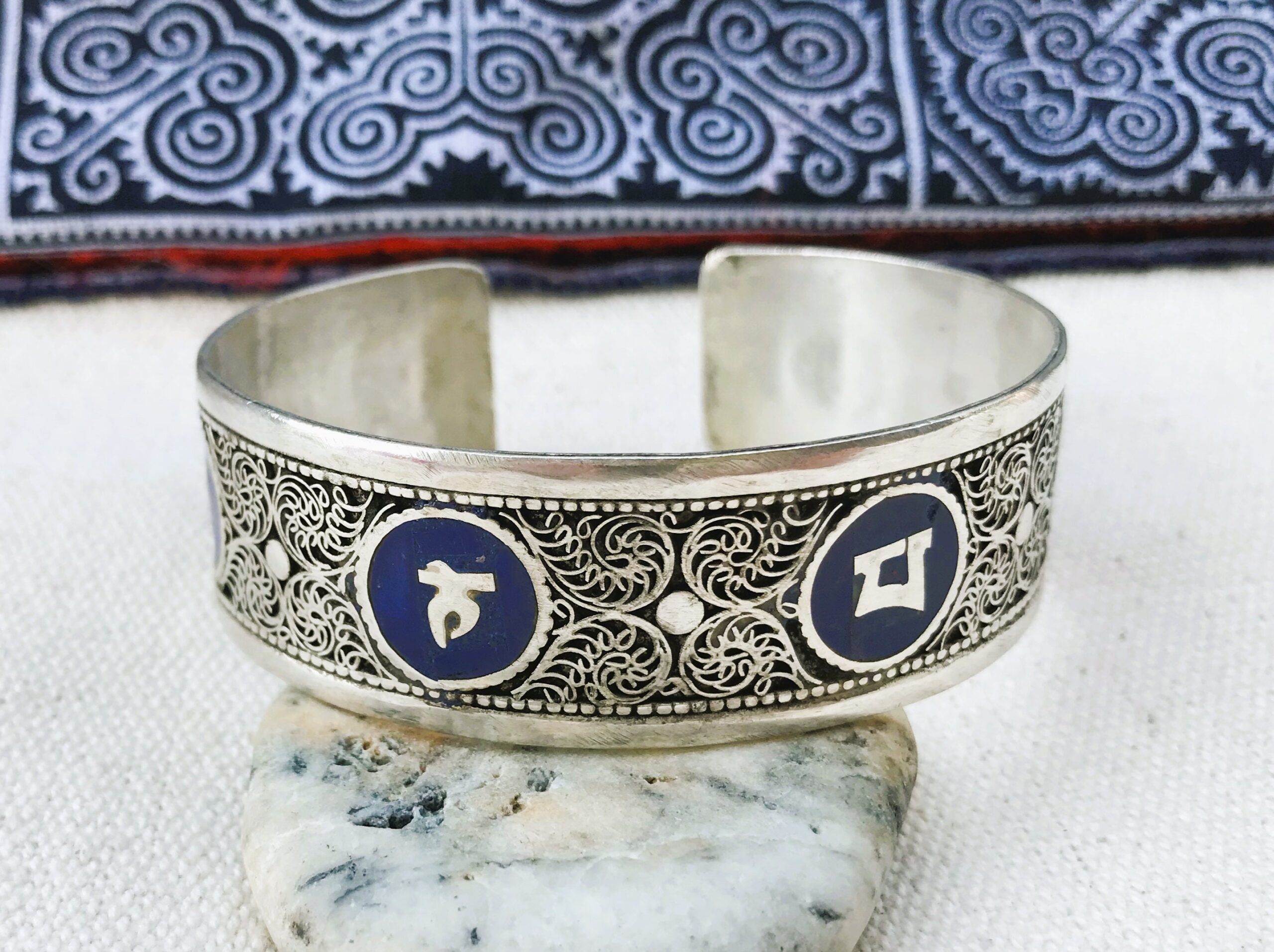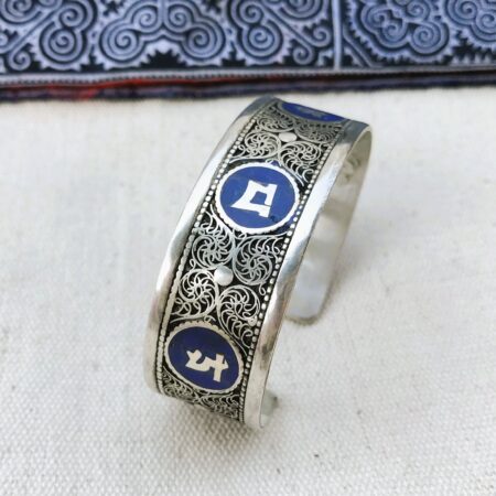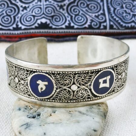 Un très beau bracelet manchette en argent tibétain (alliage : argent étain cuivre ) incrustée de Lapis Lazuli. Il est entièrement réalisé à la main, un travail d’une grande précision. Il s’adapte à toute taille de poignet.