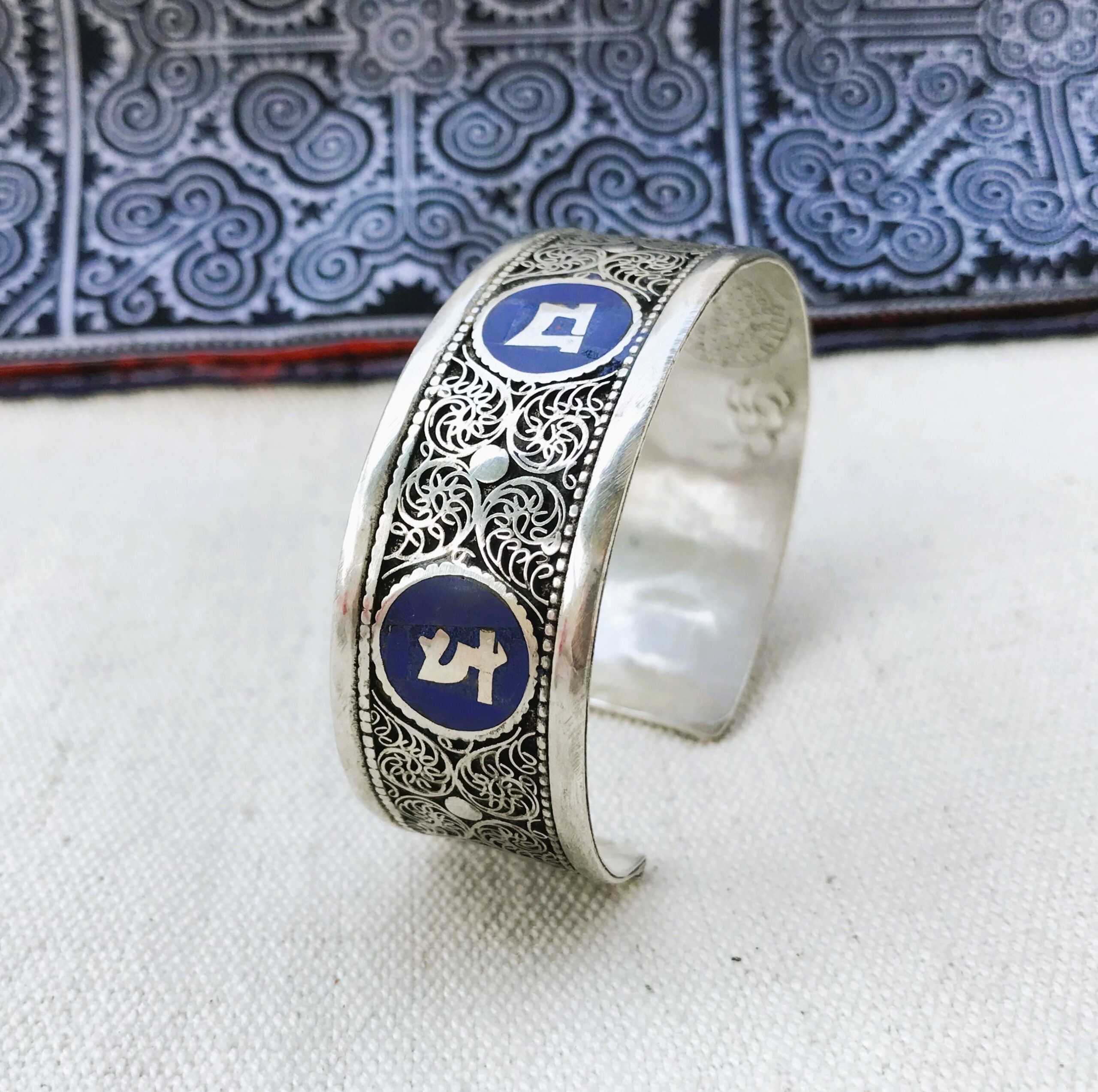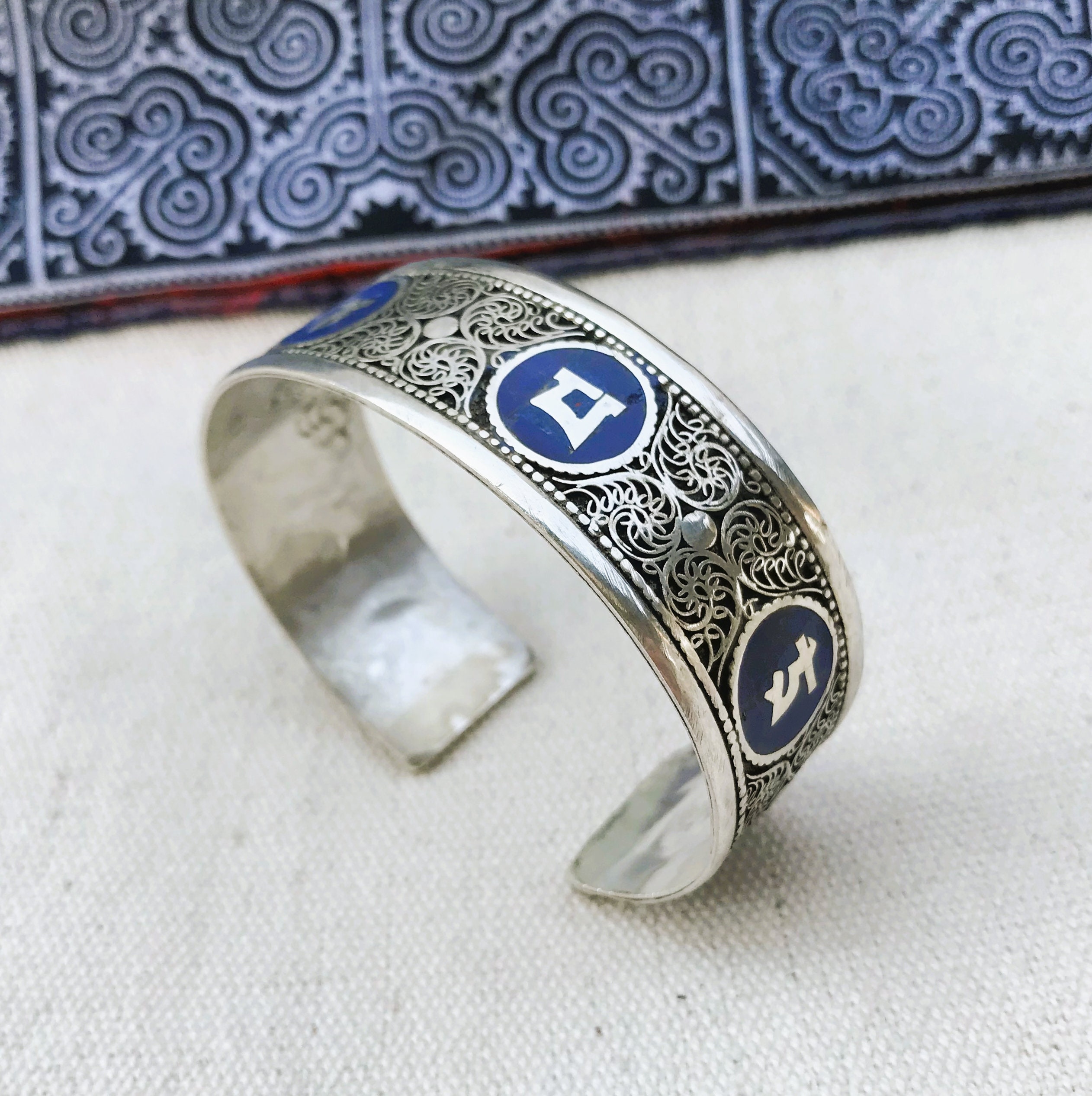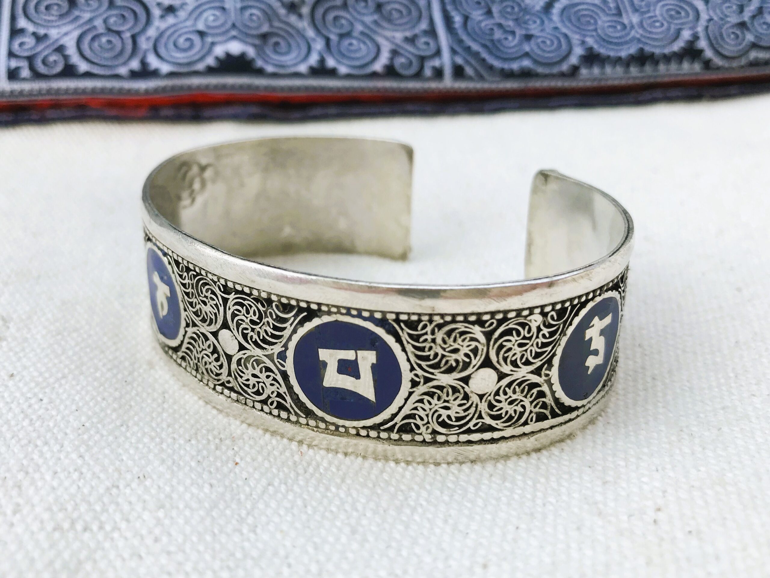 Un très beau bracelet manchette en argent tibétain (alliage : argent étain cuivre ) incrustée de Lapis Lazuli. Il est entièrement réalisé à la main, un travail d’une grande précision. Il s’adapte à toute taille de poignet.
