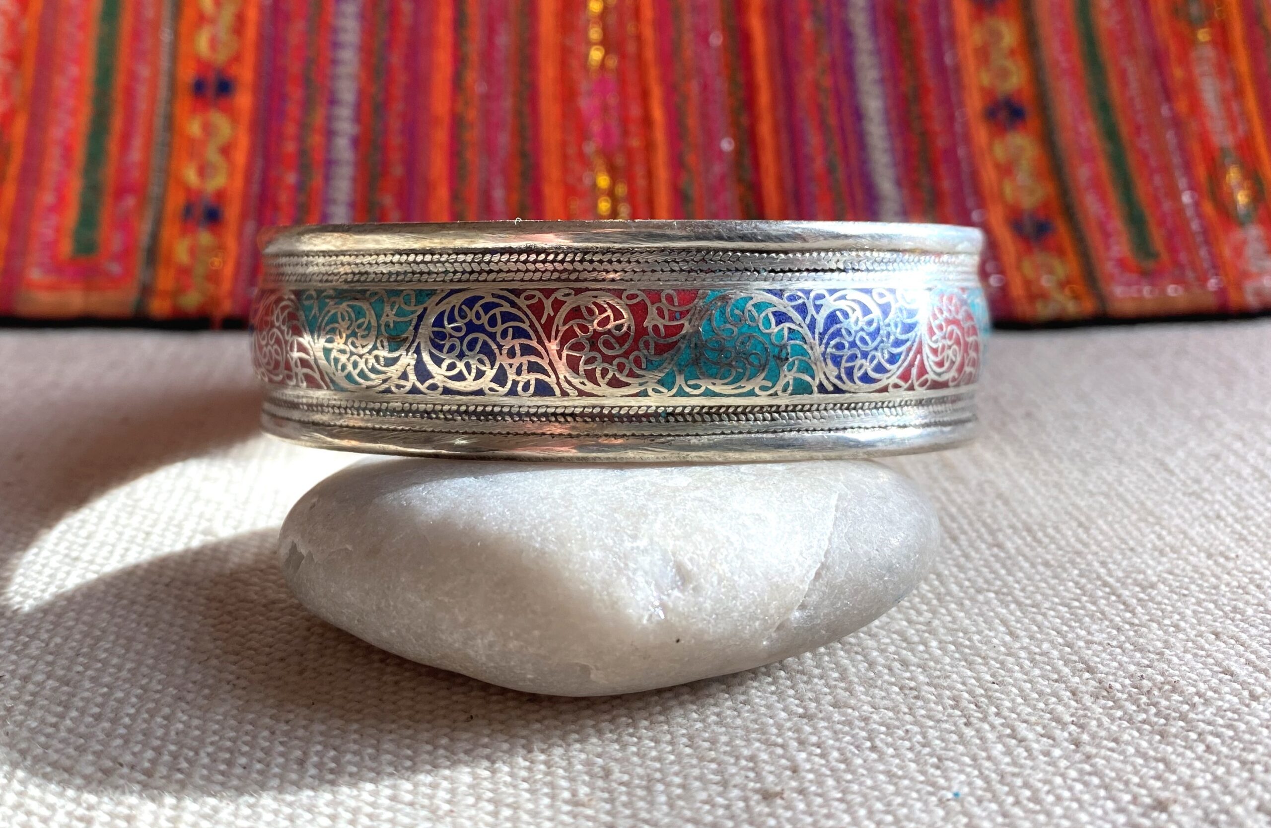 Un très beau bracelet manchette en argent tibétain, en Turquoise, Lapis Lazuli et Corail.