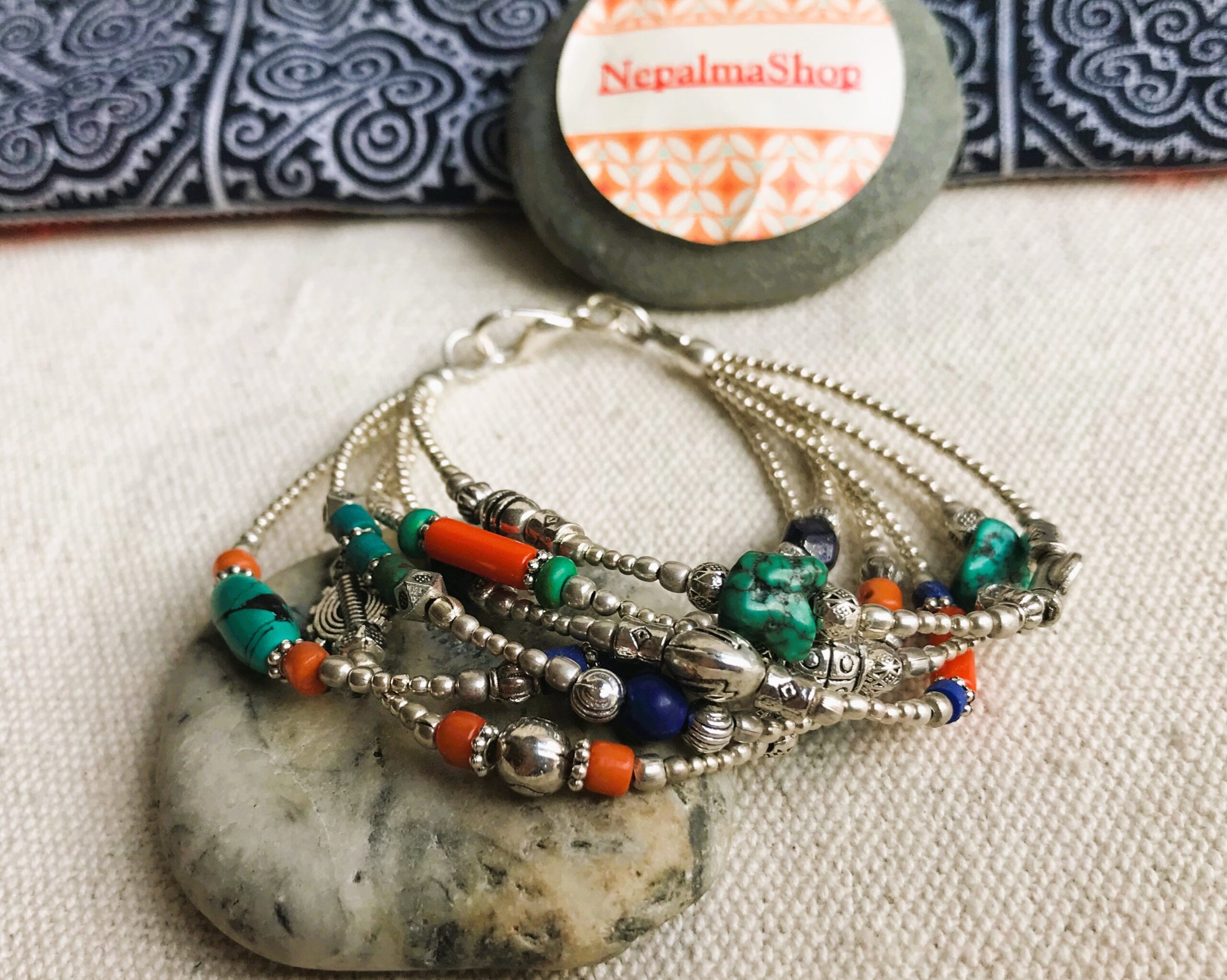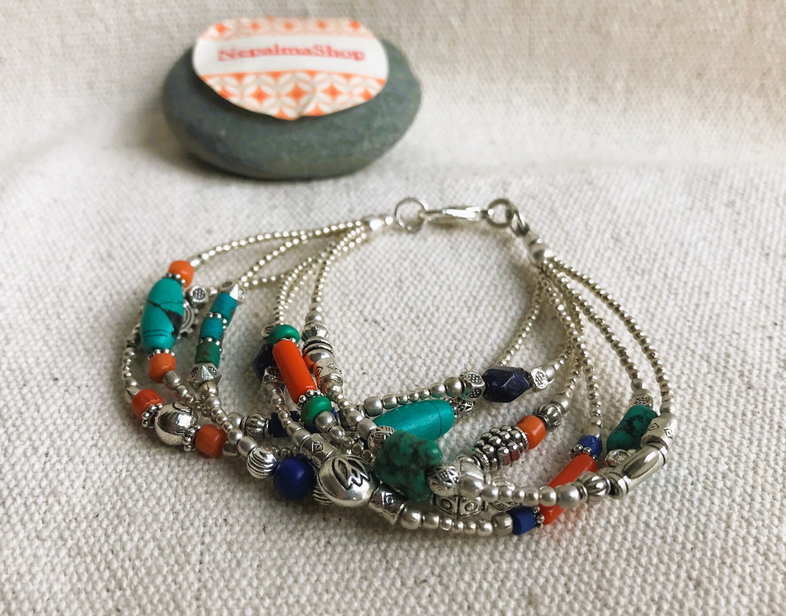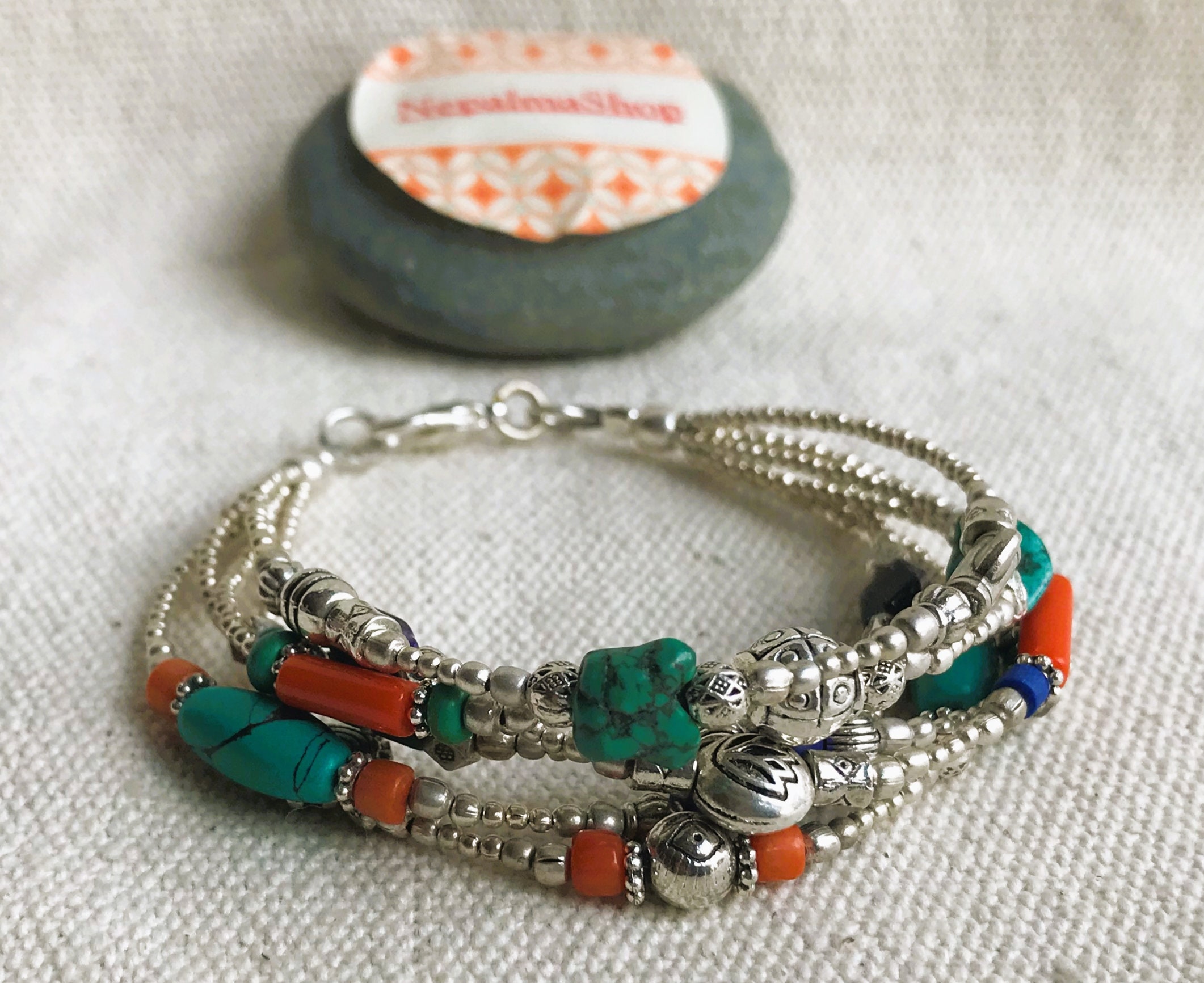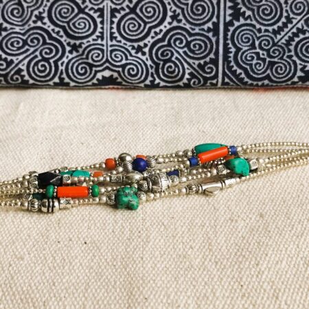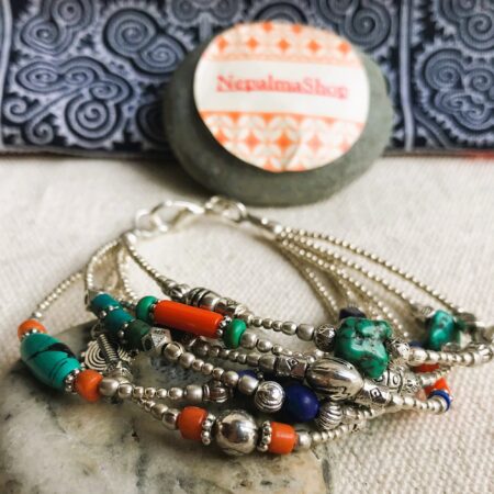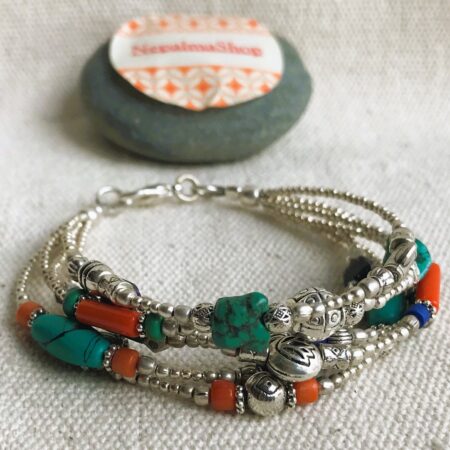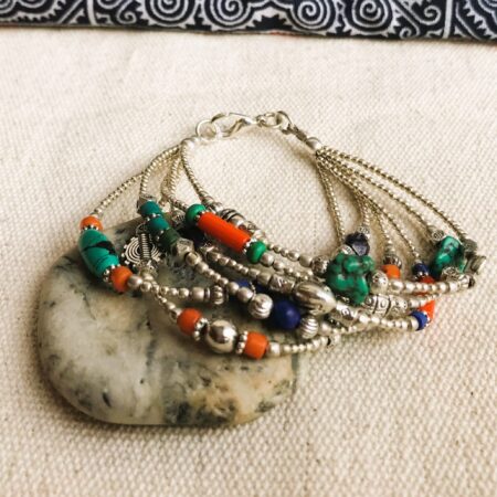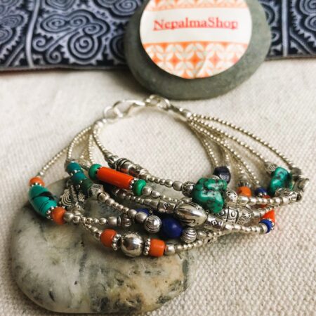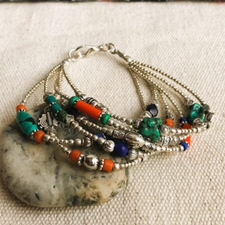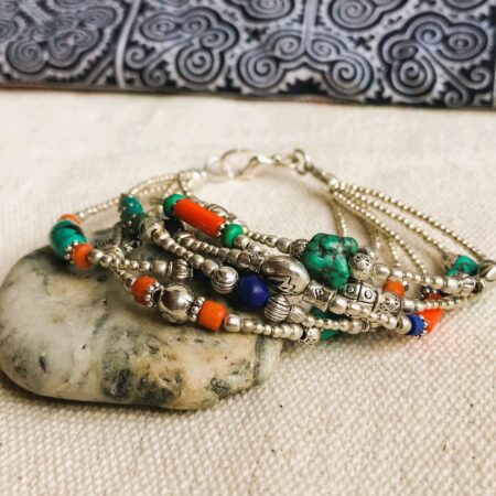 Ce charmant bracelet multi-rangs est composé d’argent tibétain ainsi que de plusieurs pierres différentes Turquoise, Corail et Lapis Lazuli. Bracelet Ethnique !