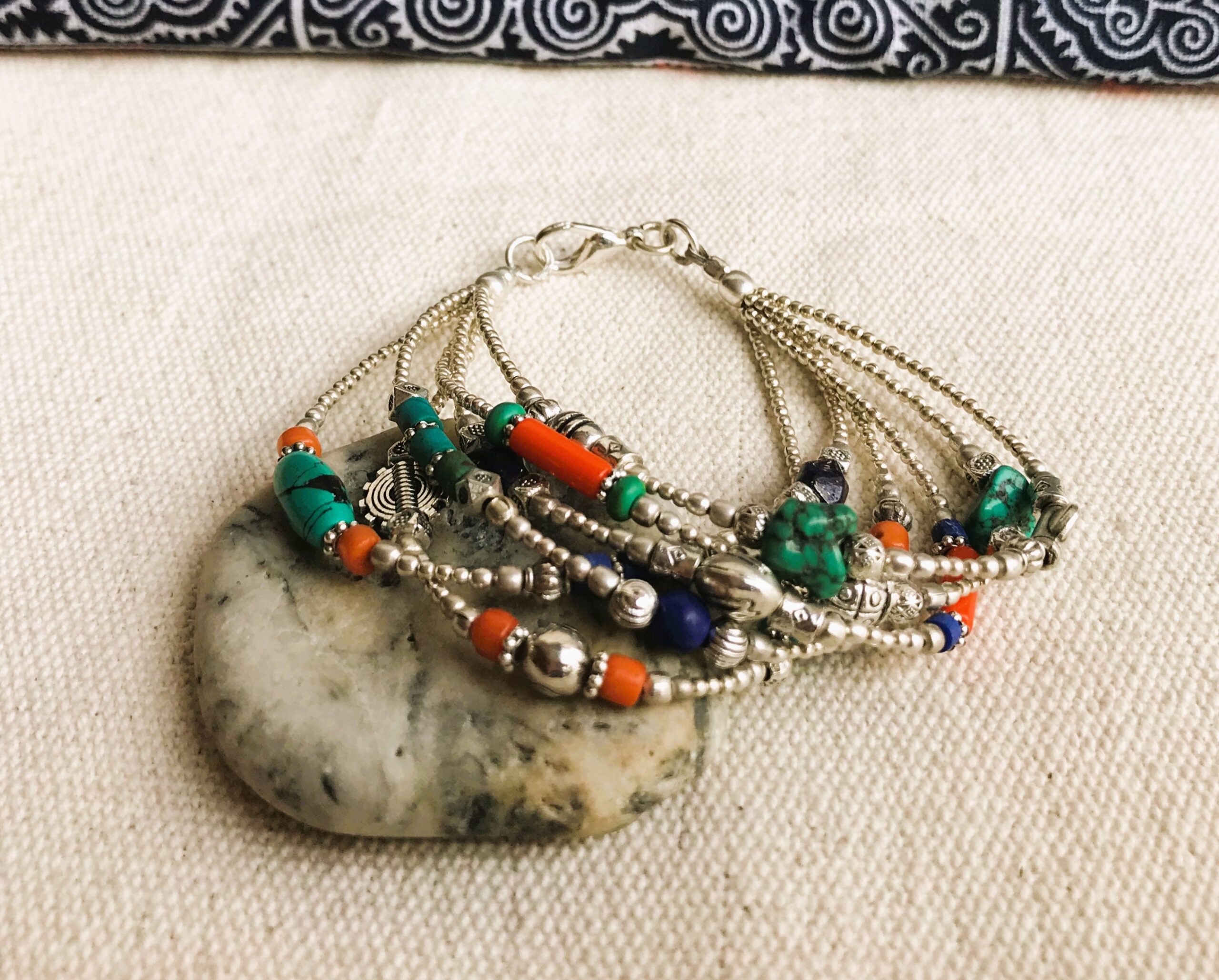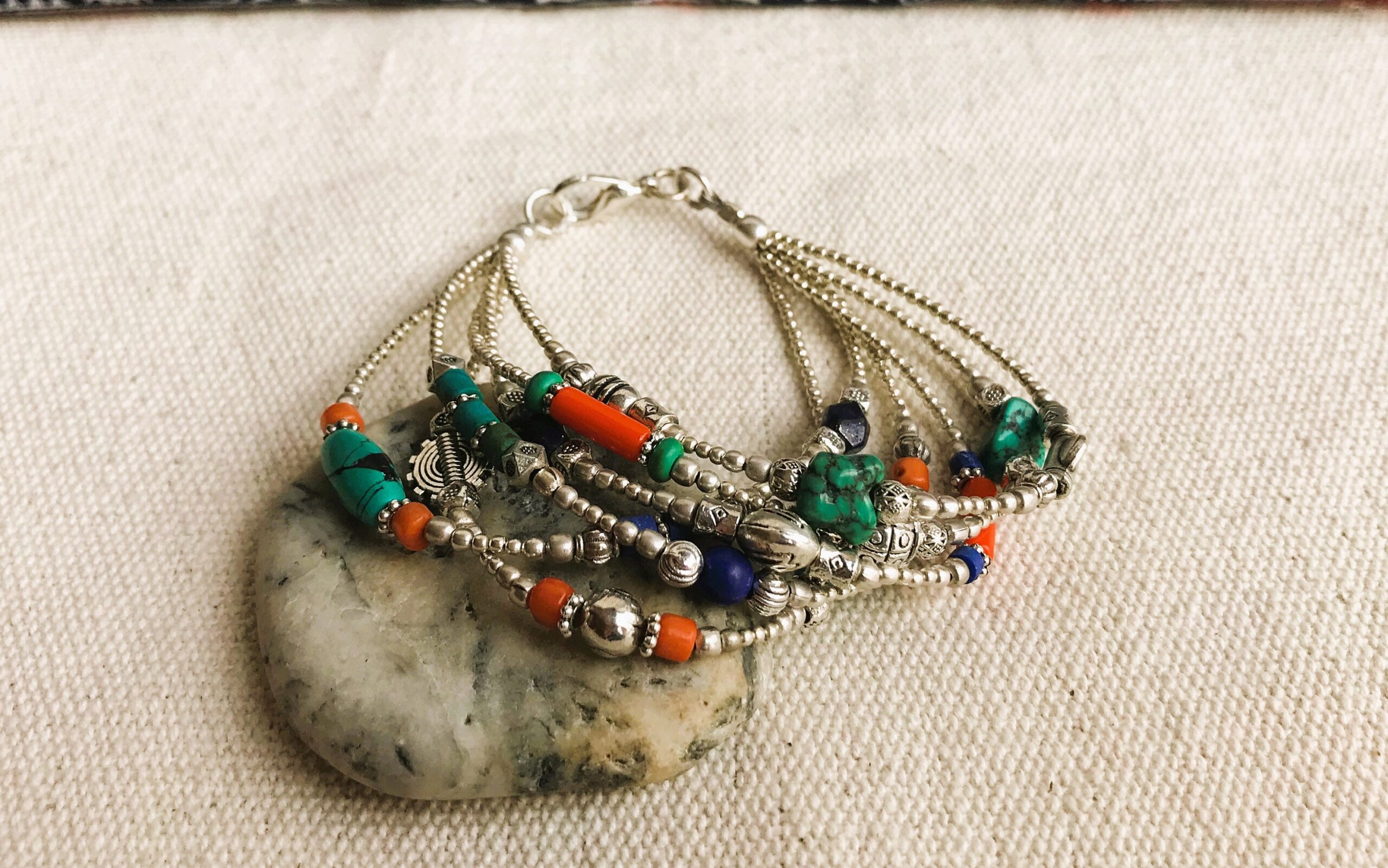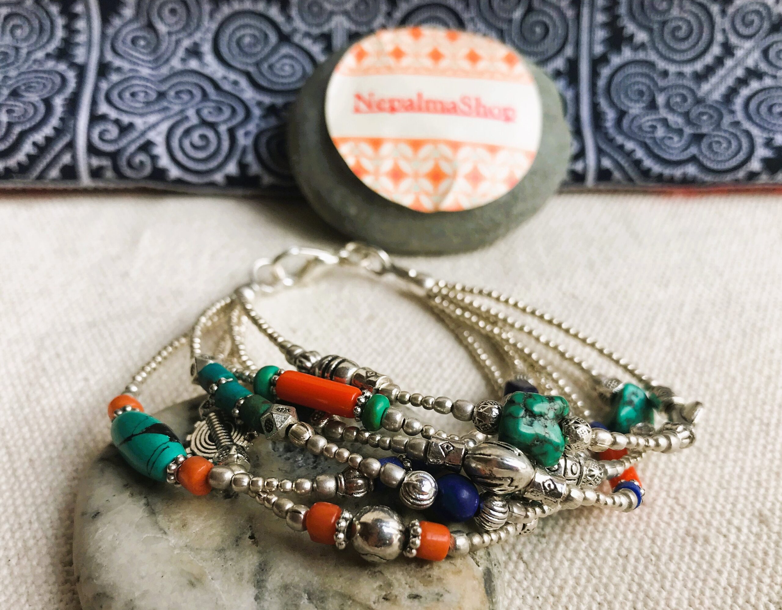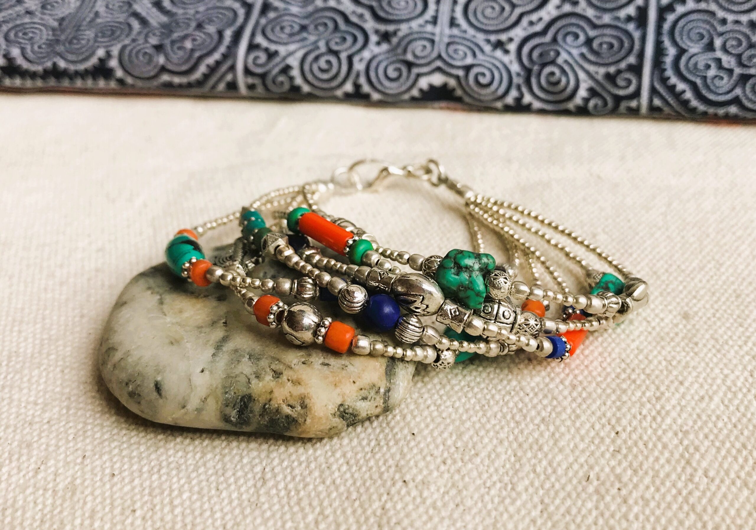 Ce charmant bracelet multi-rangs est composé d’argent tibétain ainsi que de plusieurs pierres différentes Turquoise, Corail et Lapis Lazuli. Bracelet Ethnique !