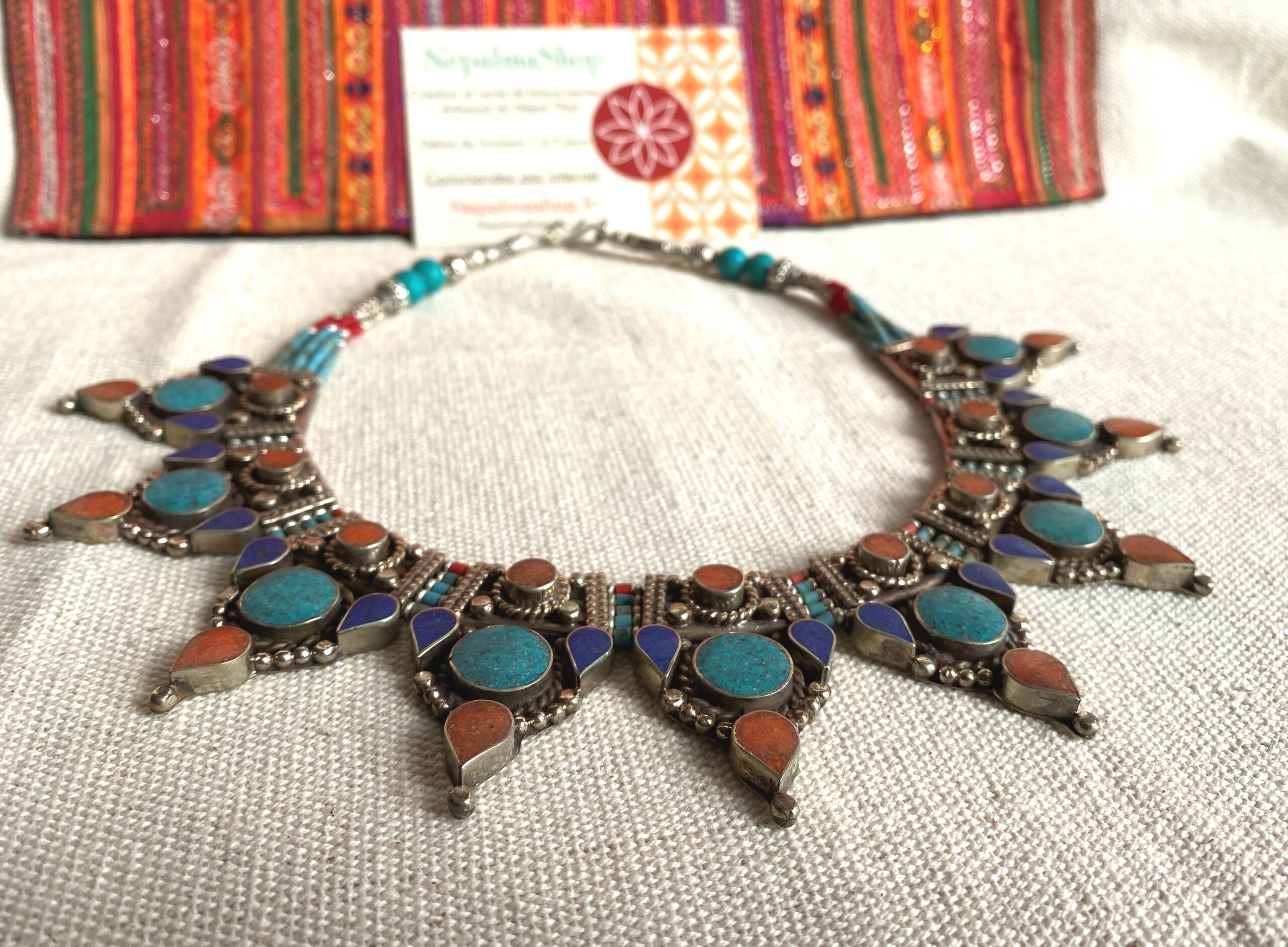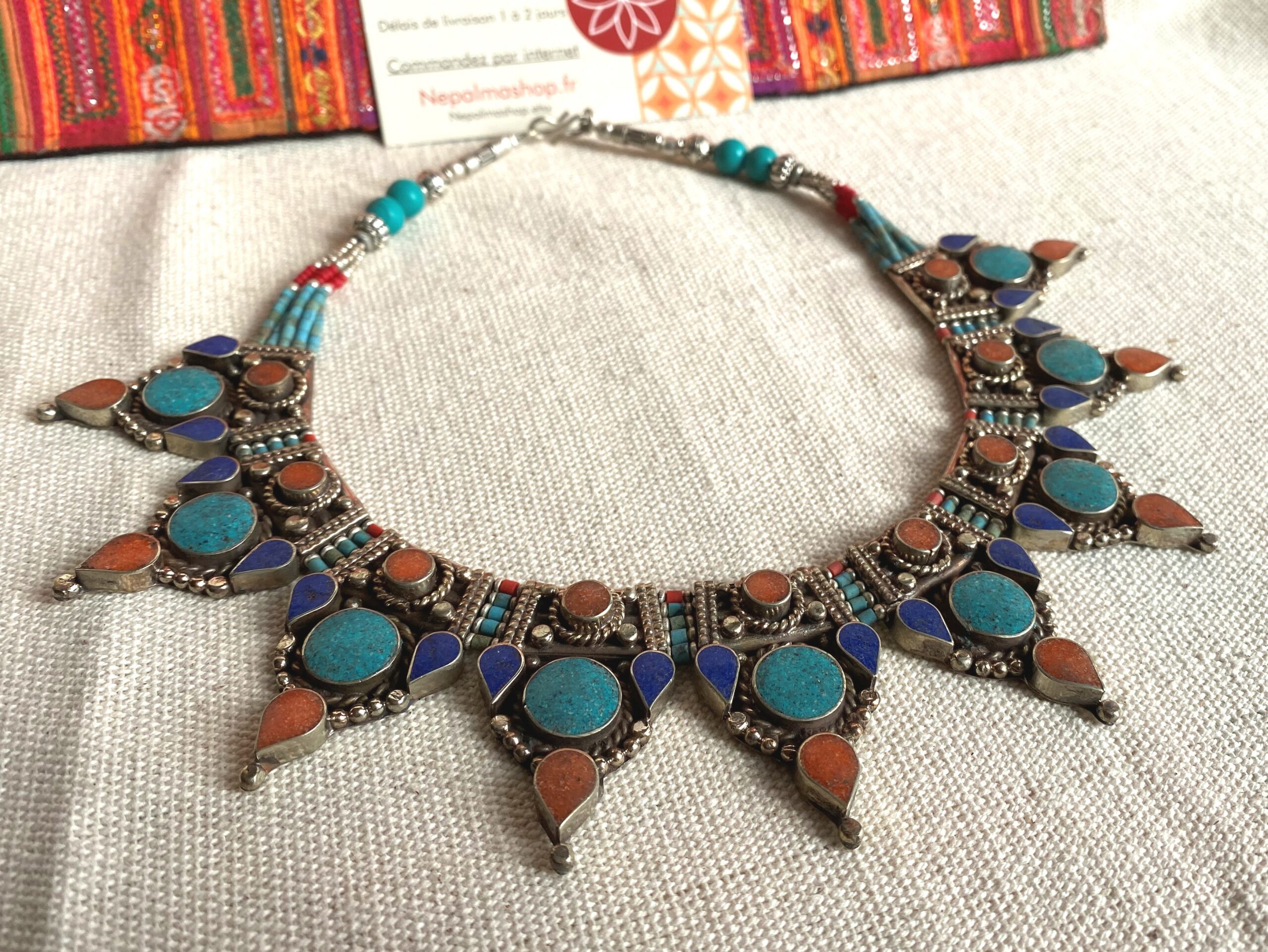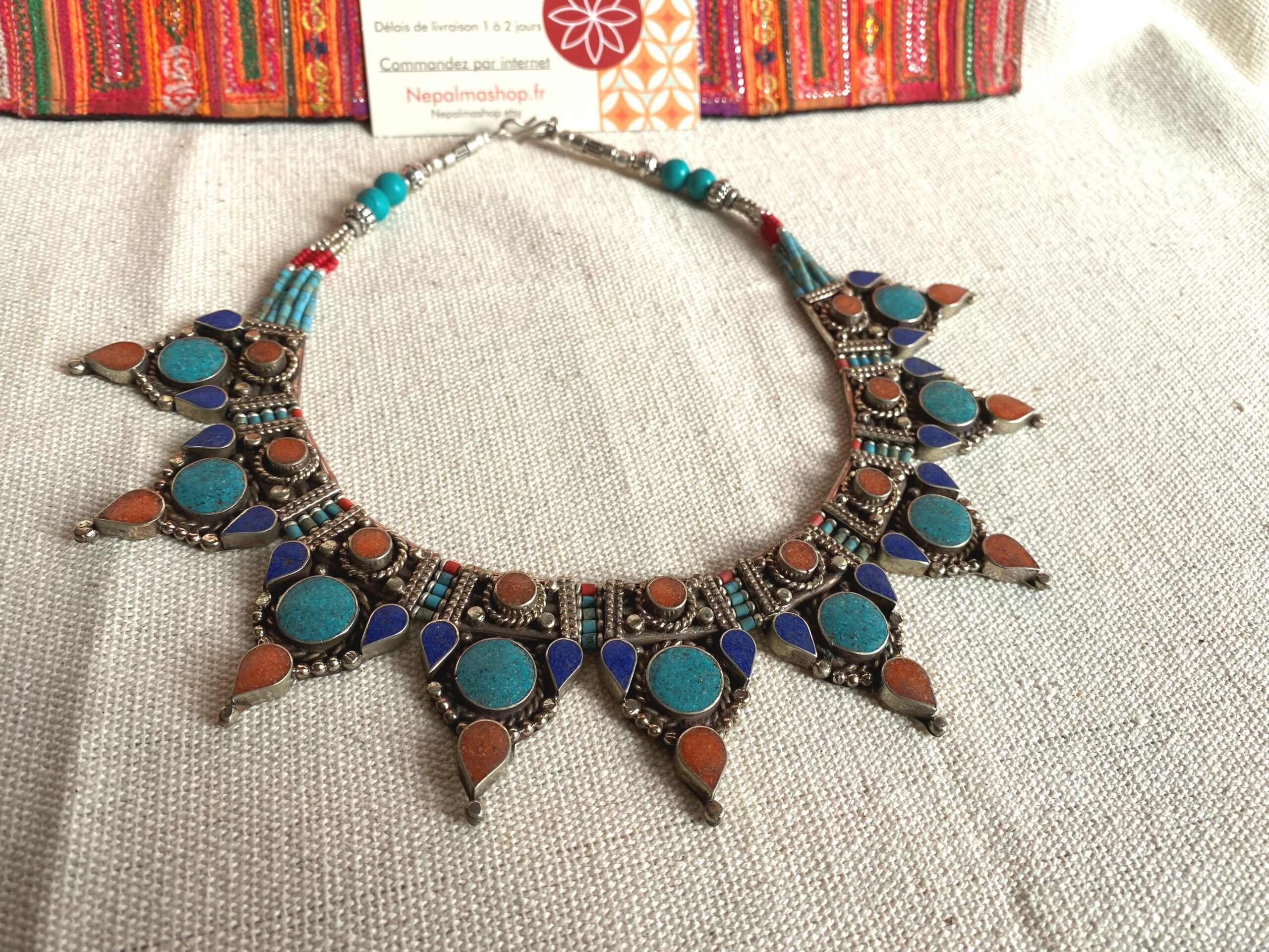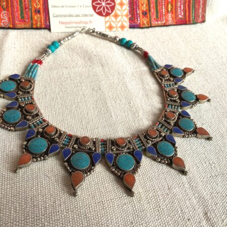 Voici un très beau collier plastron entièrement réalisé à base de pierres Turquoise, de Corail et de Lapis Lazuli. C’est un collier très élégant, il a été crée grâce au design de bijoux traditionnels tibétains.