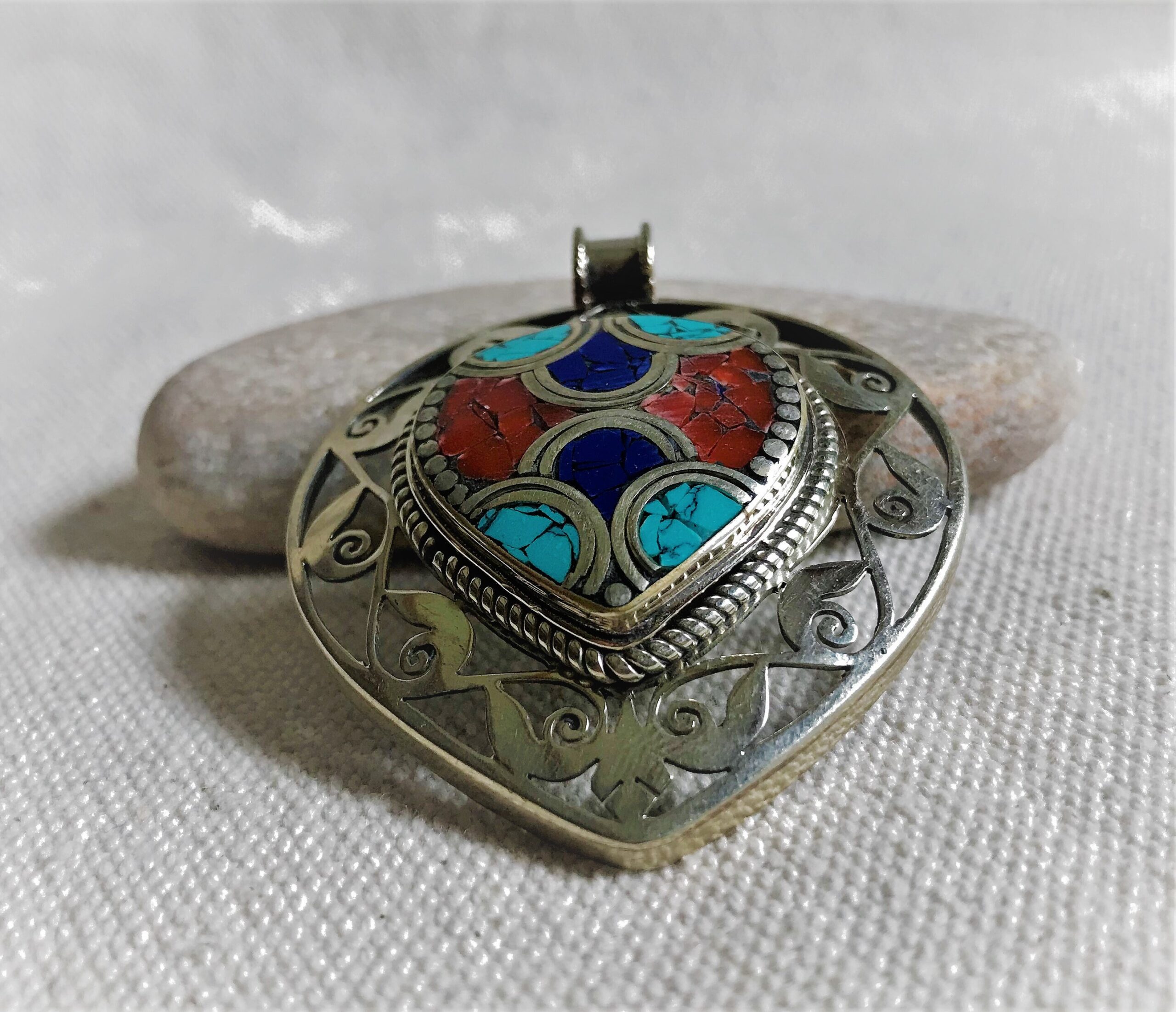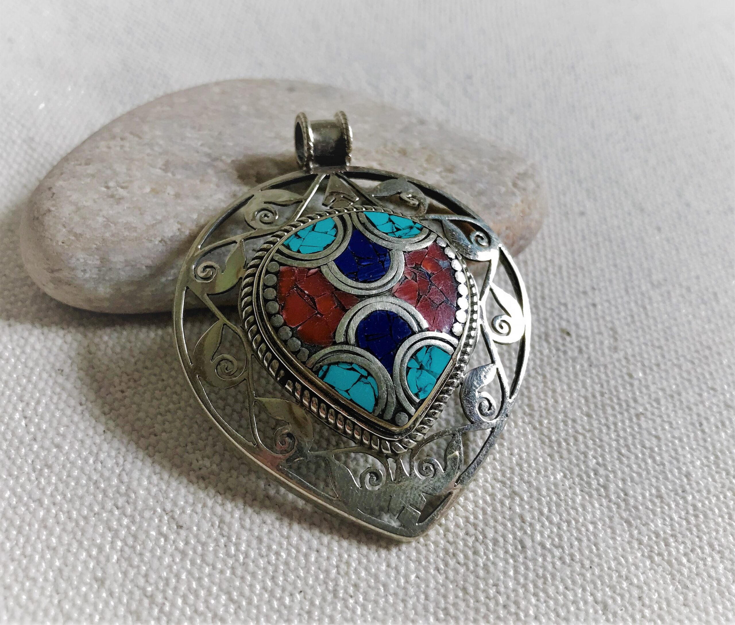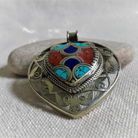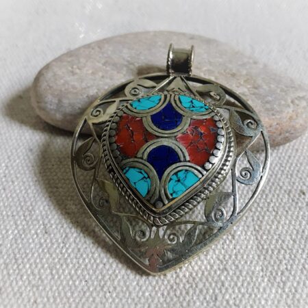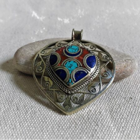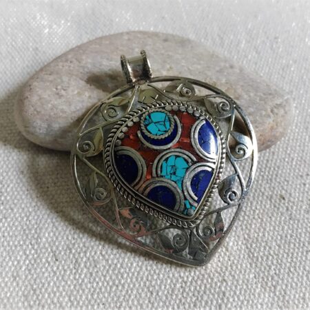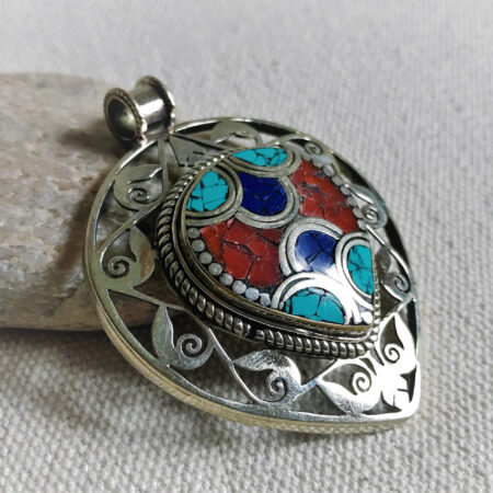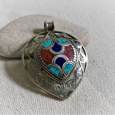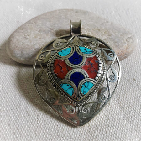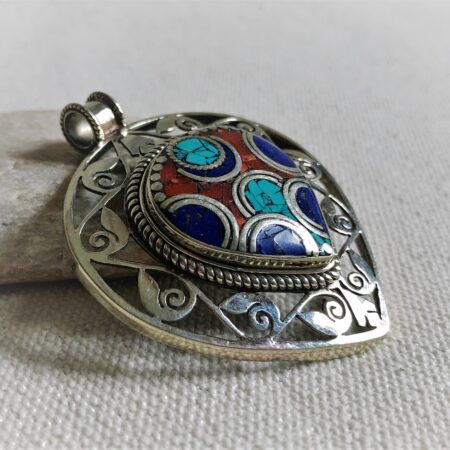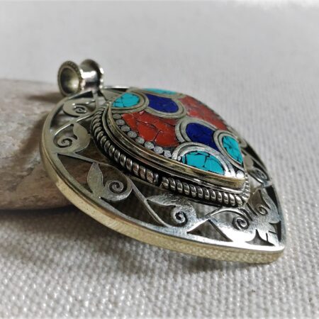 Un très beau et grand pendentif ciselé ethnique accompagné, il est composé d’argent tibétain et de pierres Turquoise,Lapis Lazuli et Corail.