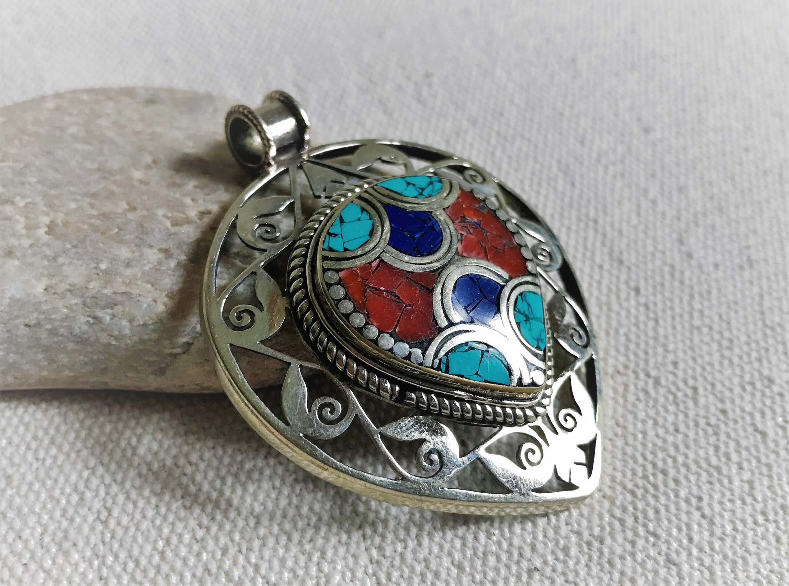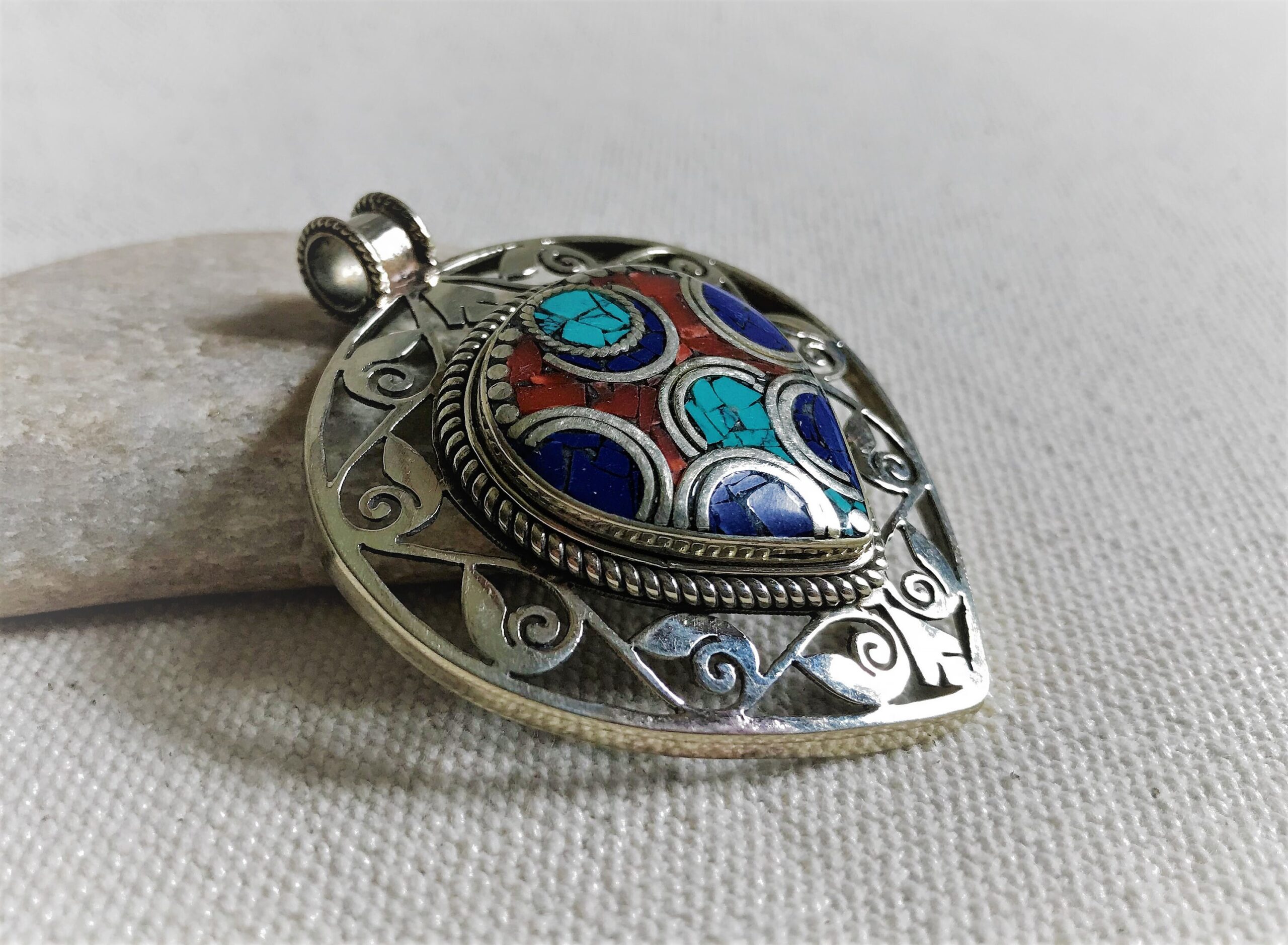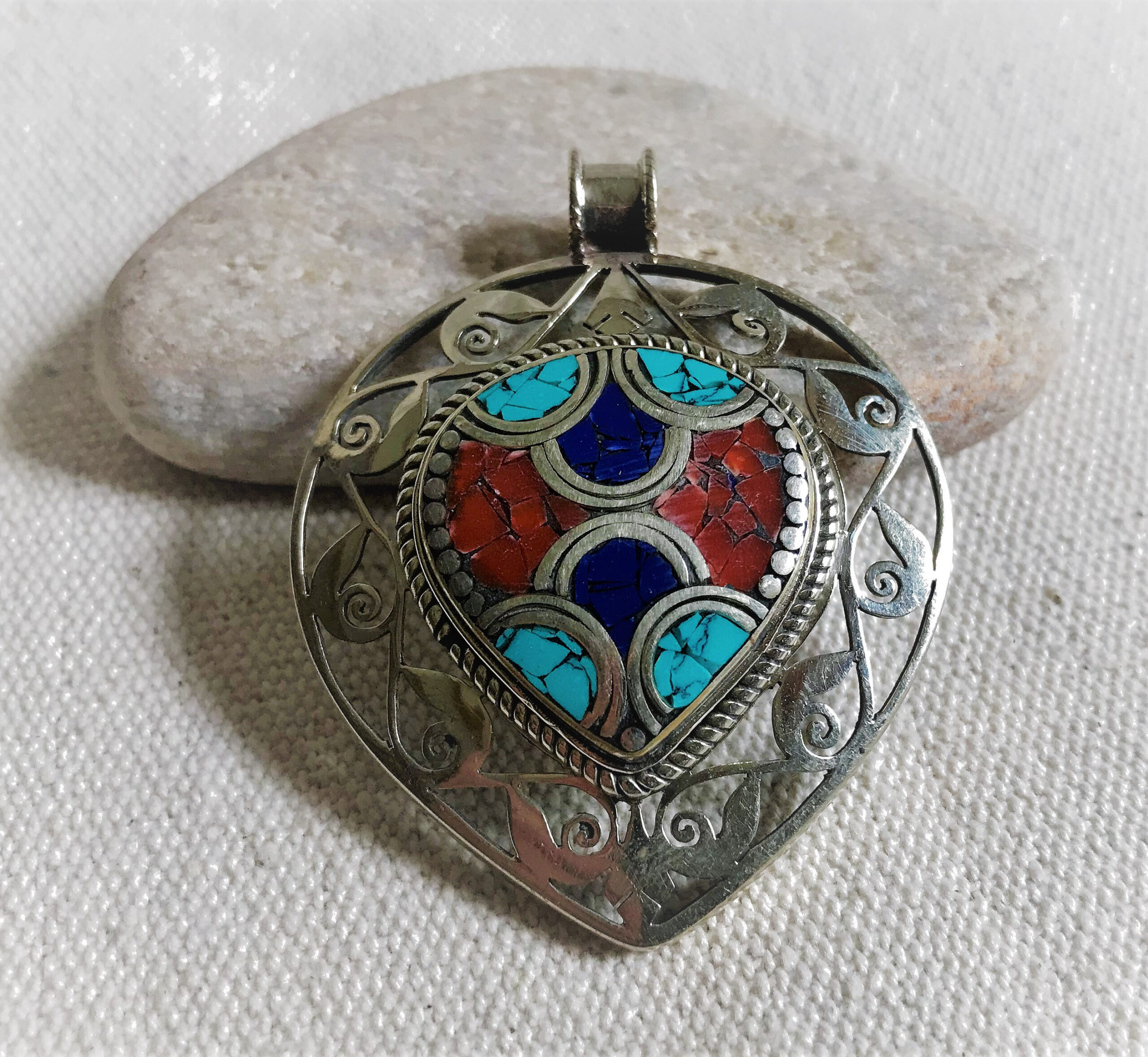 Un très beau et grand pendentif ciselé ethnique accompagné, il est composé d’argent tibétain et de pierres Turquoise,Lapis Lazuli et Corail.