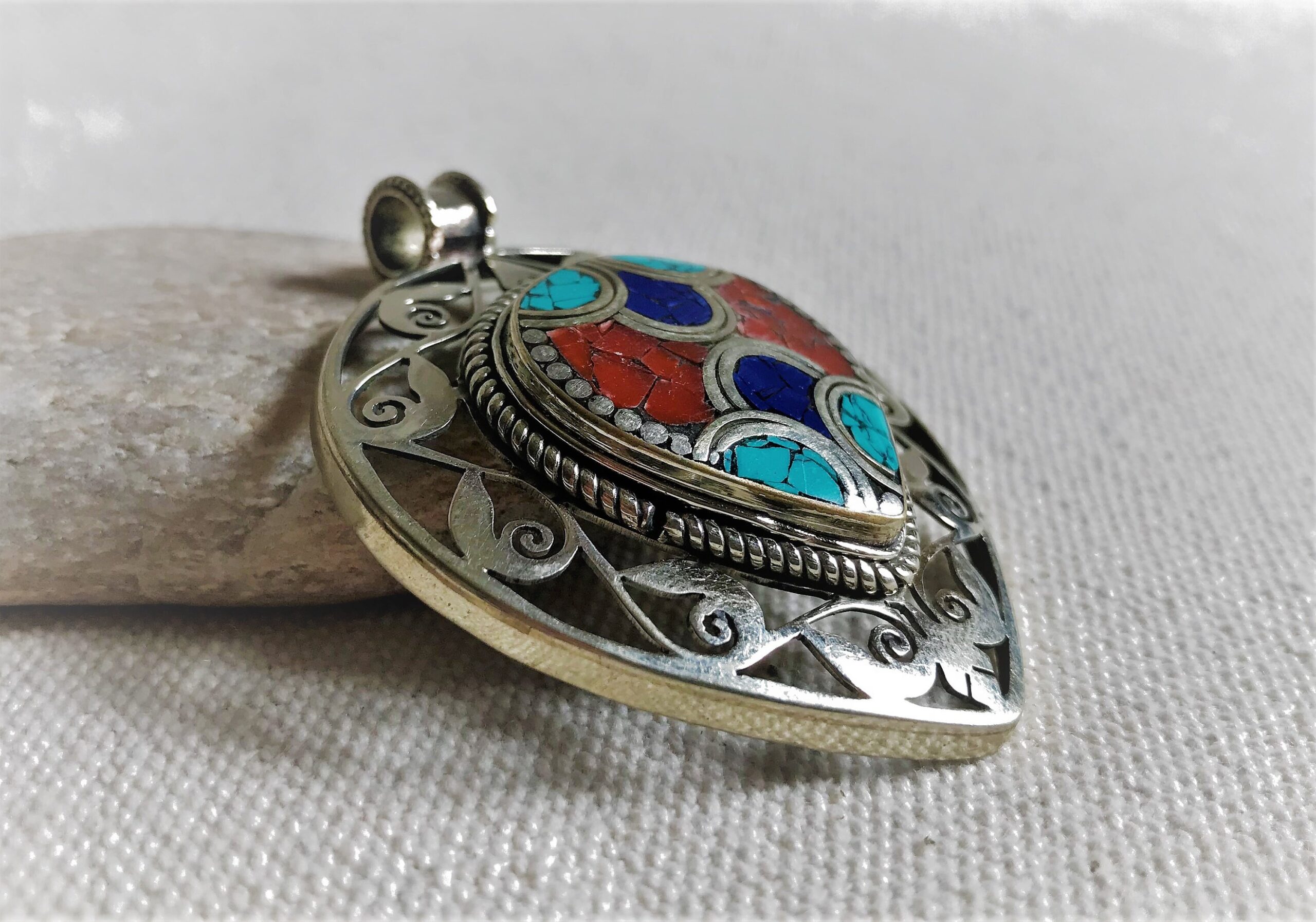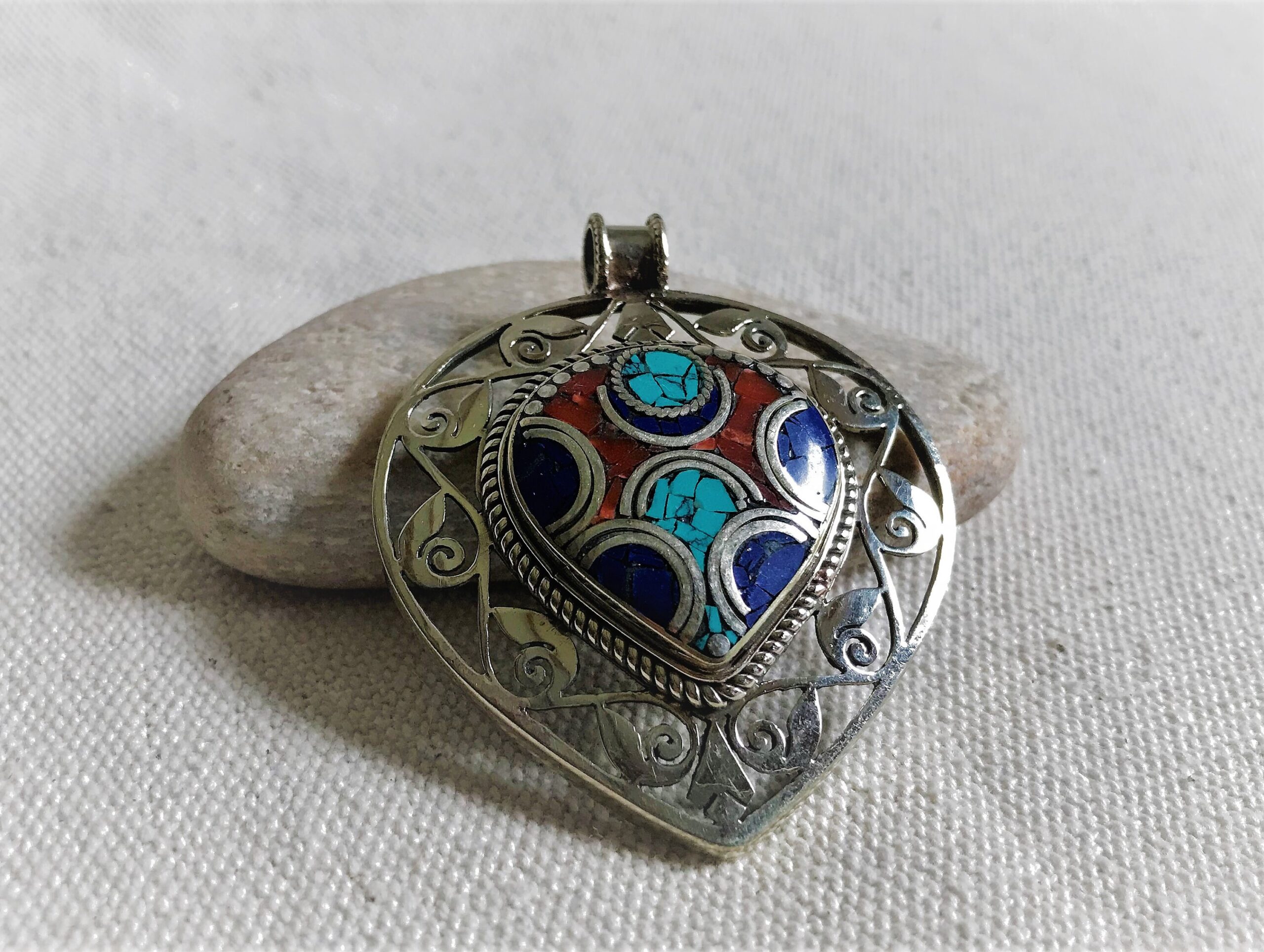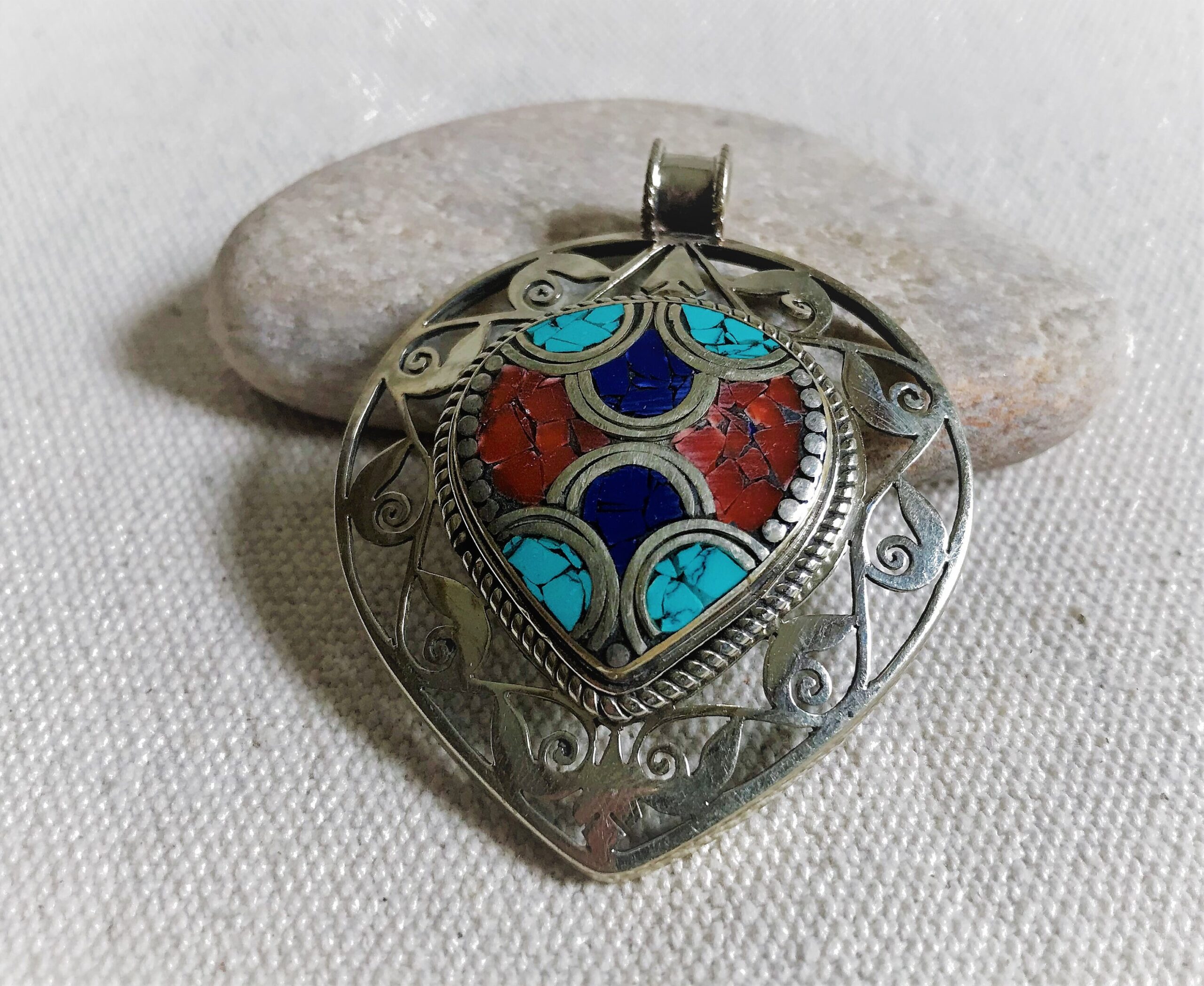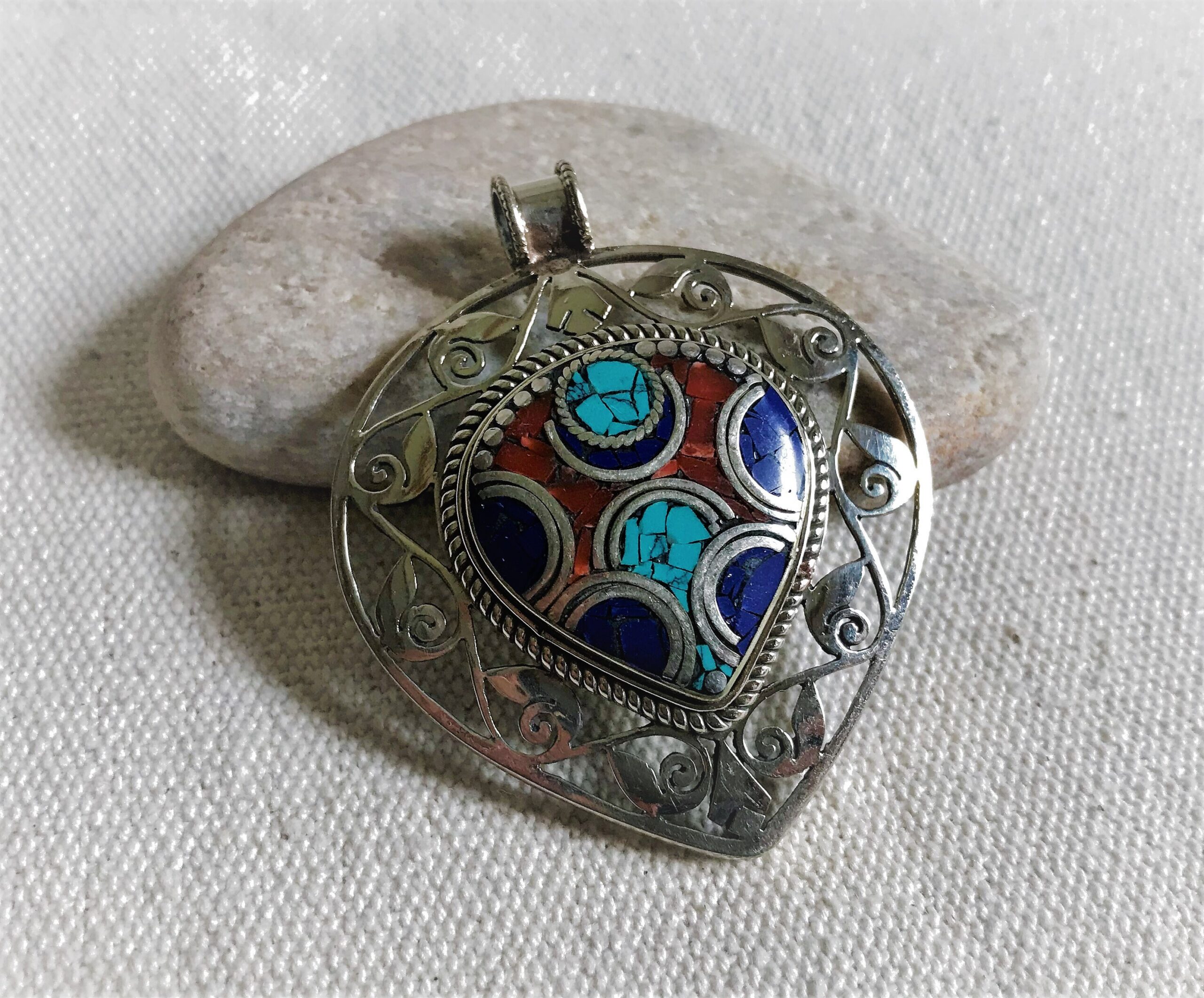 Un très beau et grand pendentif ciselé ethnique accompagné, il est composé d’argent tibétain et de pierres Turquoise,Lapis Lazuli et Corail.