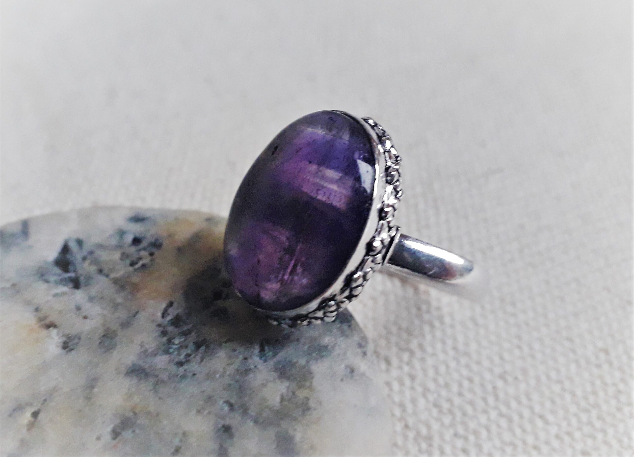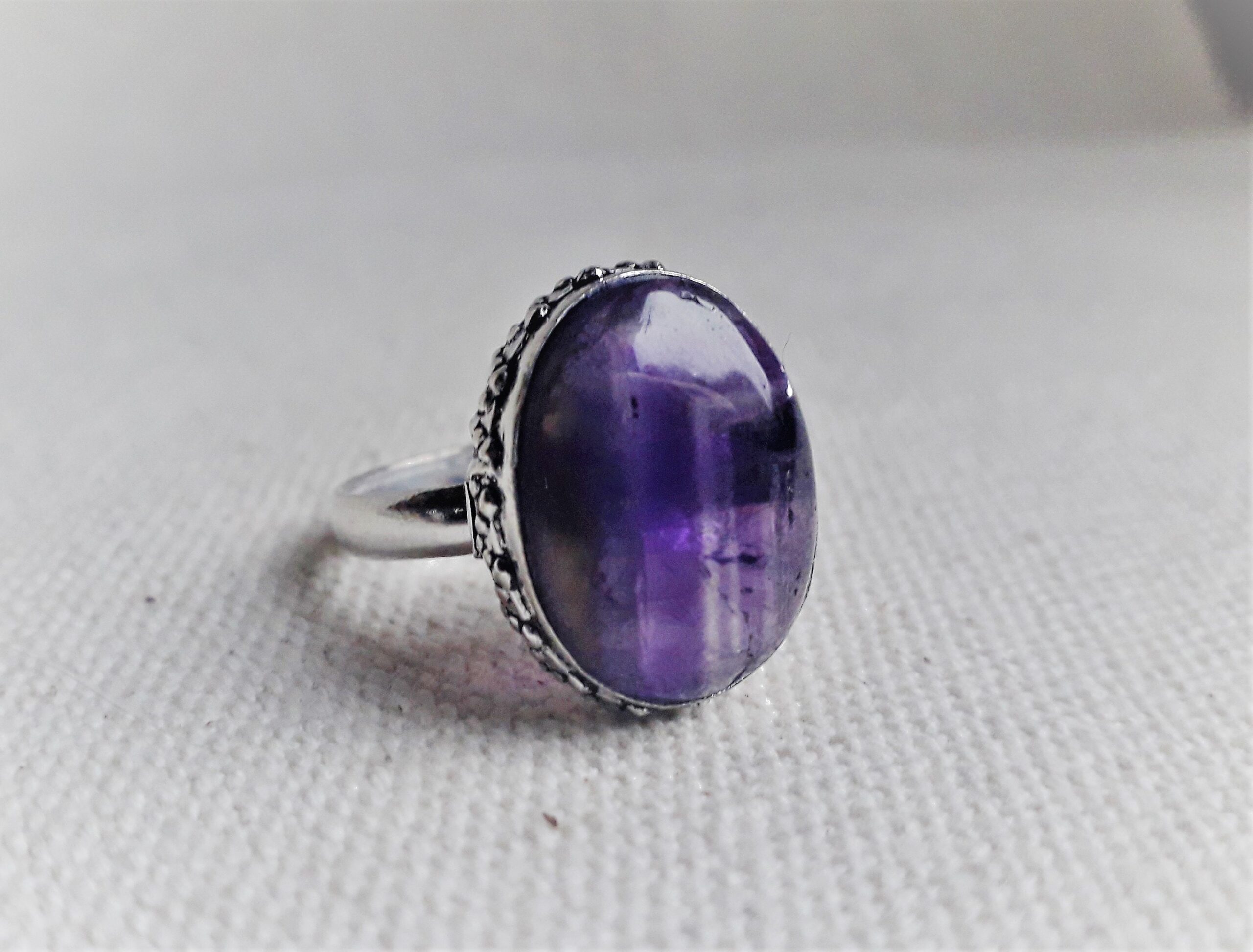 Une très belle bague ethnique. Elle est entièrement fabriquée à la main. Elle se compose d’une très belle pierre d’Améthyste et de Plaqué Argent.