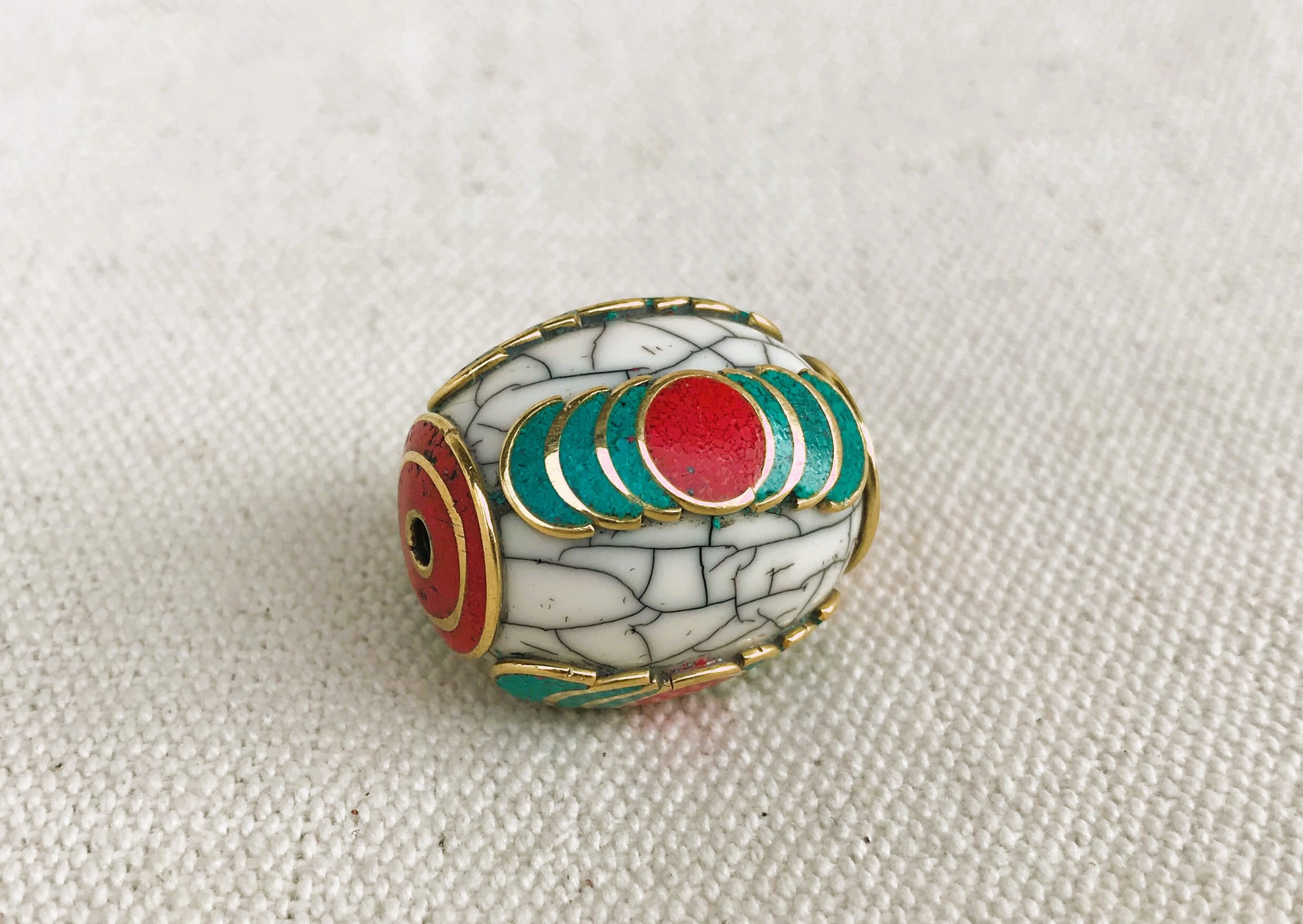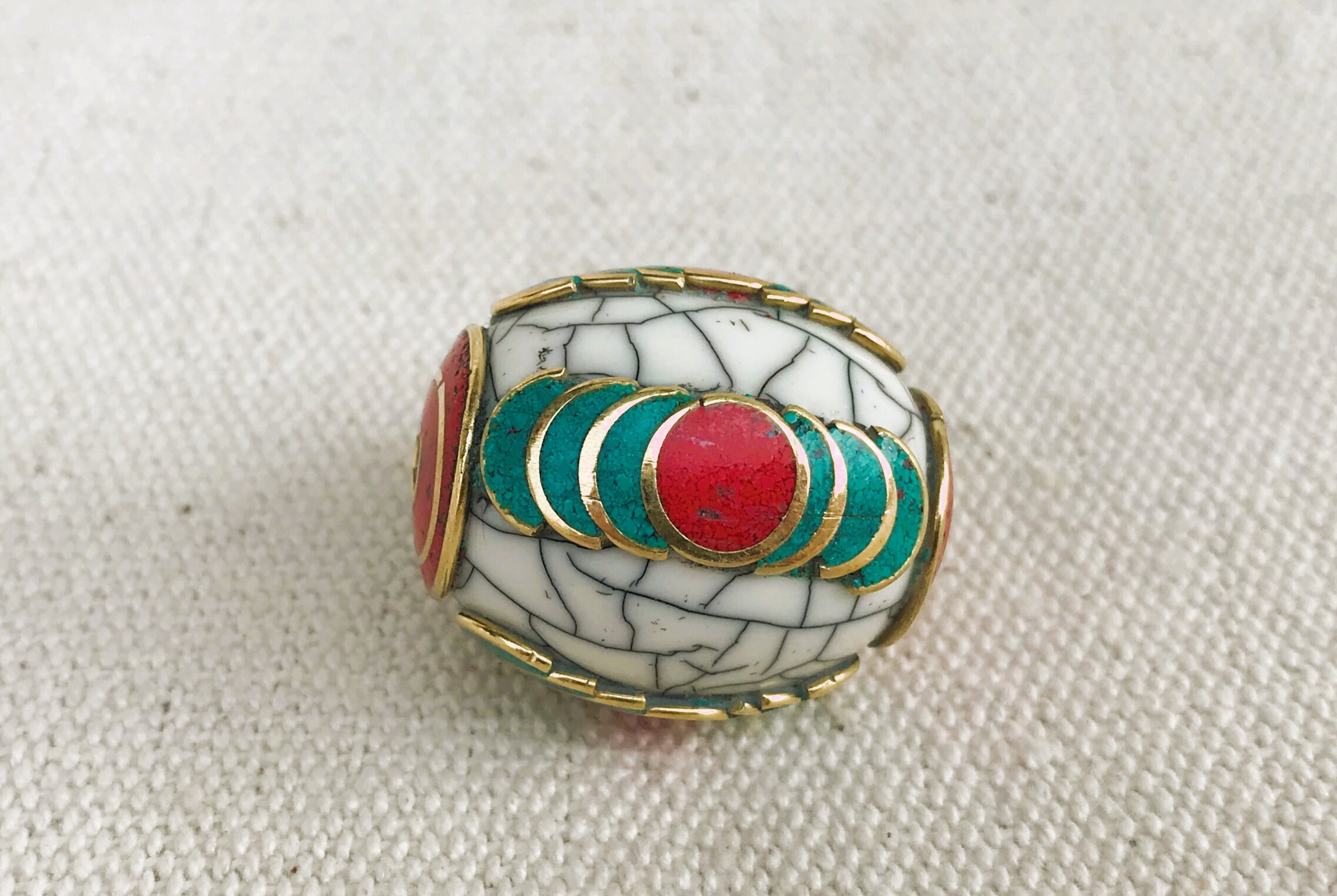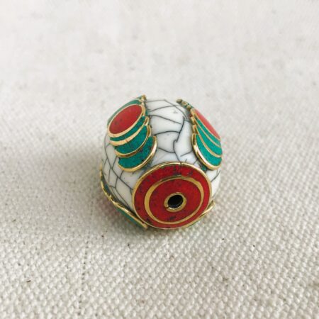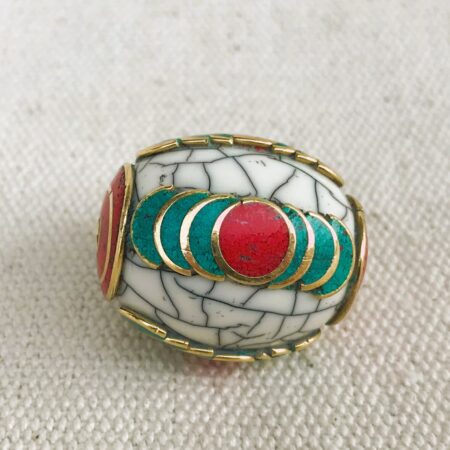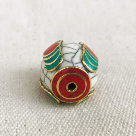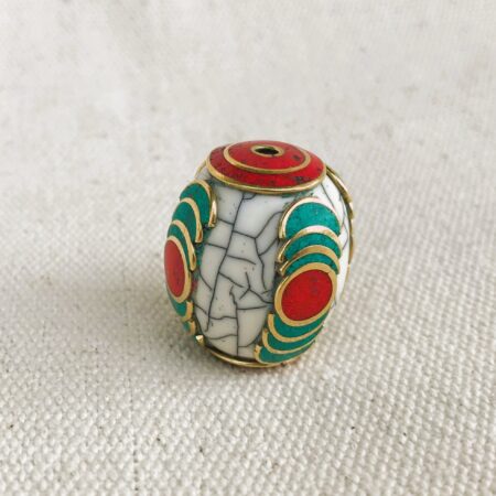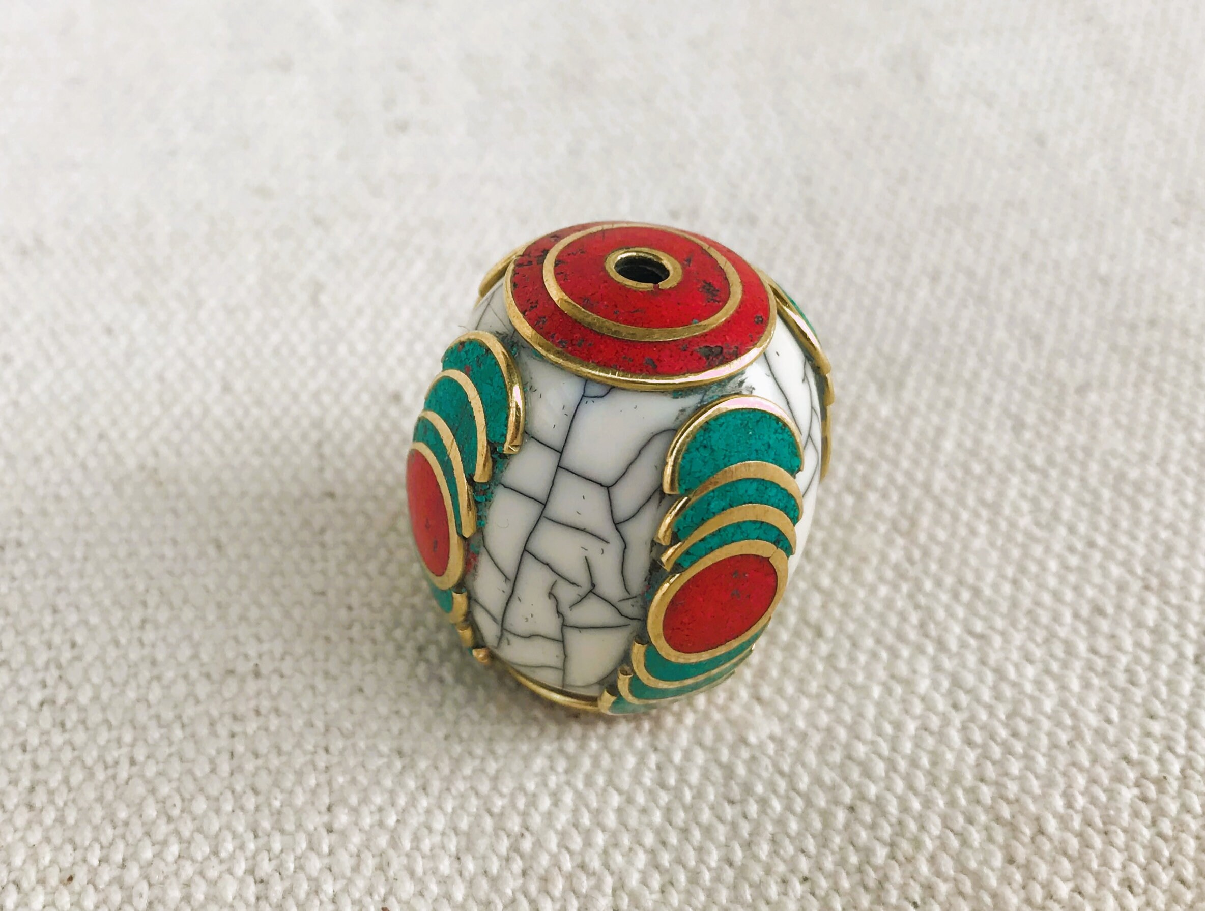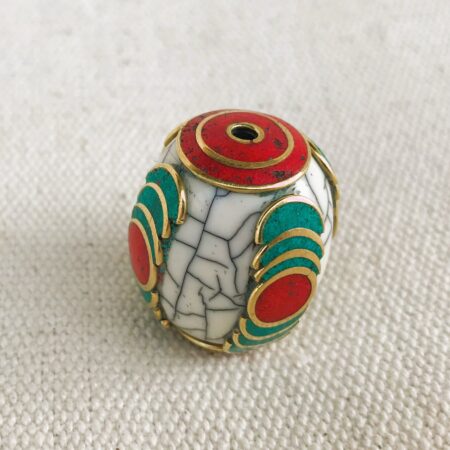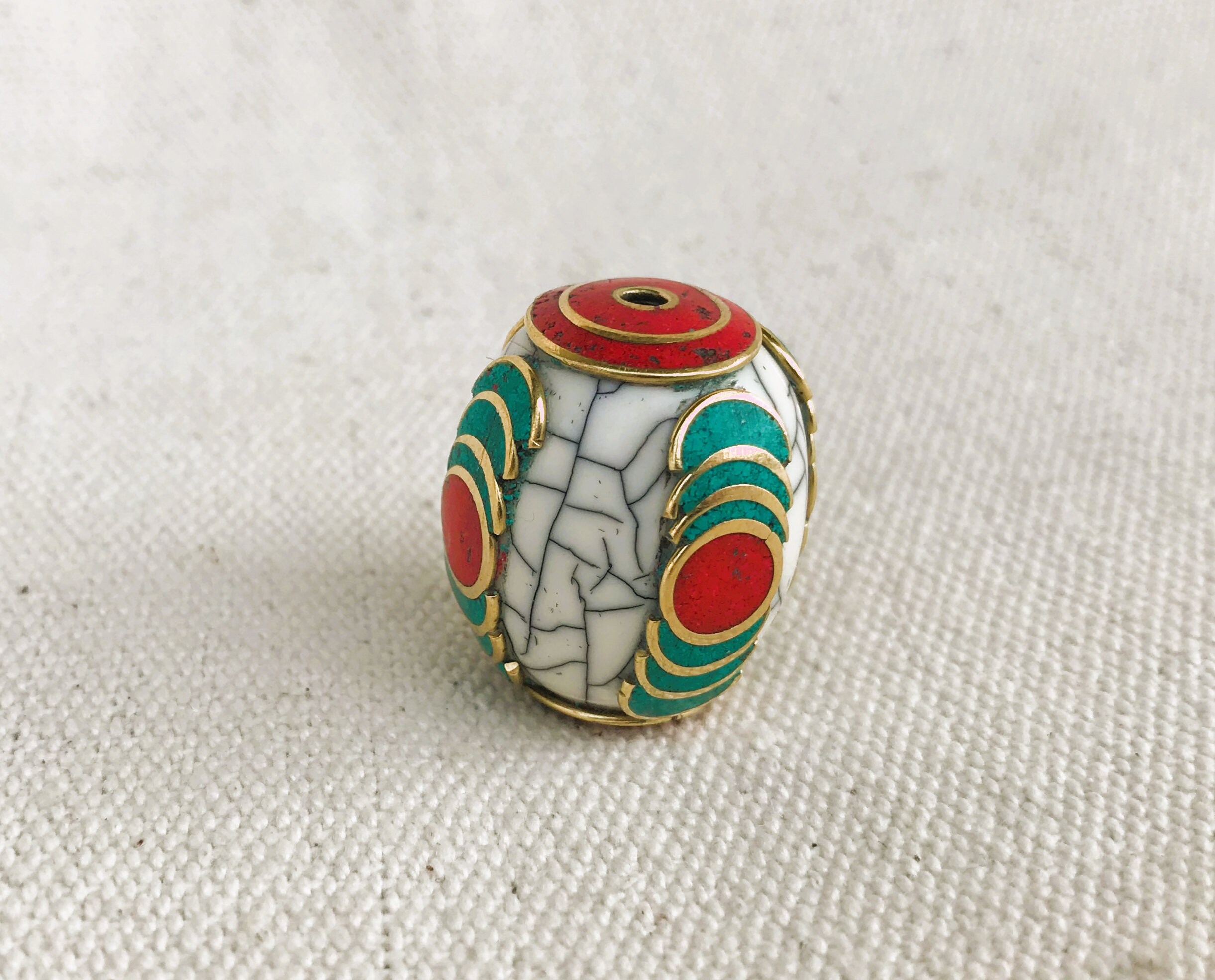 Magnifique et grande perle traditionnelle du Tibet travaillée avec de la Turquoise, du Corail, de la Résine et du laiton.