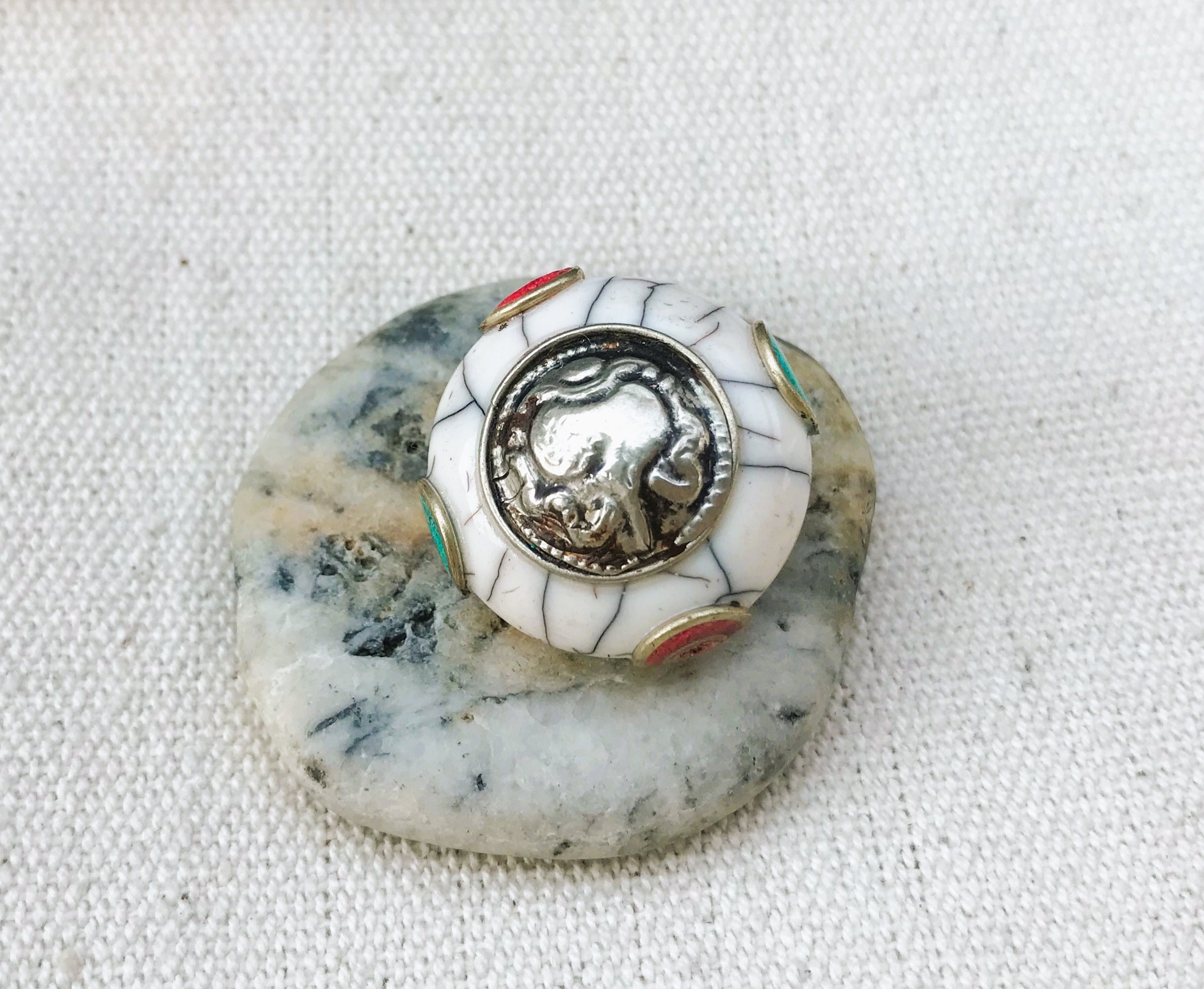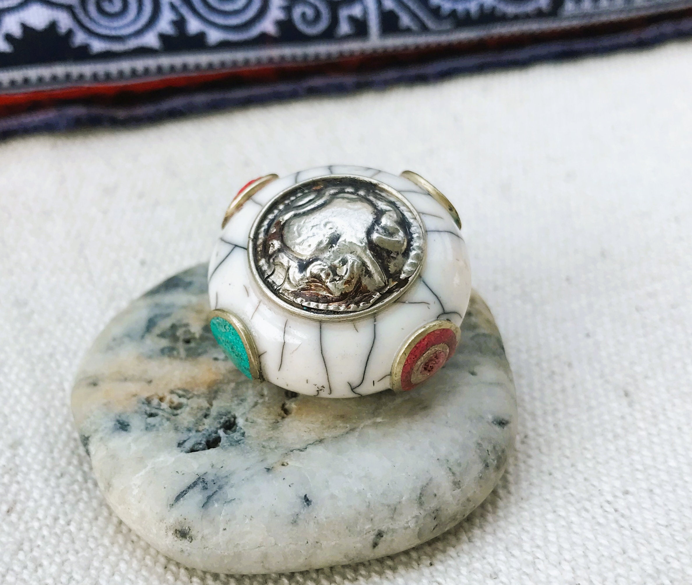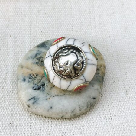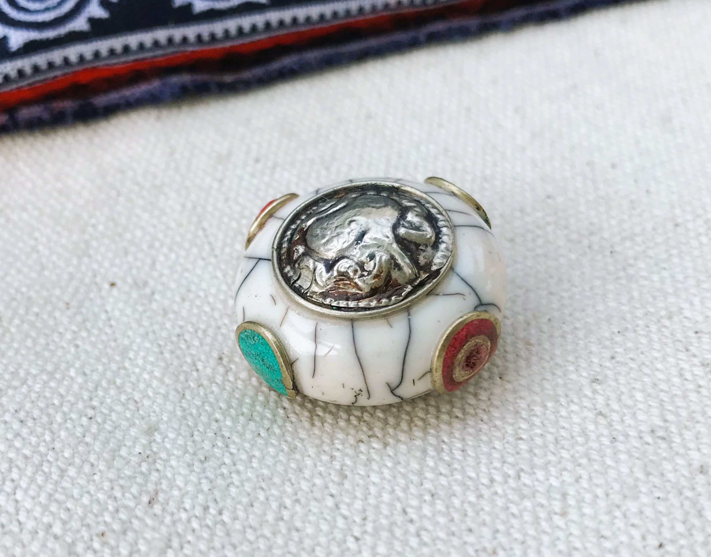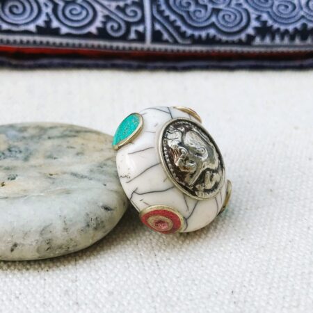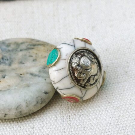 Une Perle traditionnelle du Tibet travaillée avec de la Turquoise,de l’argent tibétain, de la Résine et de l’argent tibétain.