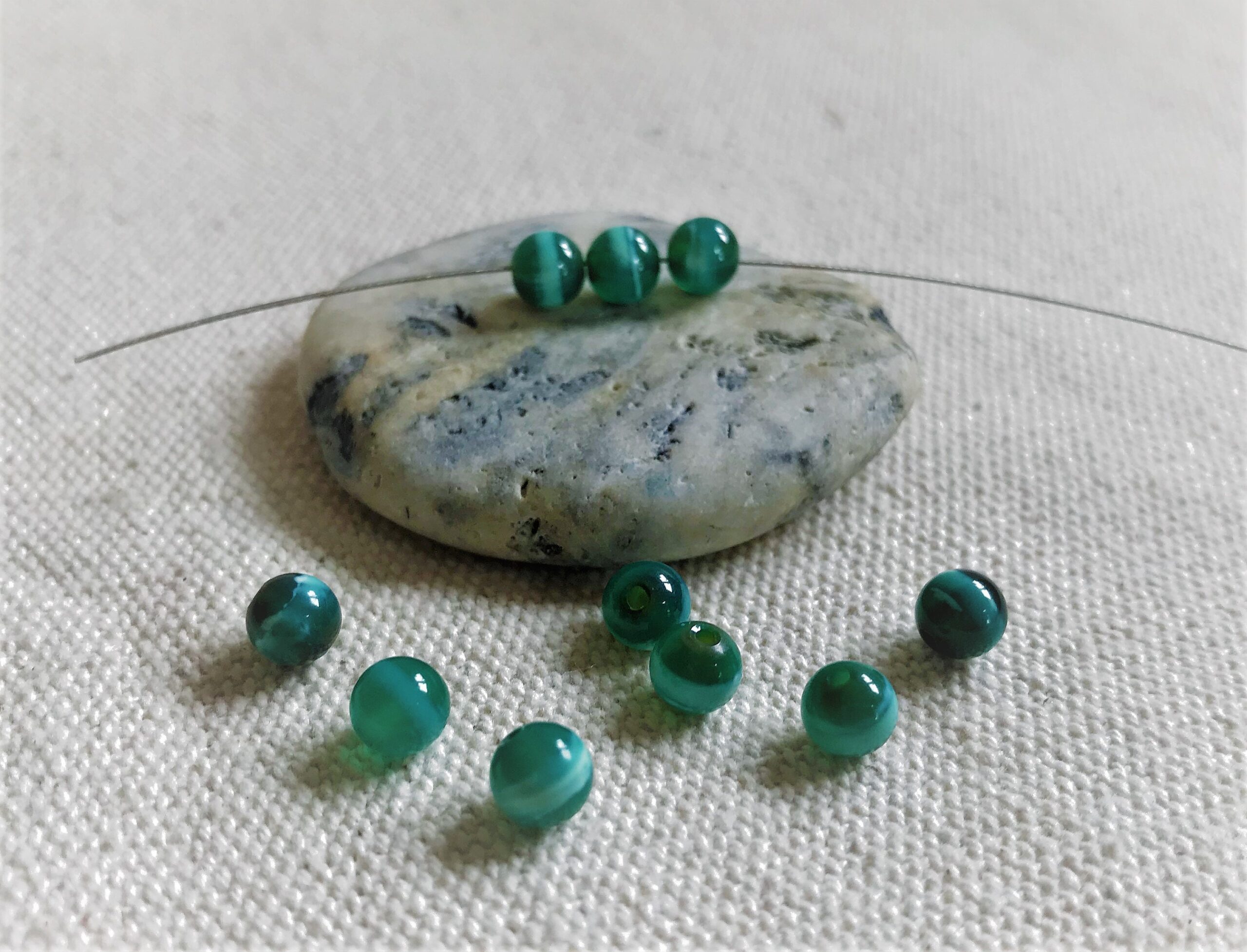 Lot de perles tibétaines en agate vertes et blanches. Se sont des perles utilisées dans la fabrication de bijoux ou de certains objets traditionnels tibétains.