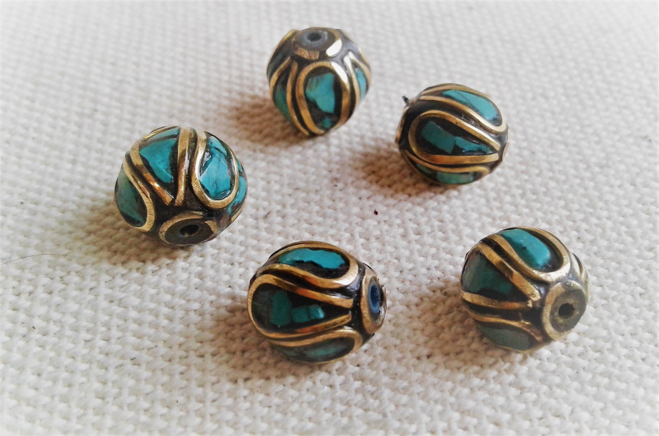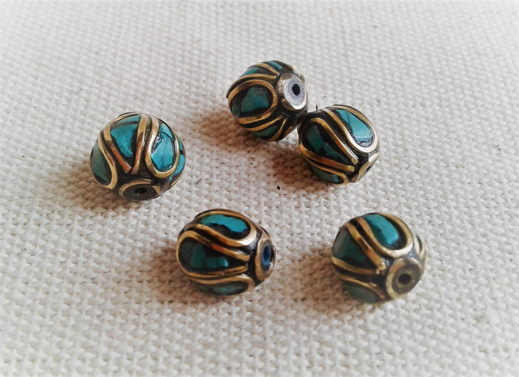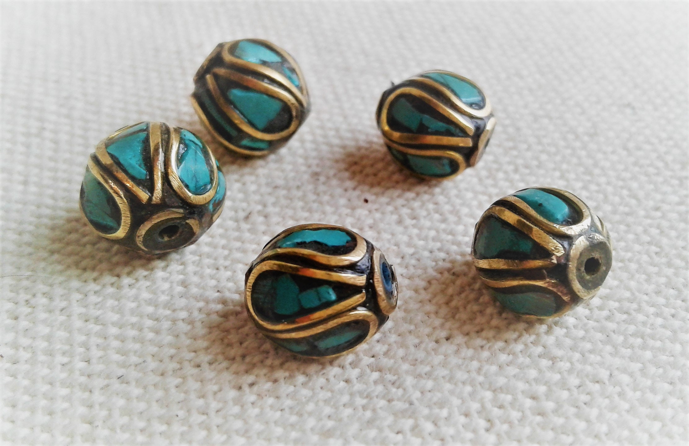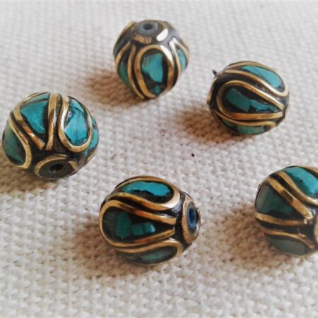 Un lot de magnifiques Perles traditionnelles du Népal Tibet travaillées avec de la Turquoise et du laiton. Elles sont entièrement réalisées à la main.