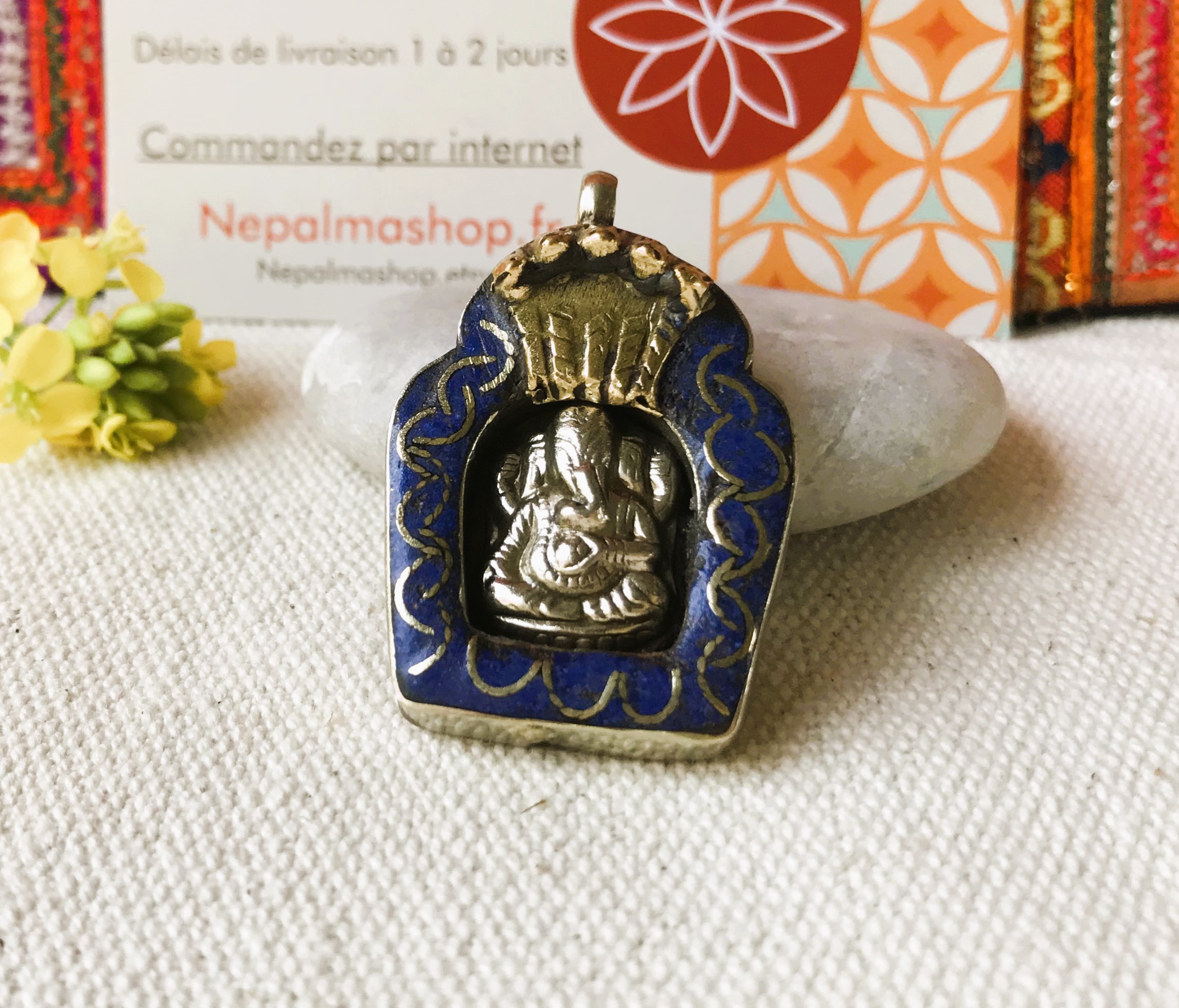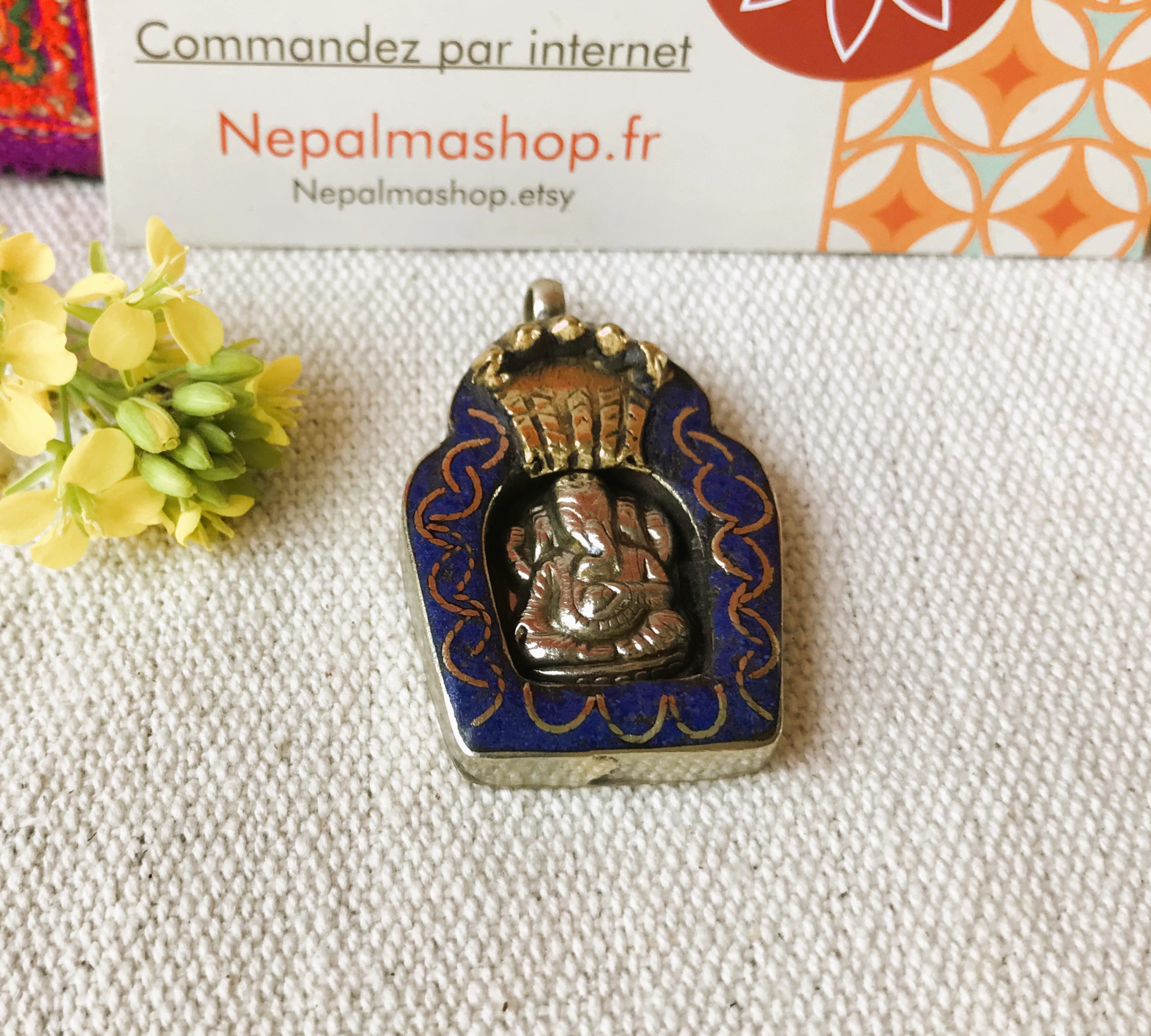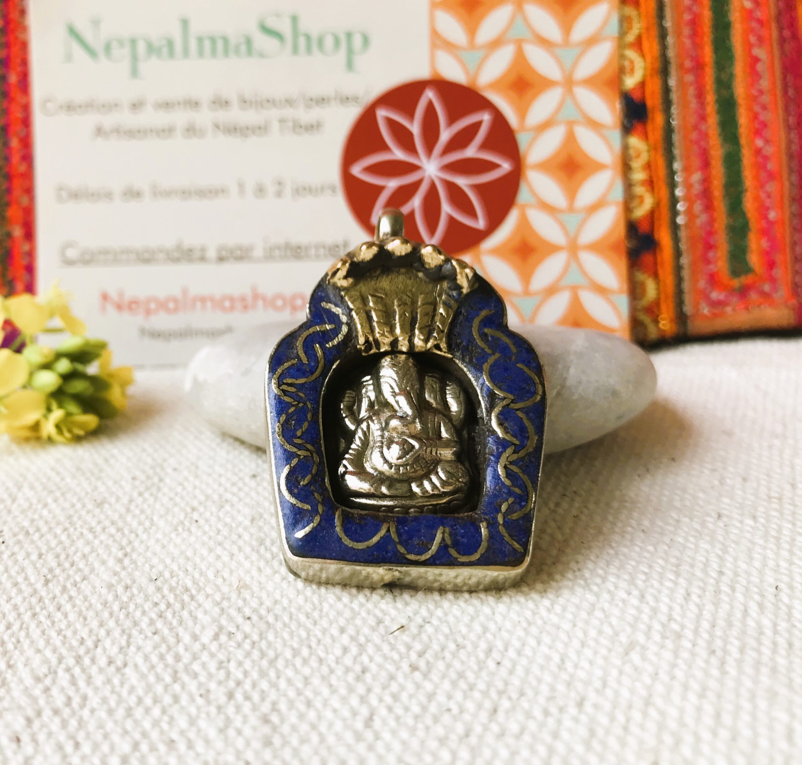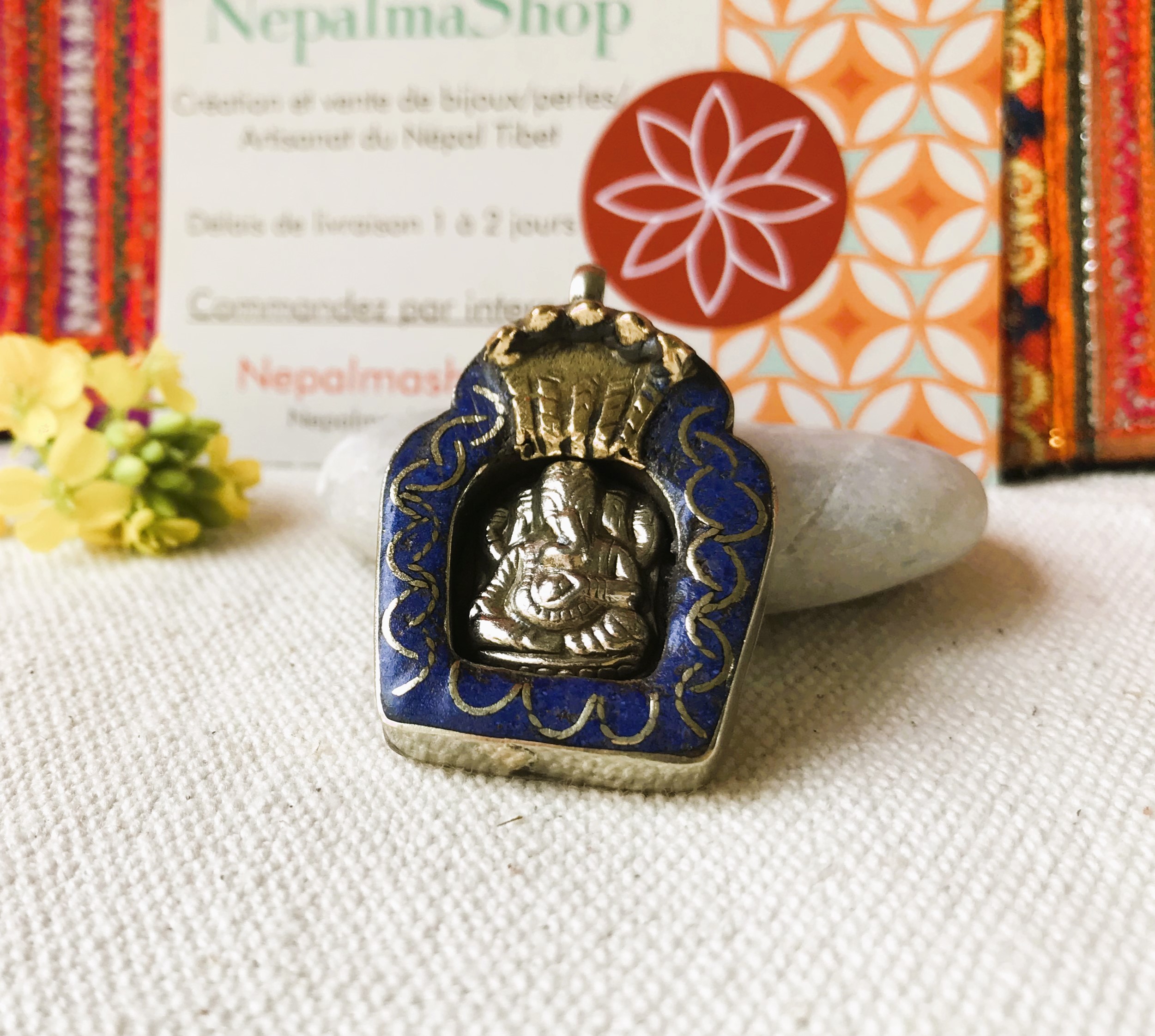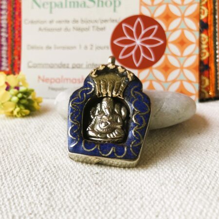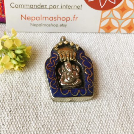 Voici un très joli pendentif traditionnel Népalais , c’est une amulette représentant le Dieu Ganesh. IL est composé d’argent tibétain et de Lapis Lazuli.
