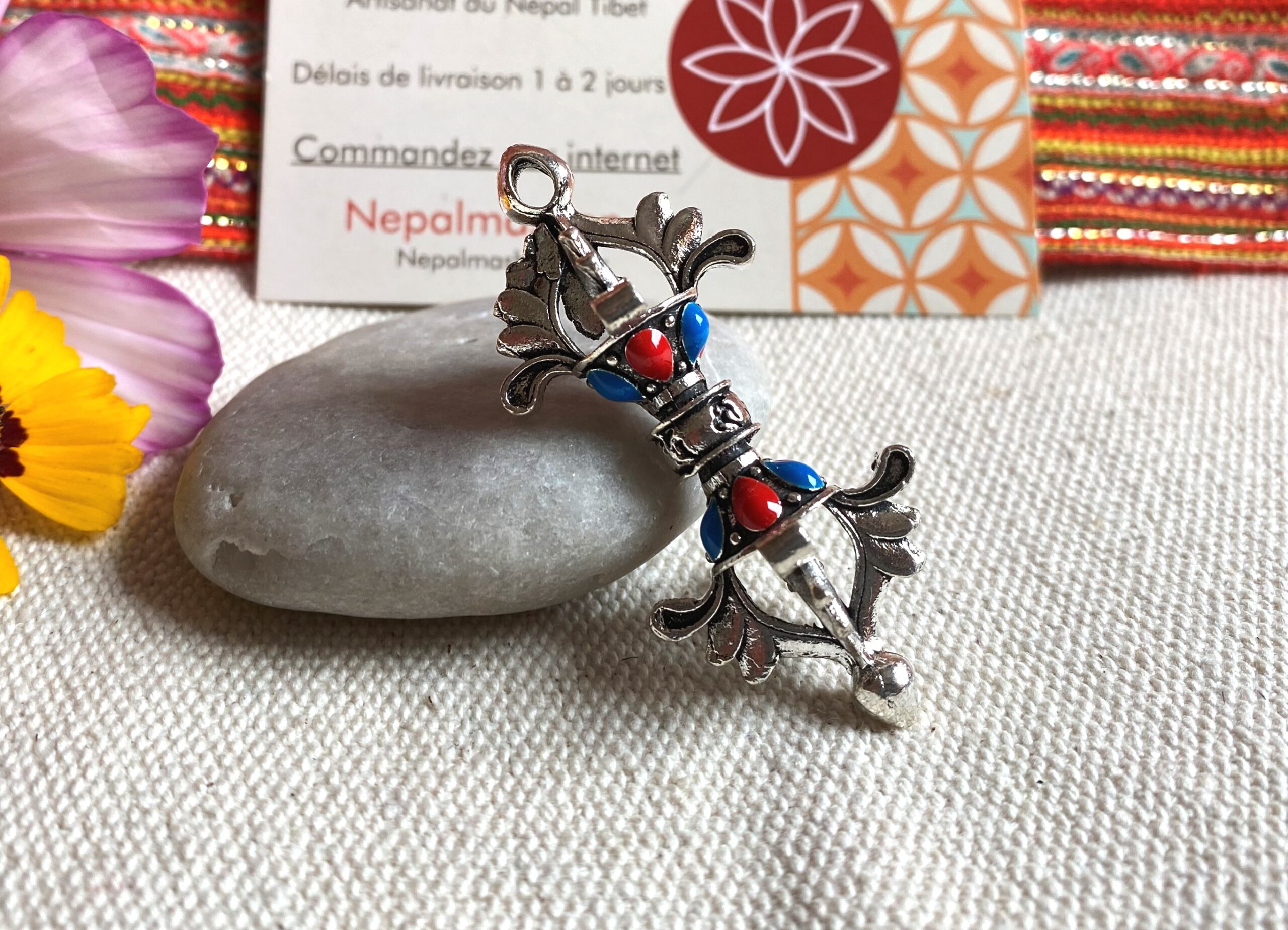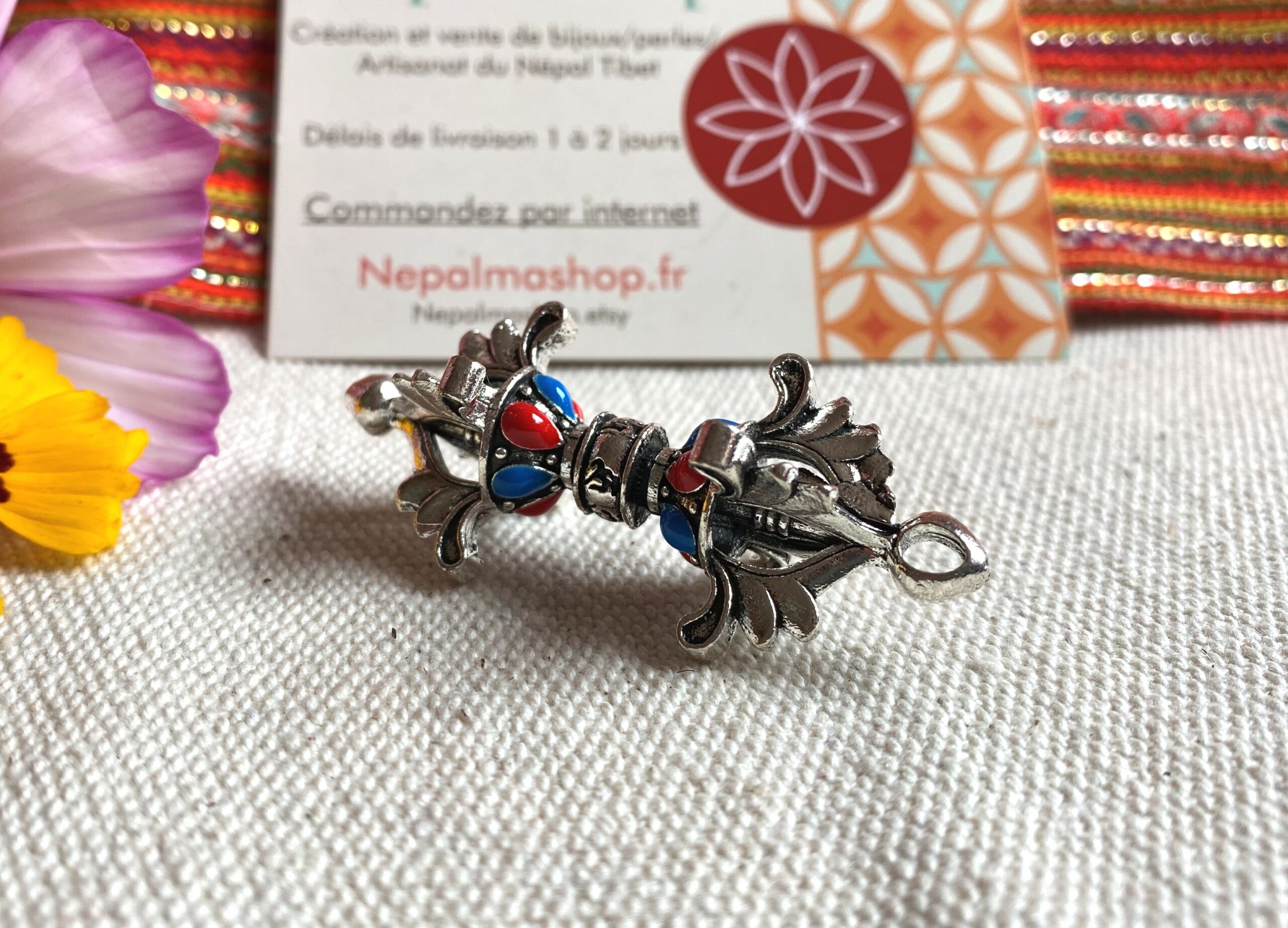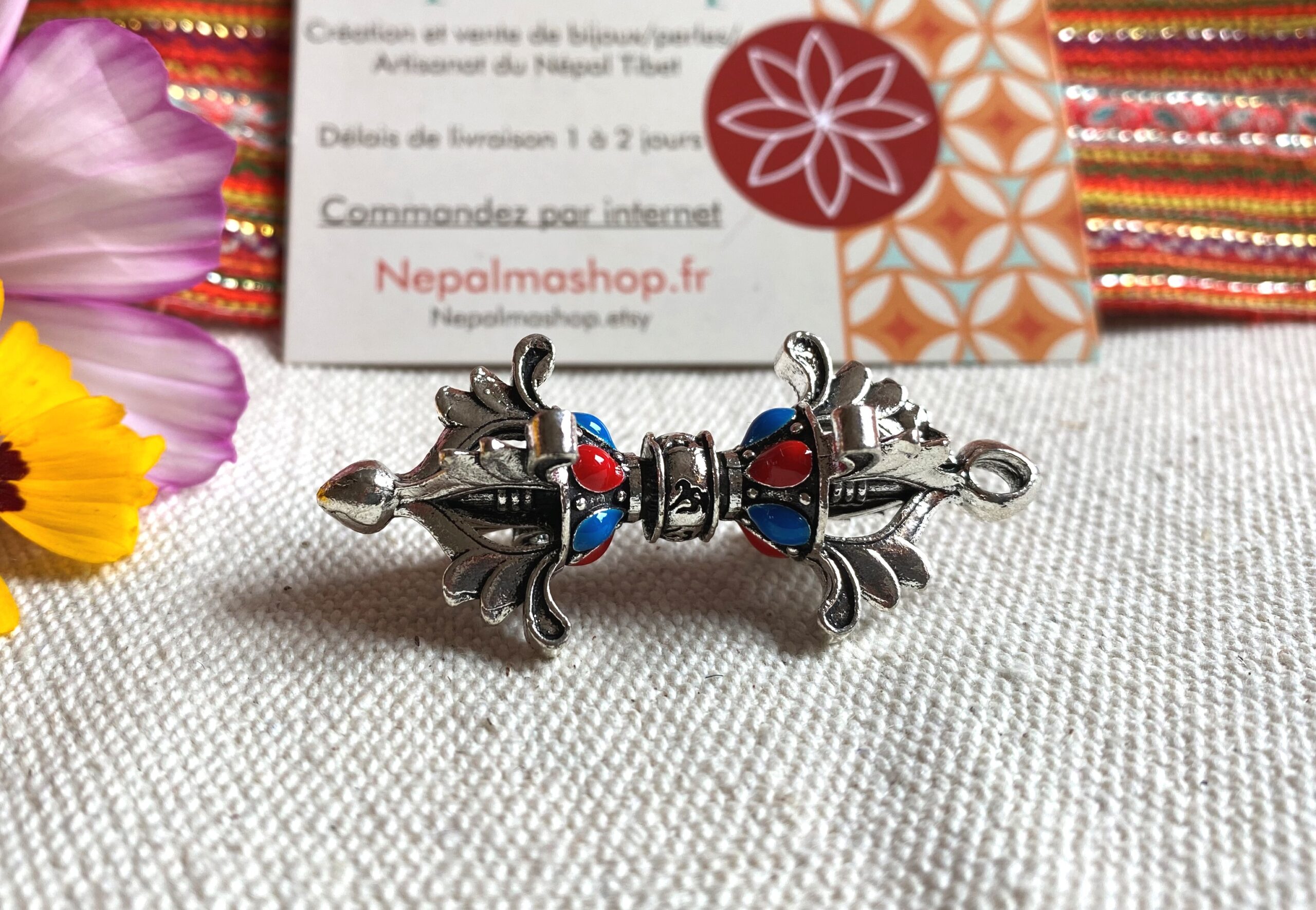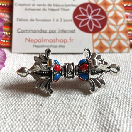Un joli pendentif en forme de Dorje Vajra, il vous servira en tant que pendentif ou pour toute autre création. Il se compose d’argent tibétain (alliage : cuivre, étain,argent).
