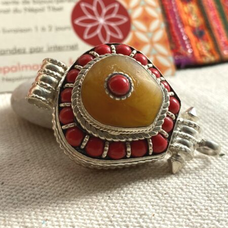 Un magnifique pendentif traditionnel Tibétain, il est en forme de goutte, la particularité c’ est qu’il est également une petite boite dans laquelle vous pouvez glisser une photo, un porte bonheur…Il se compose d’argent tibétain, de Corail, de résine ambrée.