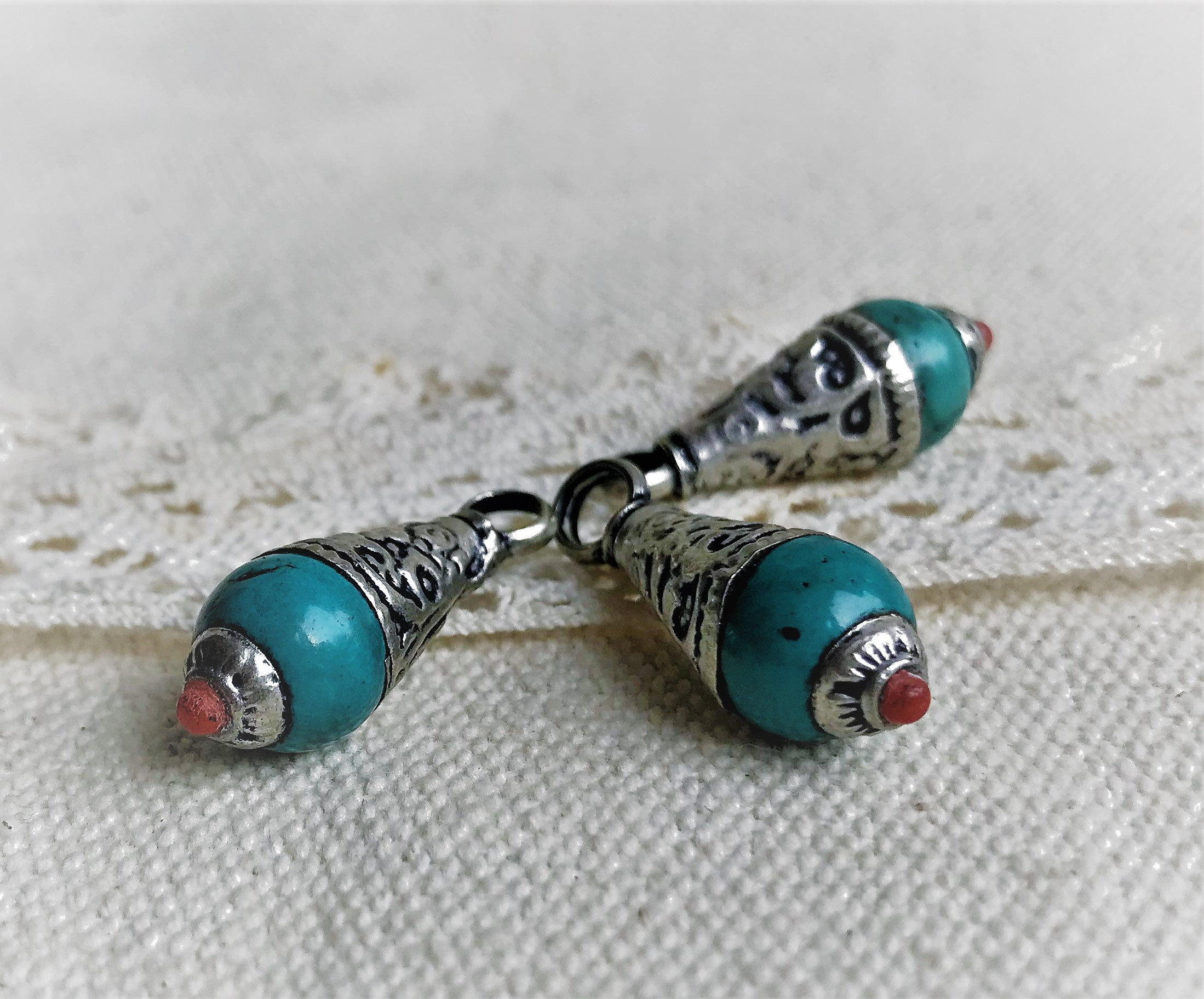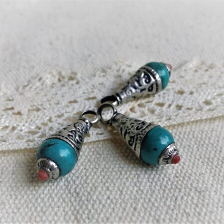 C’est un bijou qui se constitue d’argent Tibétain et de Turquoise, il a été réalisé d’après des designs traditionnels de bijoux tibétains !