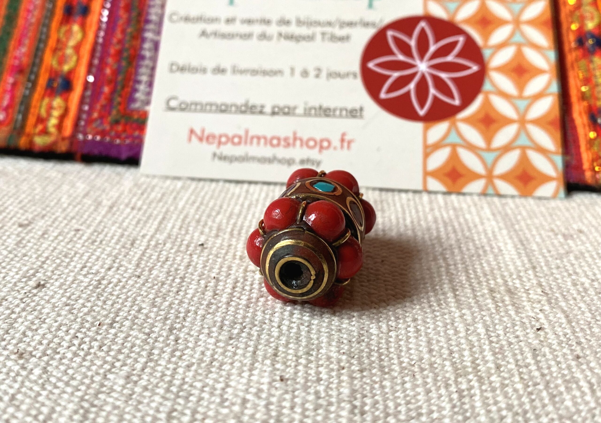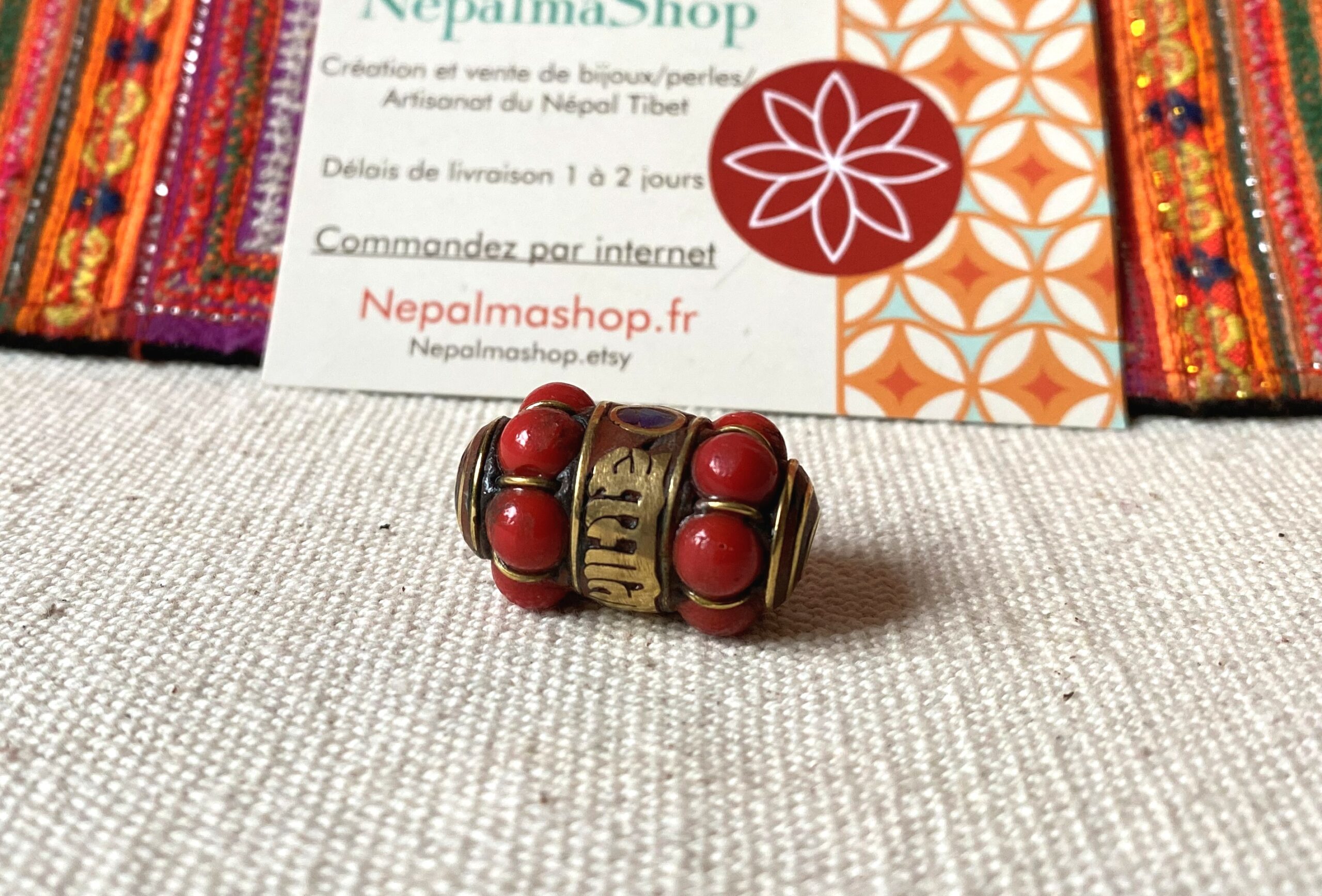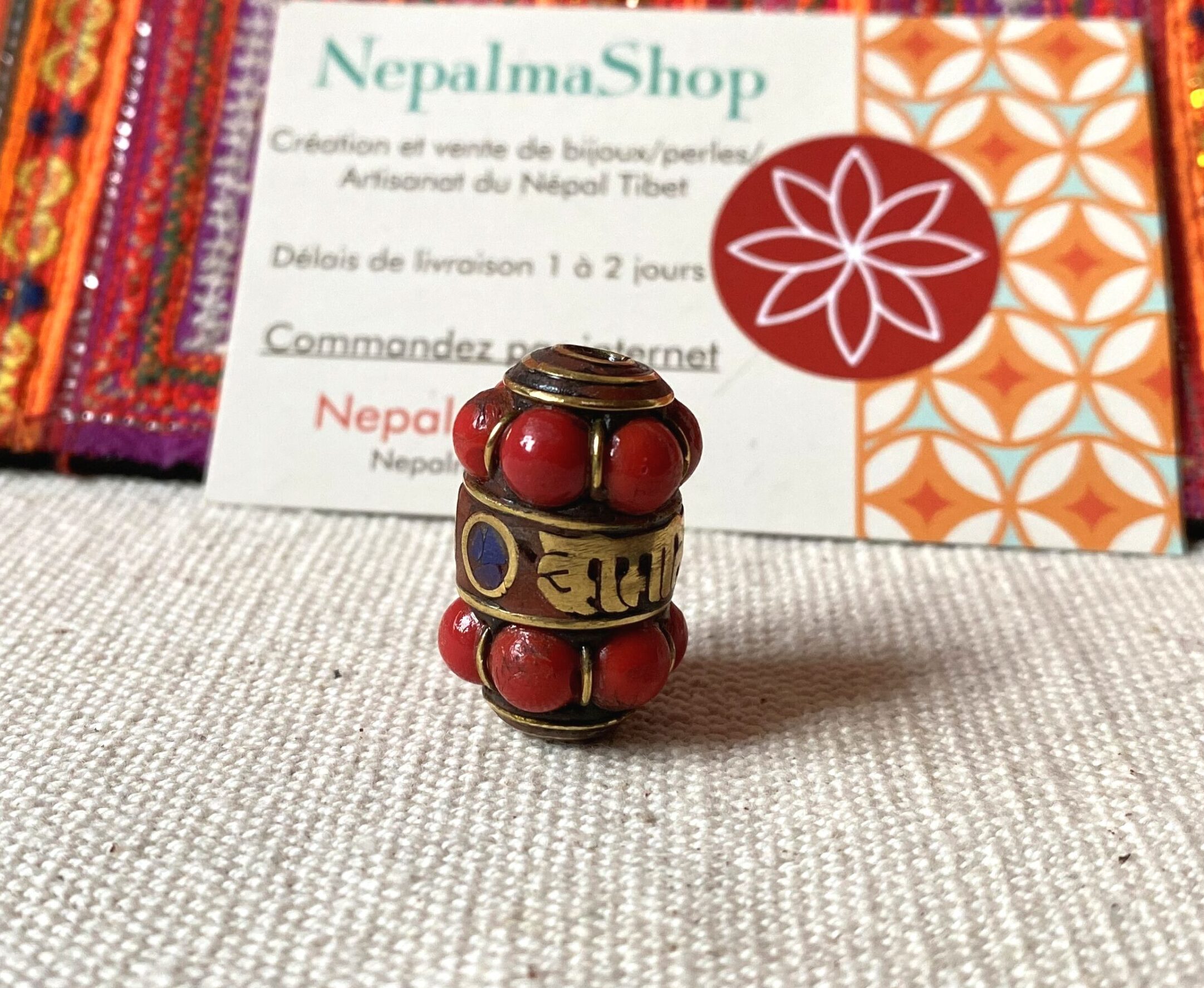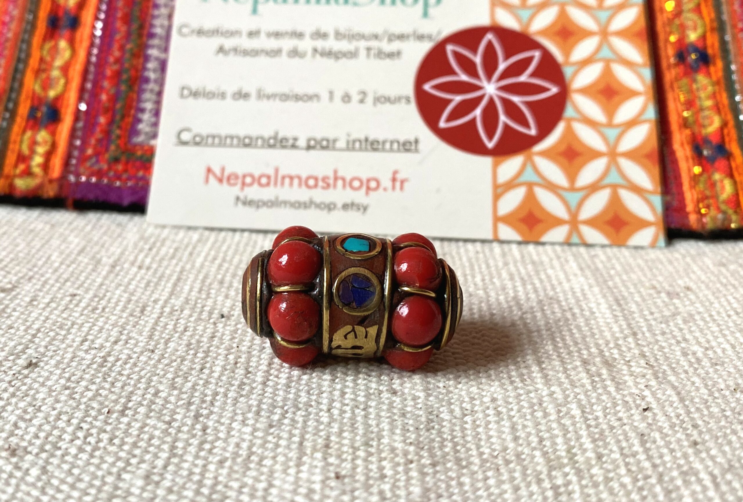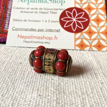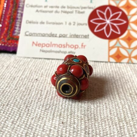 Perle traditionnelle provenant du Népal Tibet constituée de Corail, de Turquoise, de Lapis Lazuli et de laiton. Magnifique perle pour réaliser vos bijoux, inspirée de modèles traditionnels tibétains. Sur la perle est inscrit le mantra « Om Mane Padme Aum ».