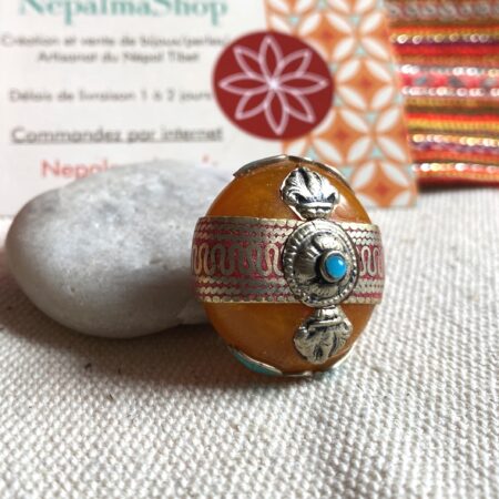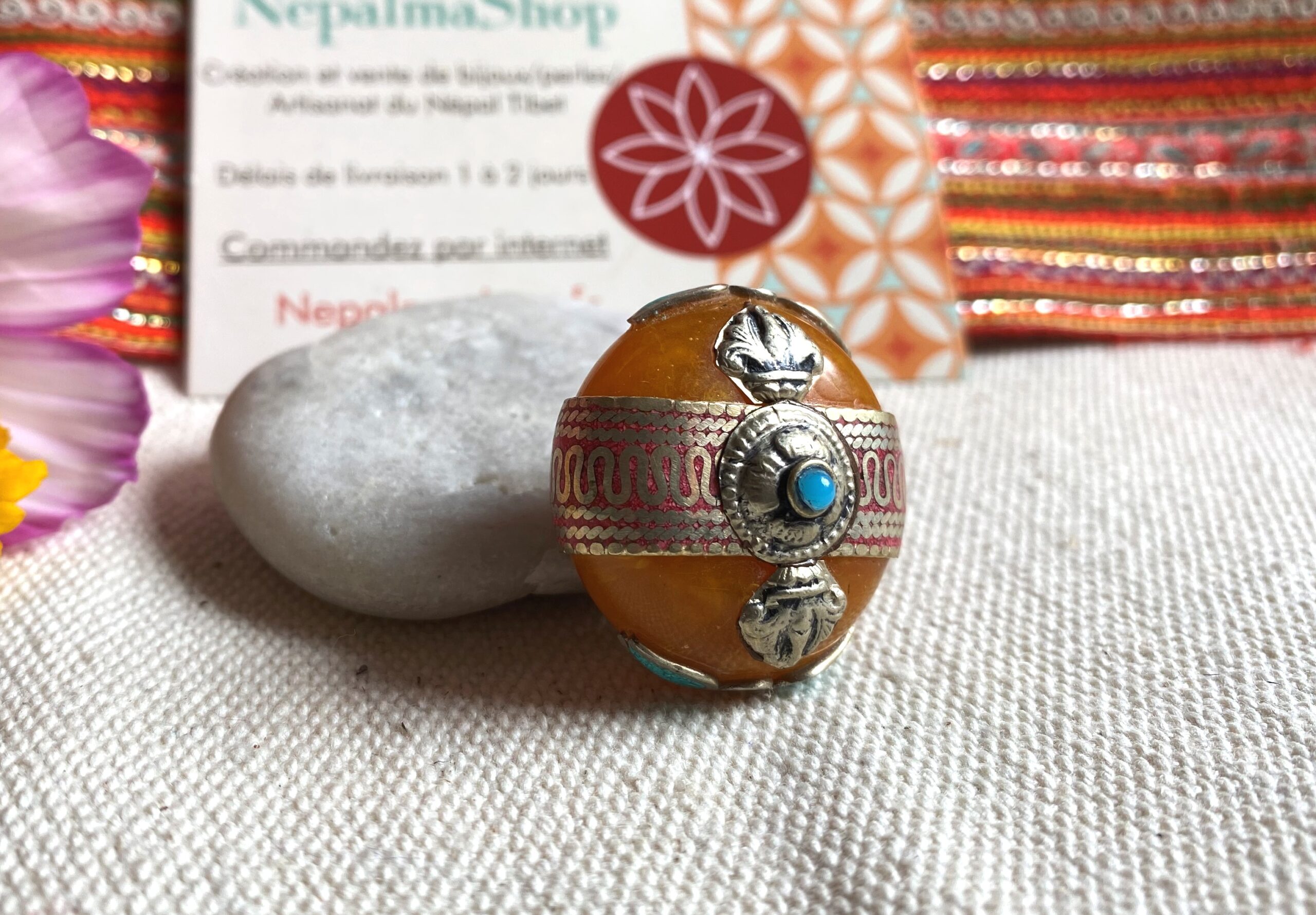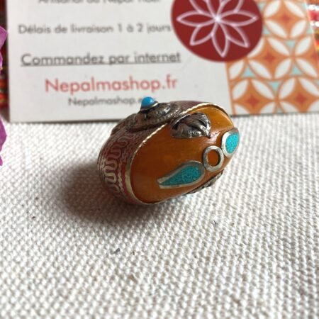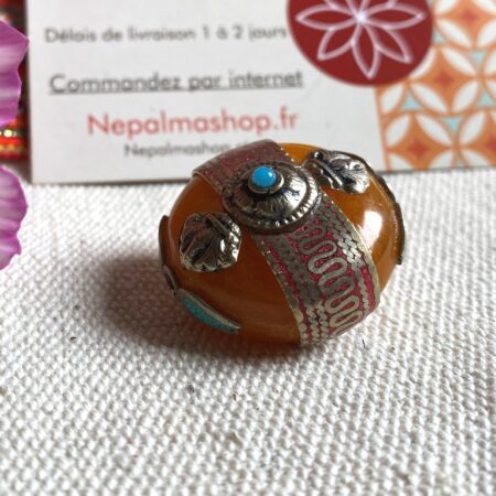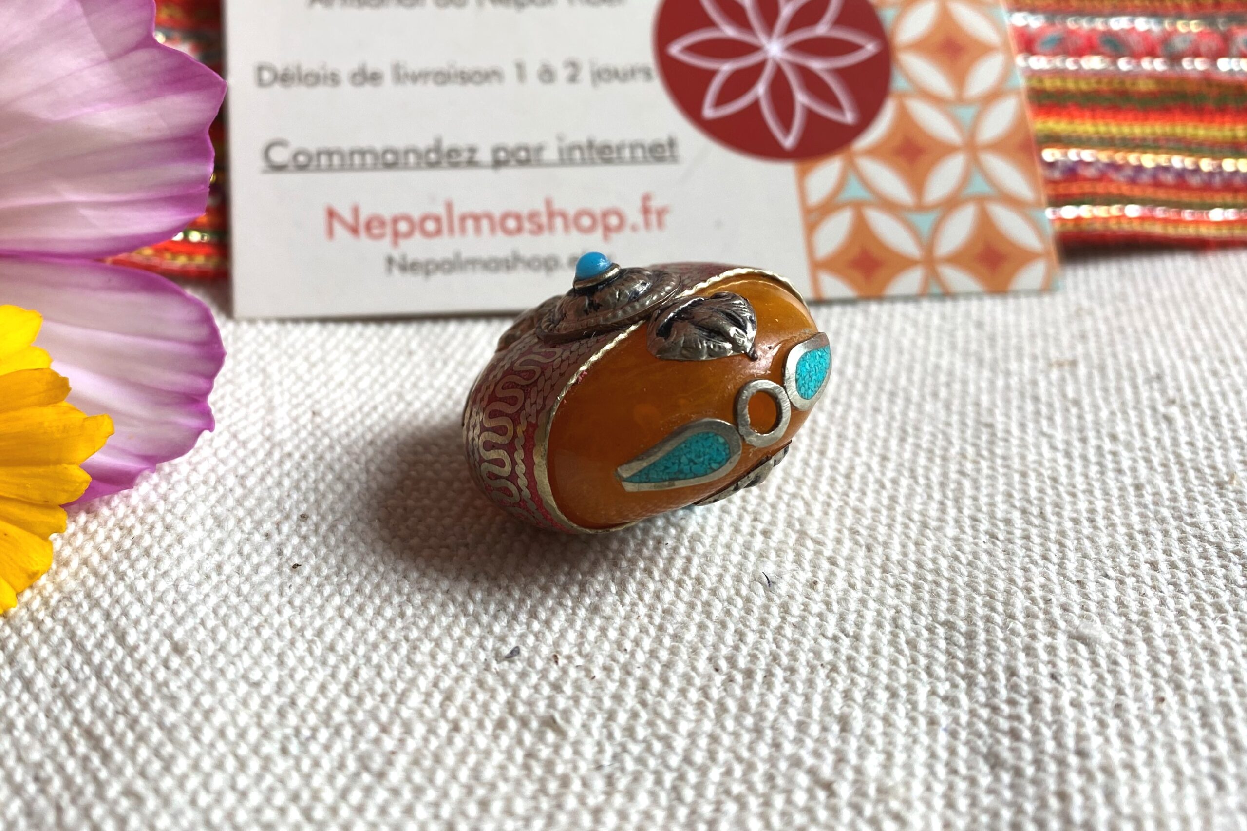 Une très belle grande perle traditionnelle du Tibet travaillée avec du Corail et de la Résine ambrée .