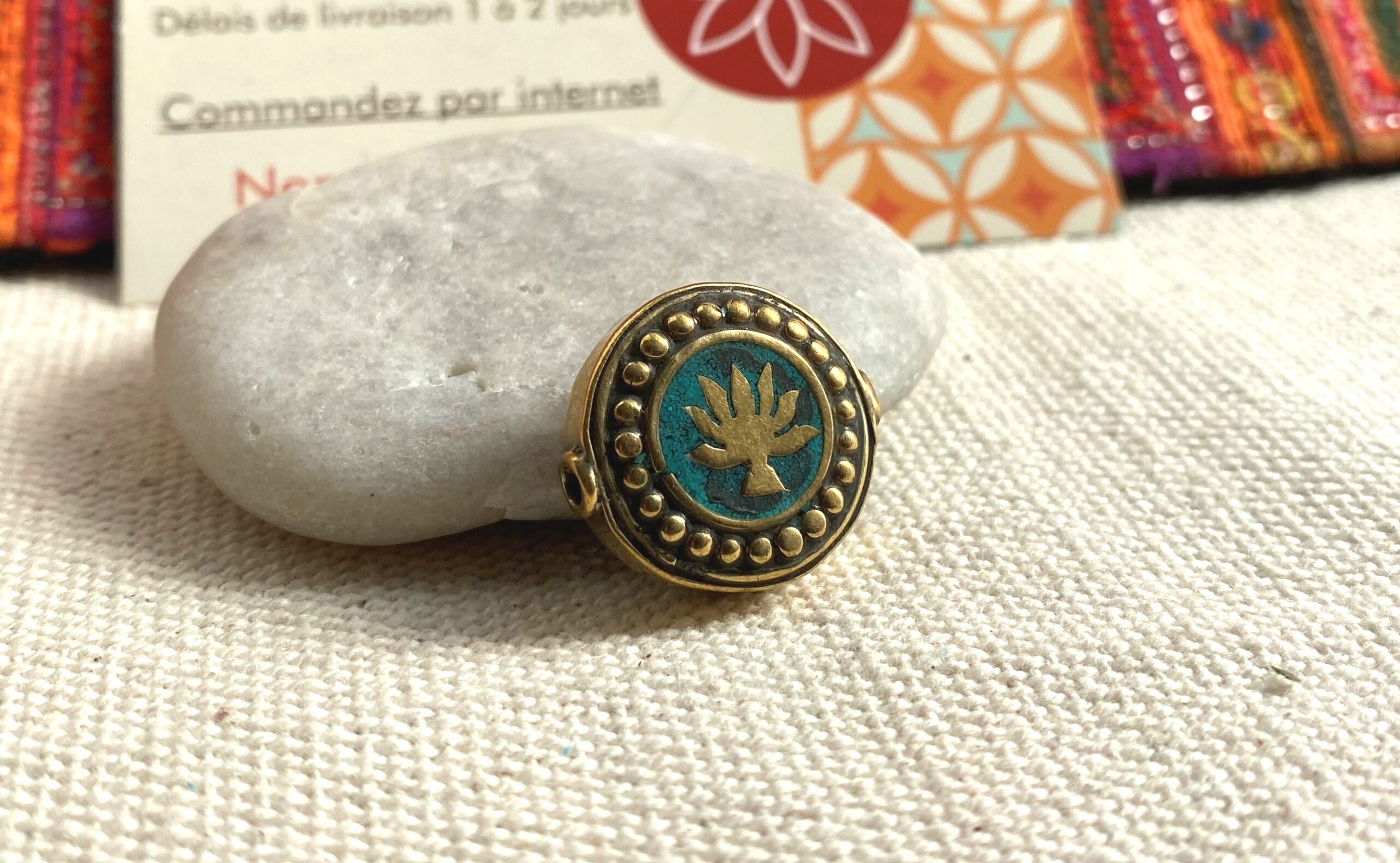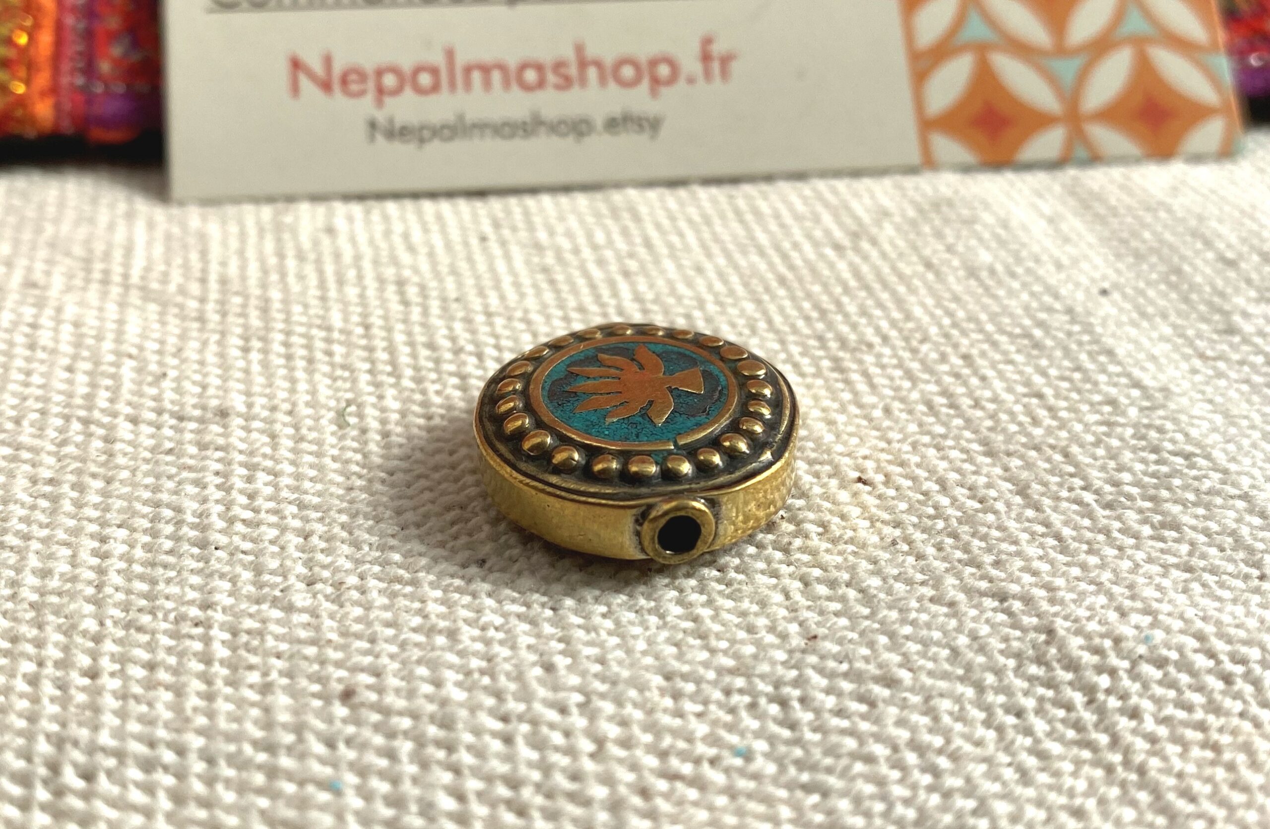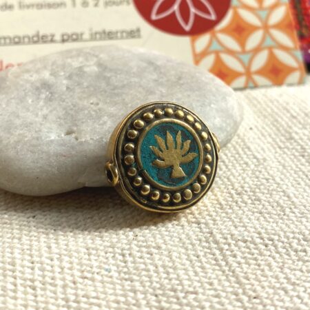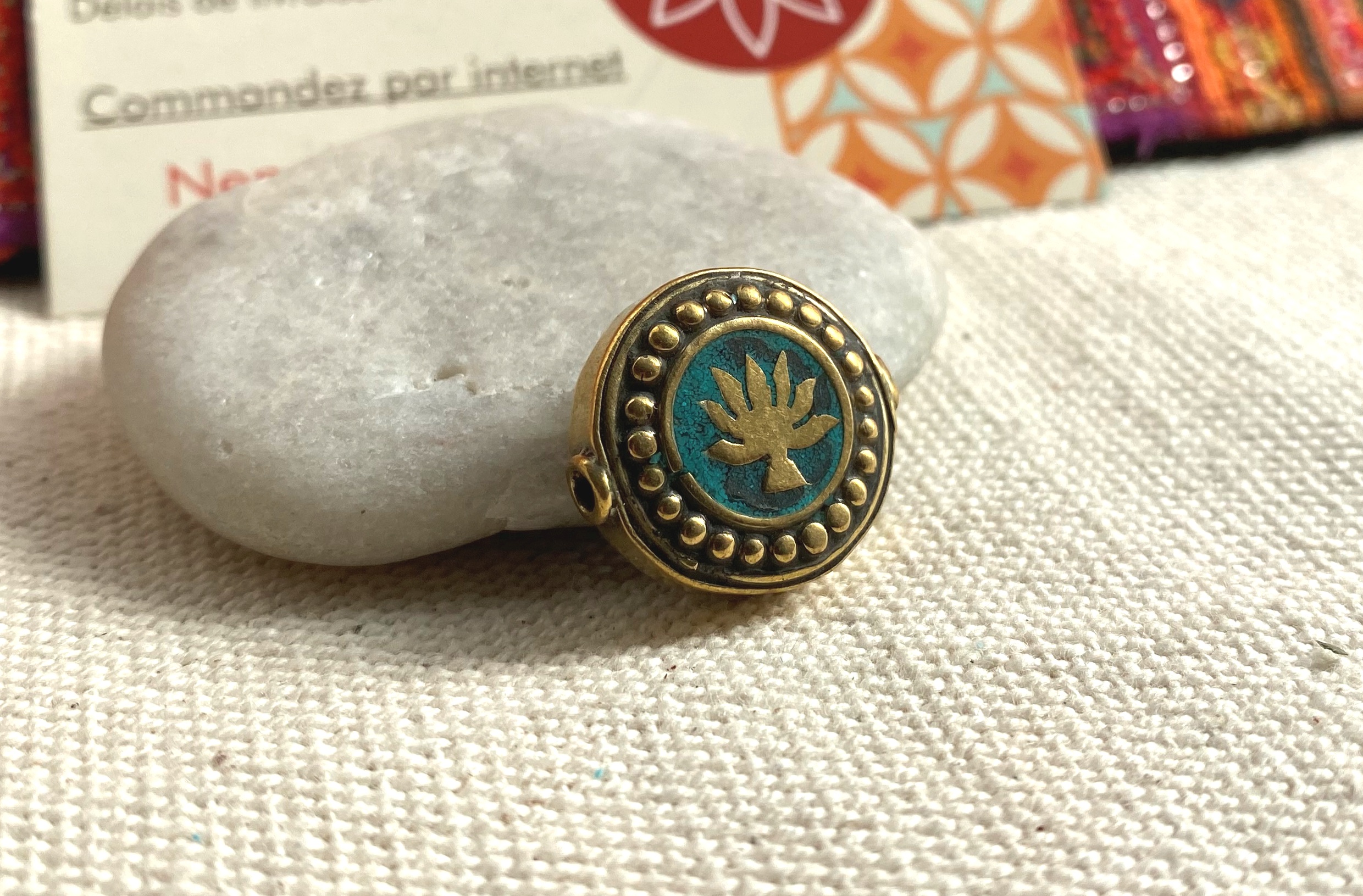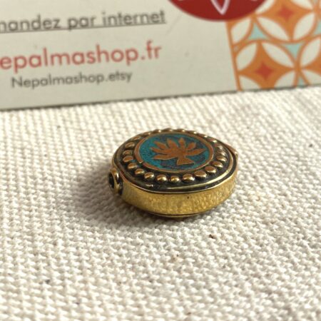 Une très belle perle traditionnelle du Népal travaillée avec du laiton et de la Turquoise. Sur les 2 côtés de la perle apparait une fleur de Lotus. C’est la Fleur sacrée au Népal, la fleur de lotus revêt une symbolique différente selon les cultures et la couleur de ses pétales. Comme elle retourne chaque soir en eaux troubles et ouvre ses pétales graciles à l’aube, la fleur de lotus est un symbole de force, de résilience et de renaissance !