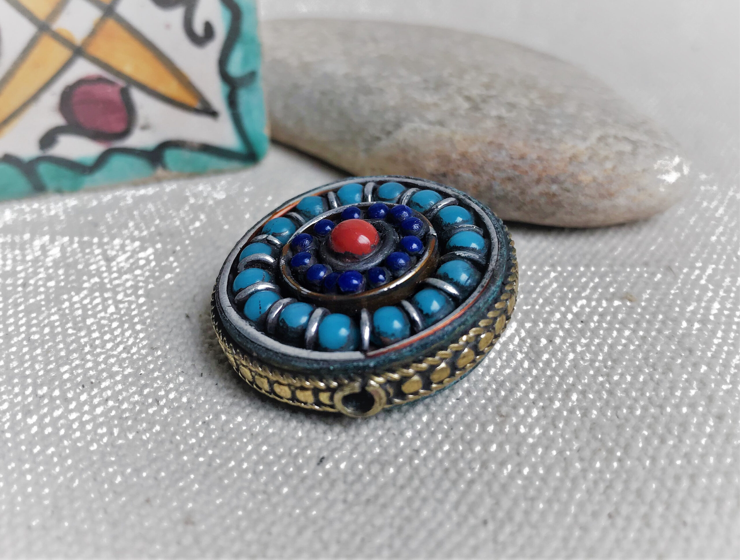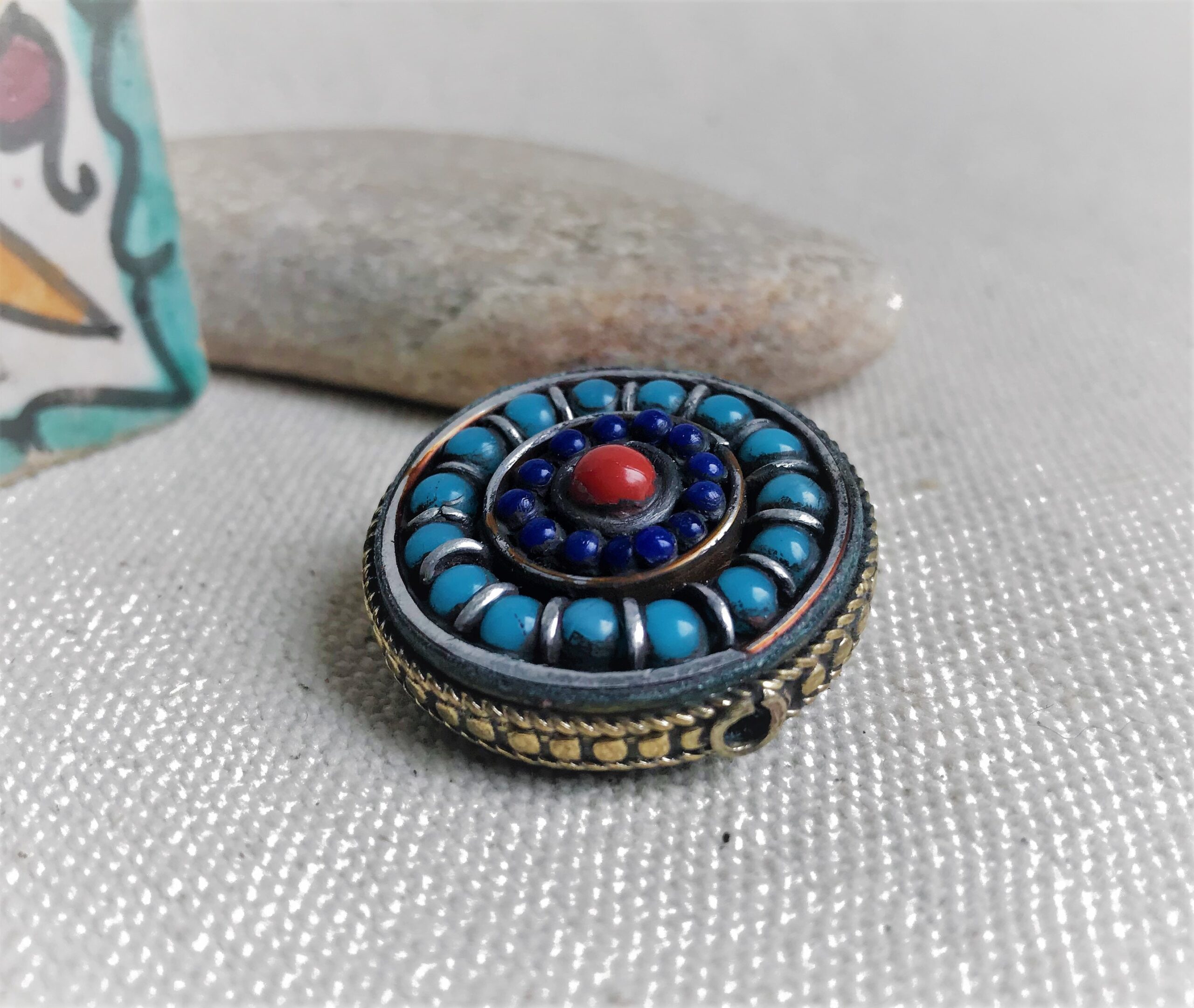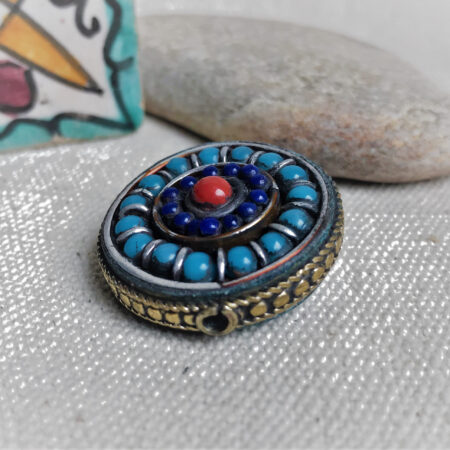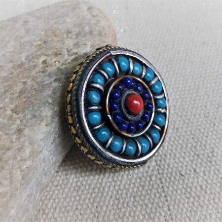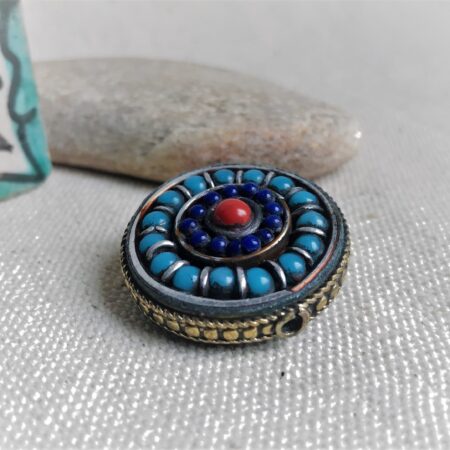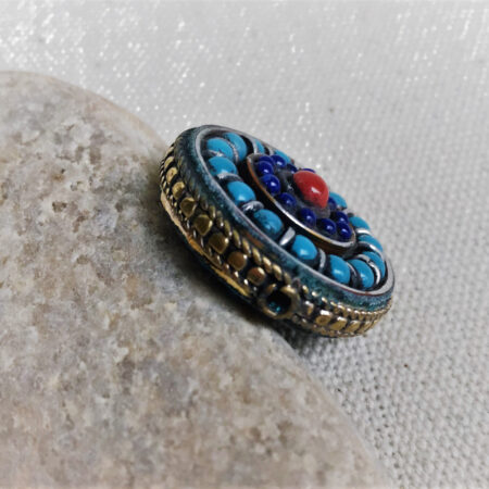 Cette perle est entièrement réalisée à la main. Elle est de forme Ronde et plate. C’est une très belle pièce de l’artisanat traditionnel tibétain.