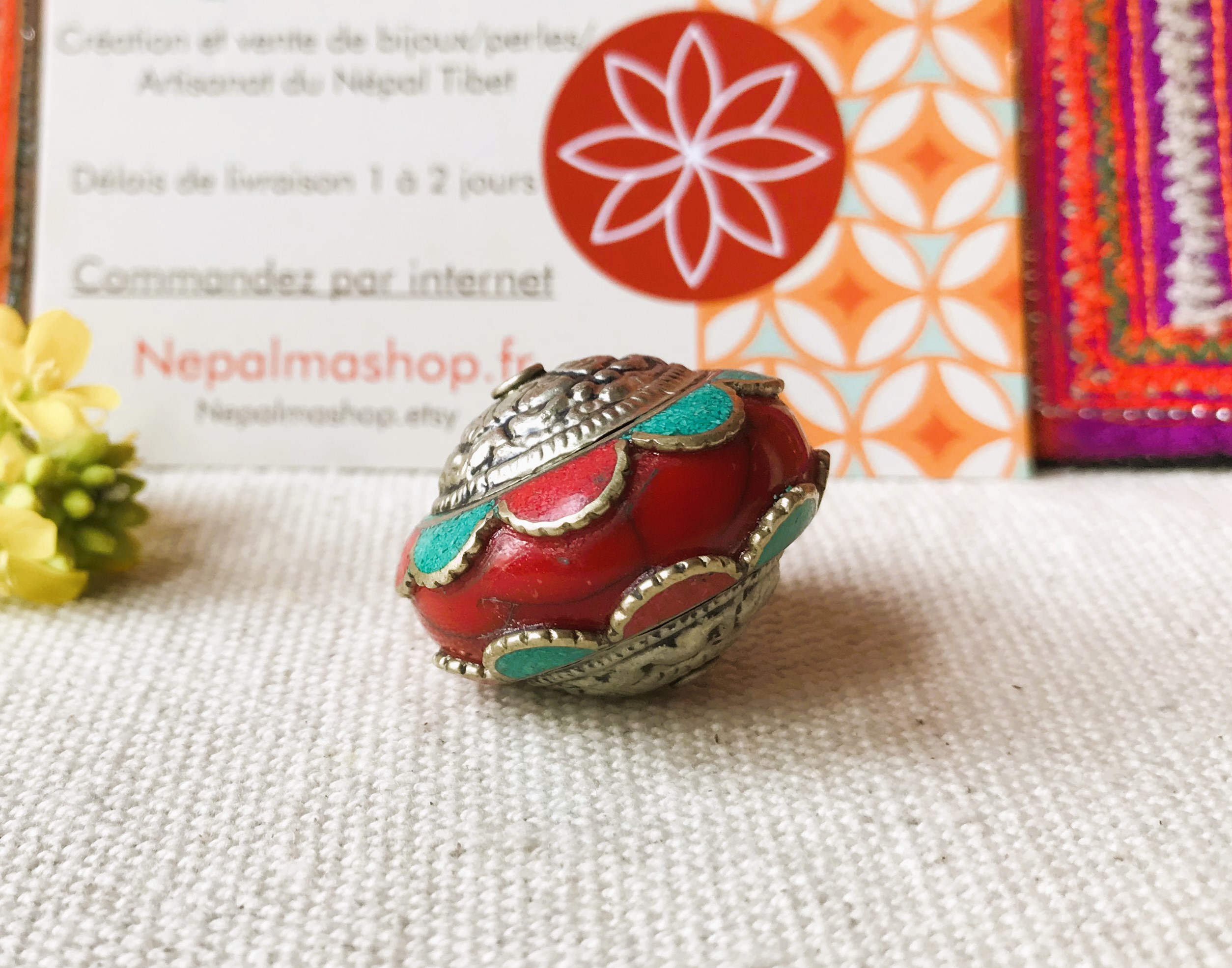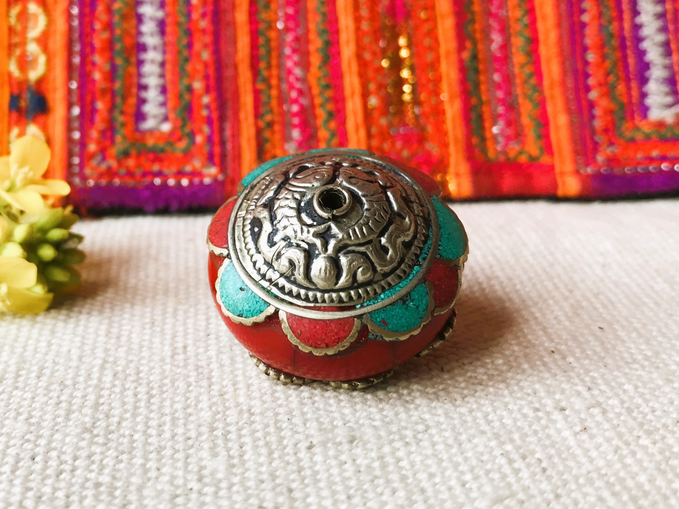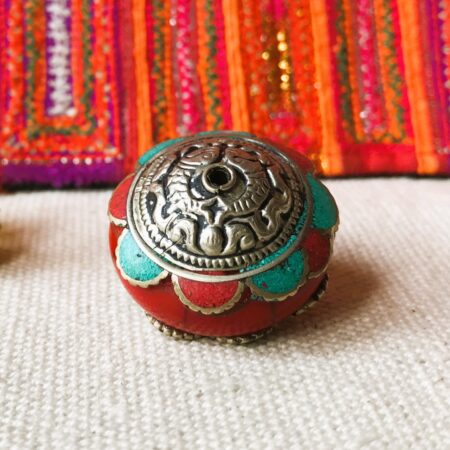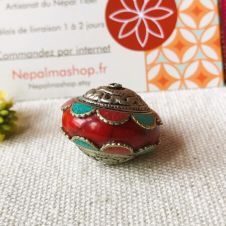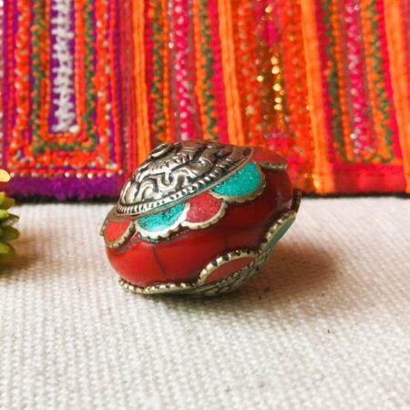 Une ravissante et grande perle provenant du Népal constituée de corail, de turquoise, d’argent tibétain et de Résine.