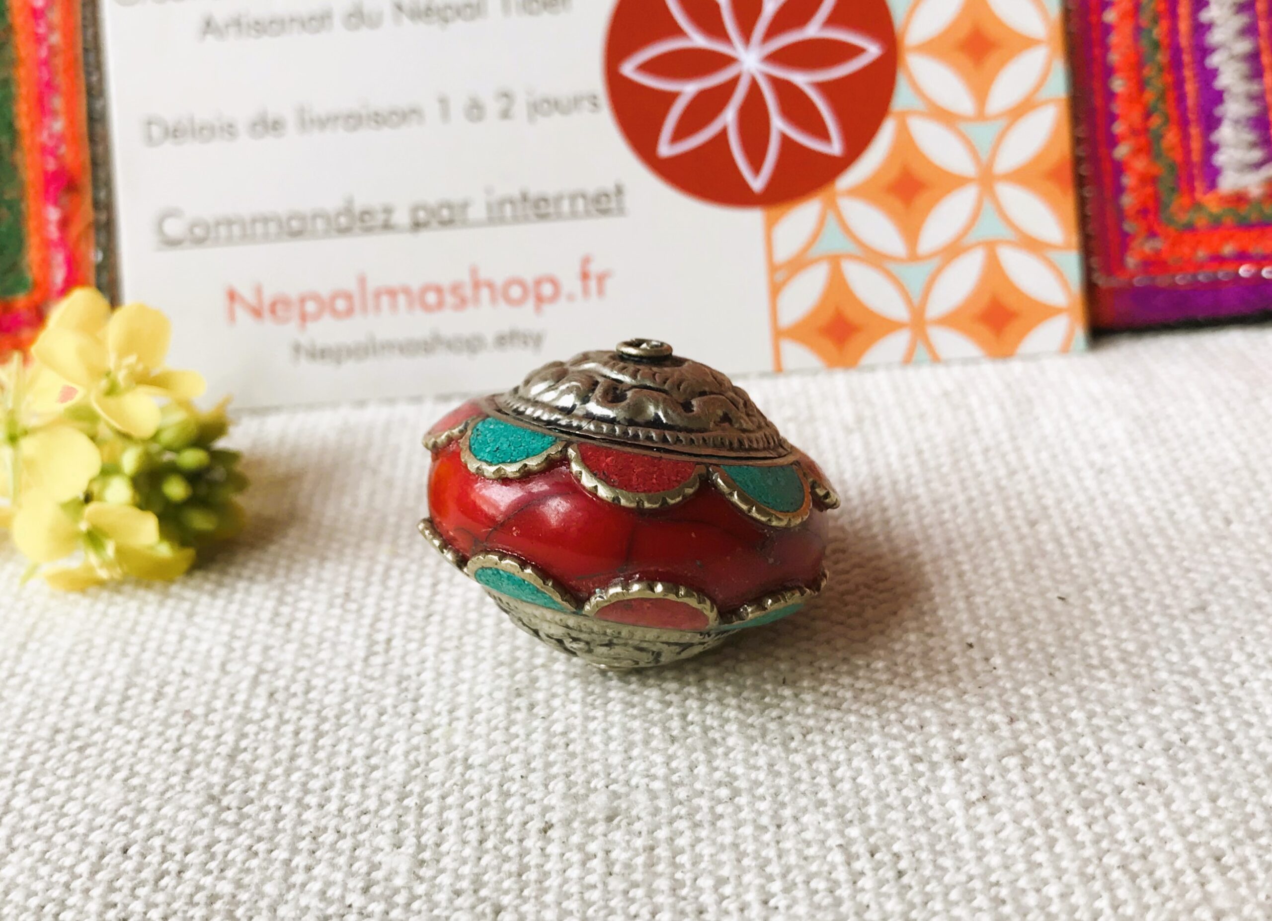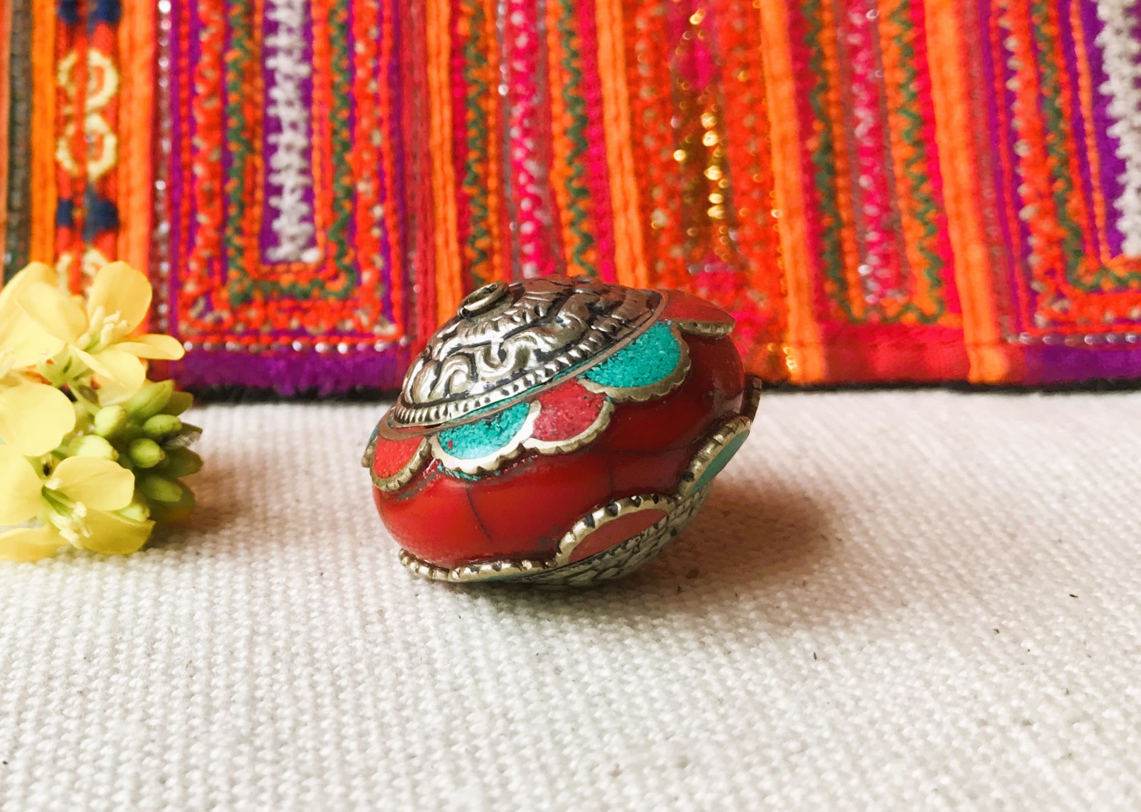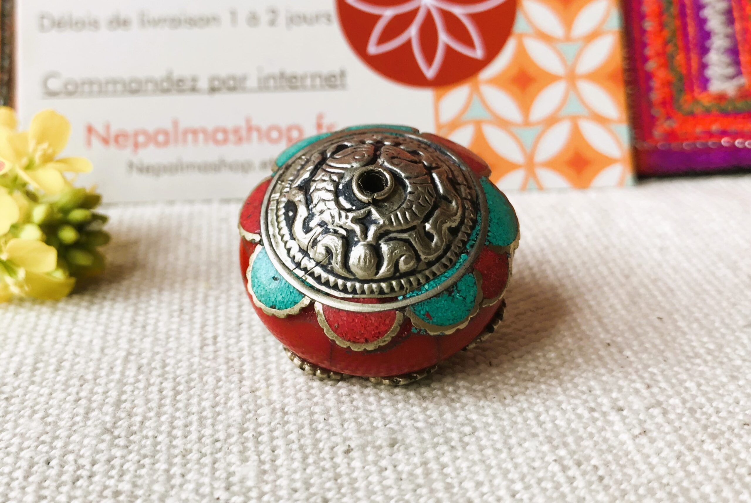 Une ravissante et grande perle provenant du Népal constituée de corail, de turquoise, d’argent tibétain et de Résine.
