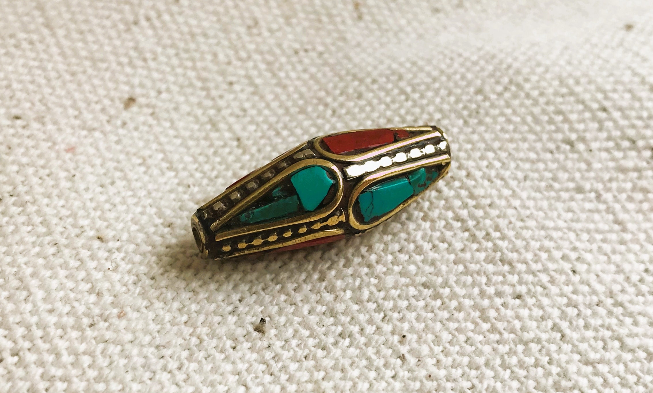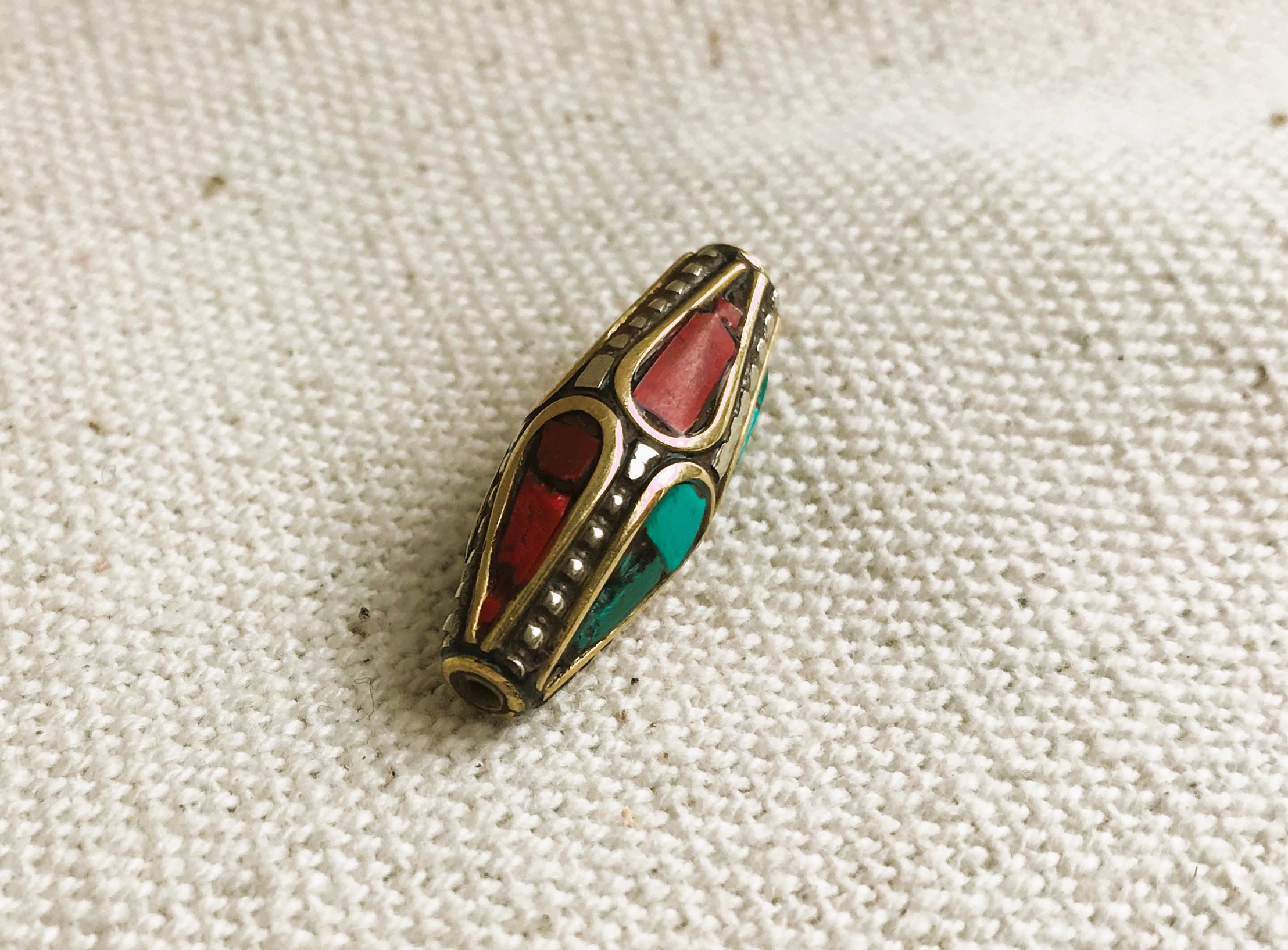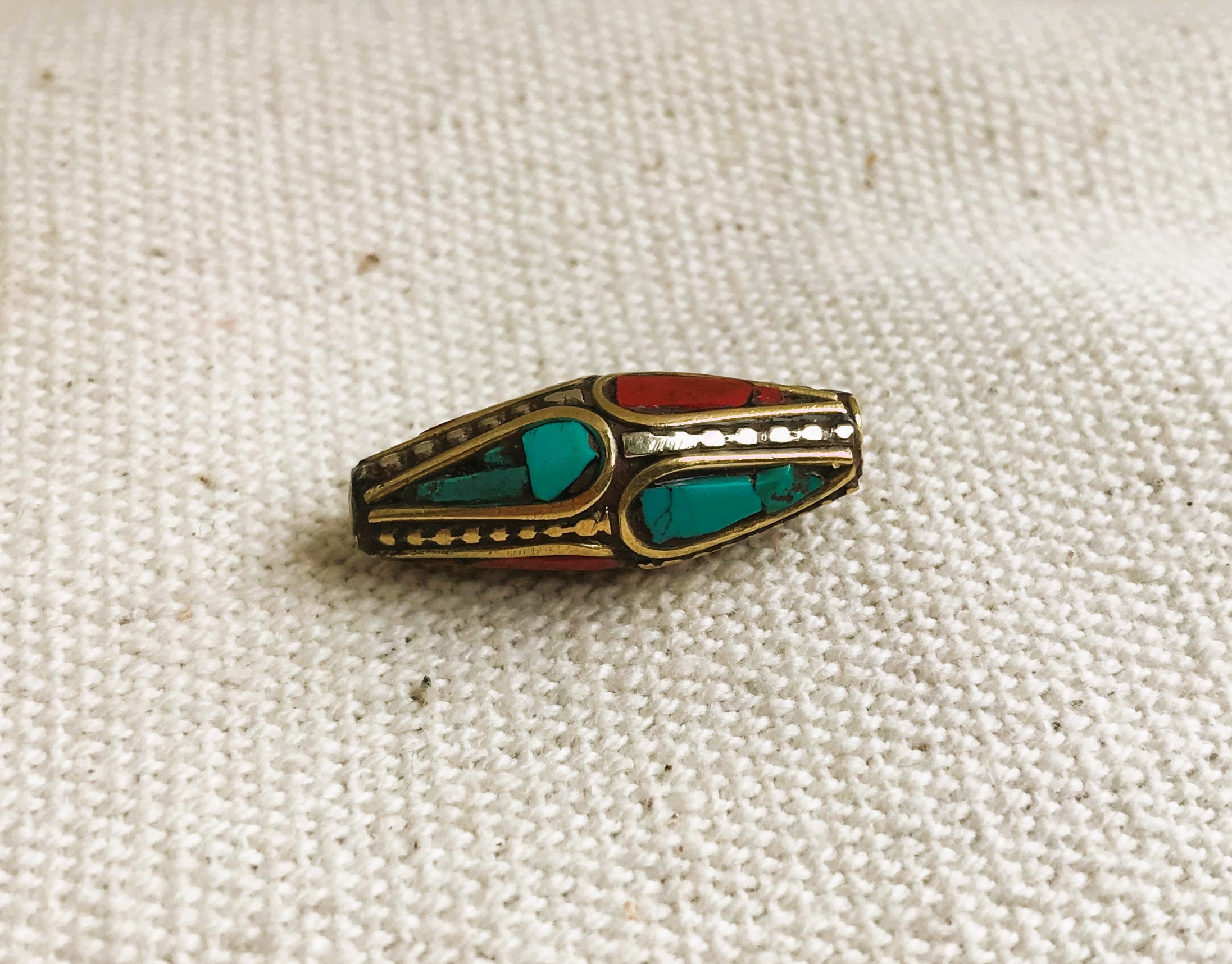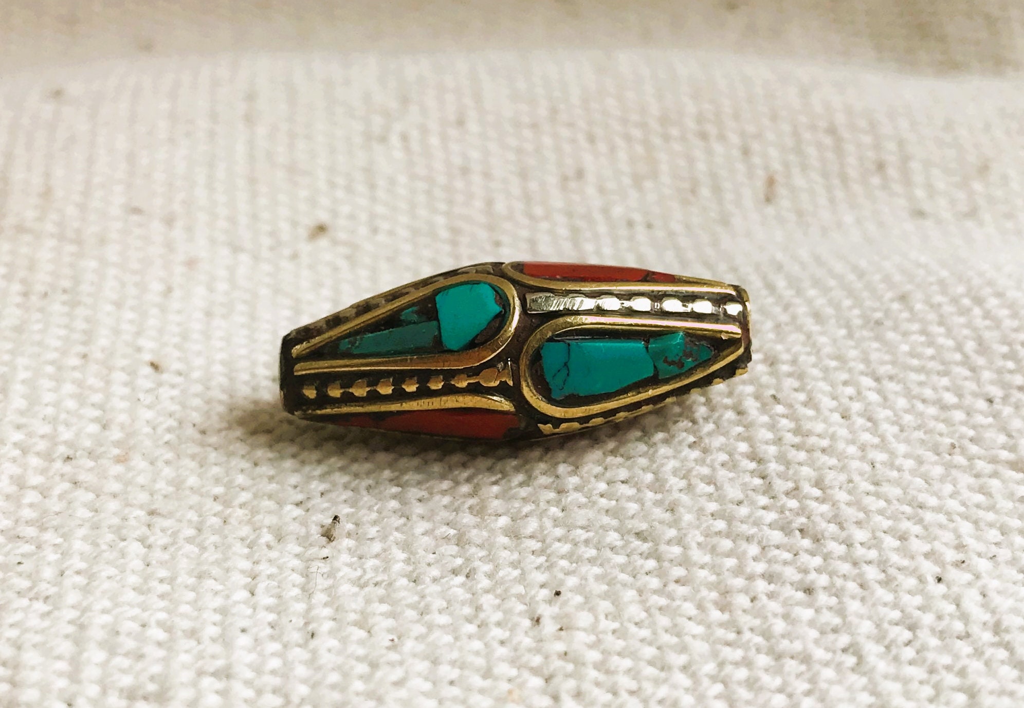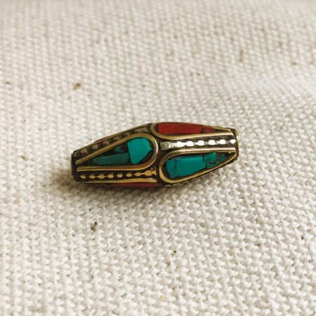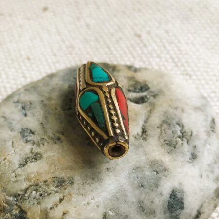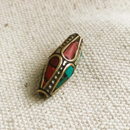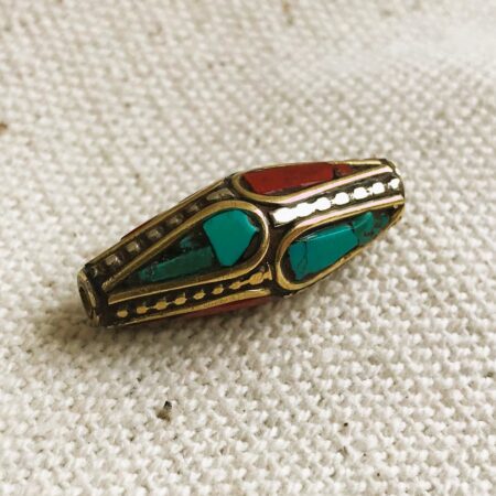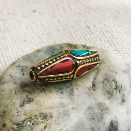 C’est une perle composée de turquoise,de corail et de laiton. Très belle pièce entièrement fabriquée à la main.