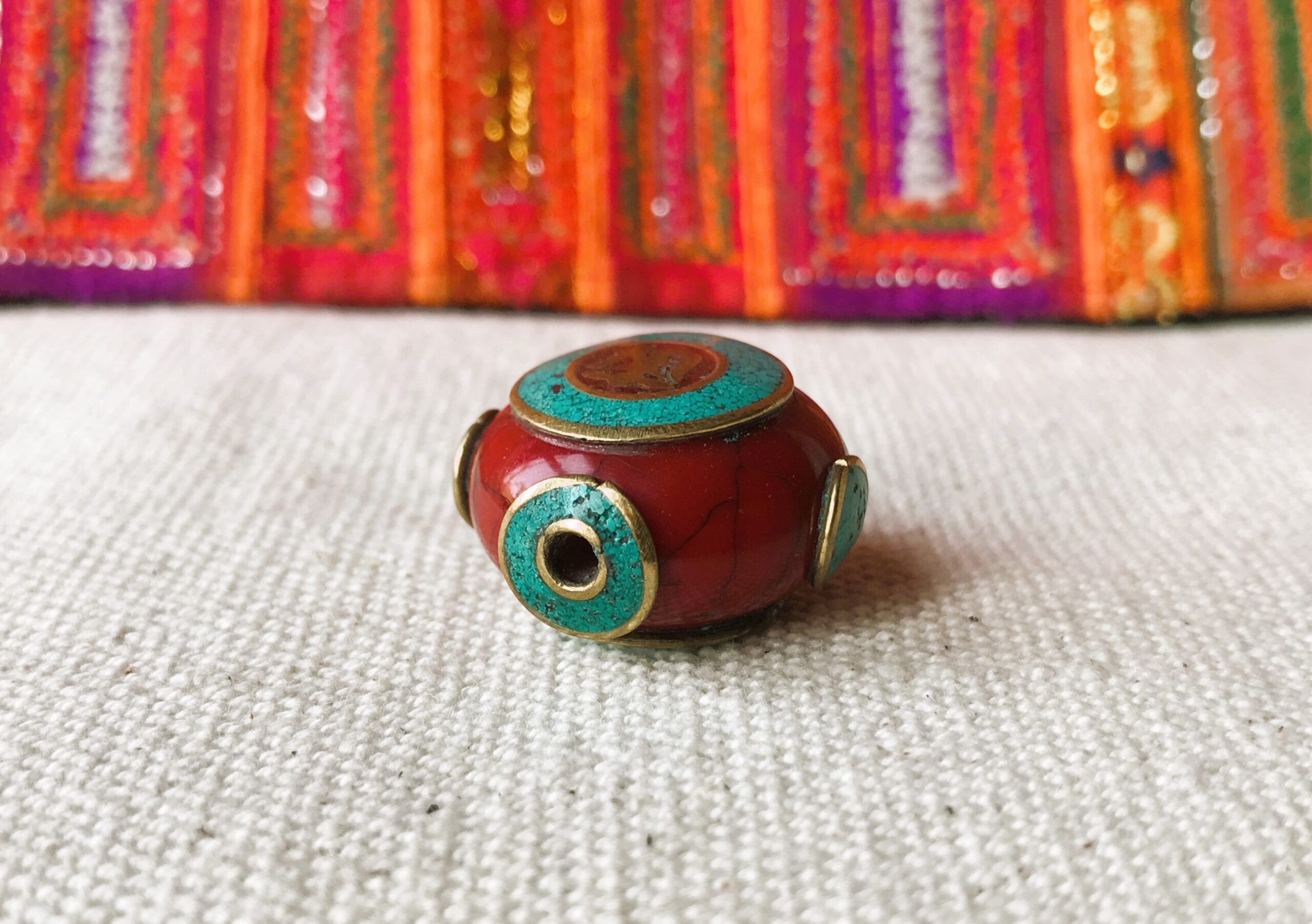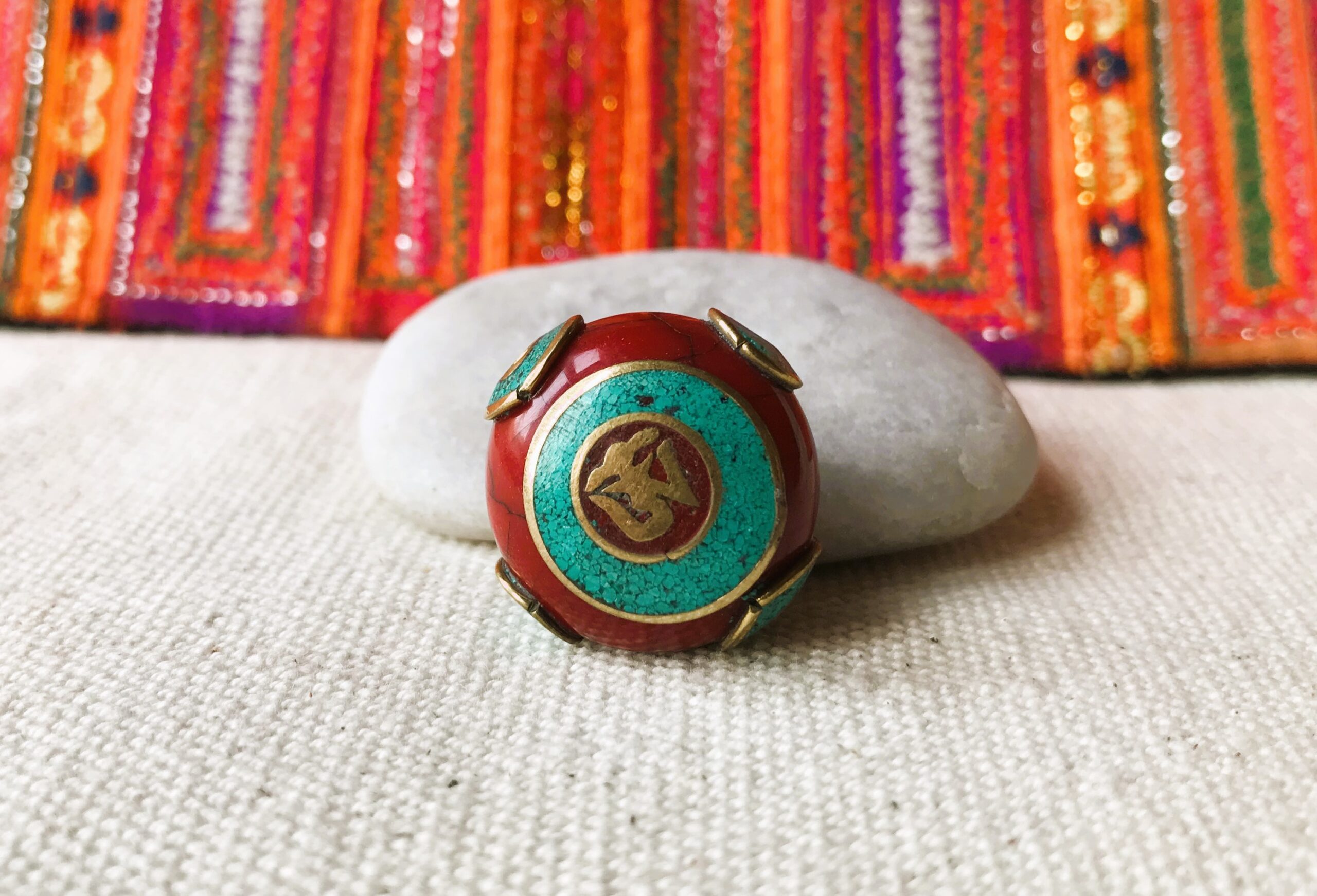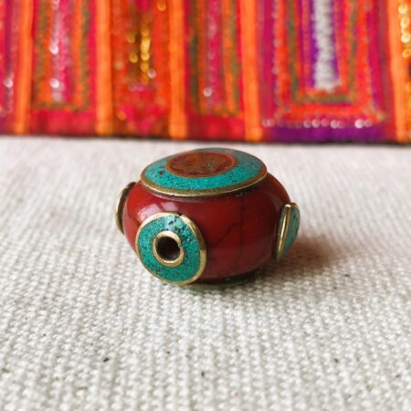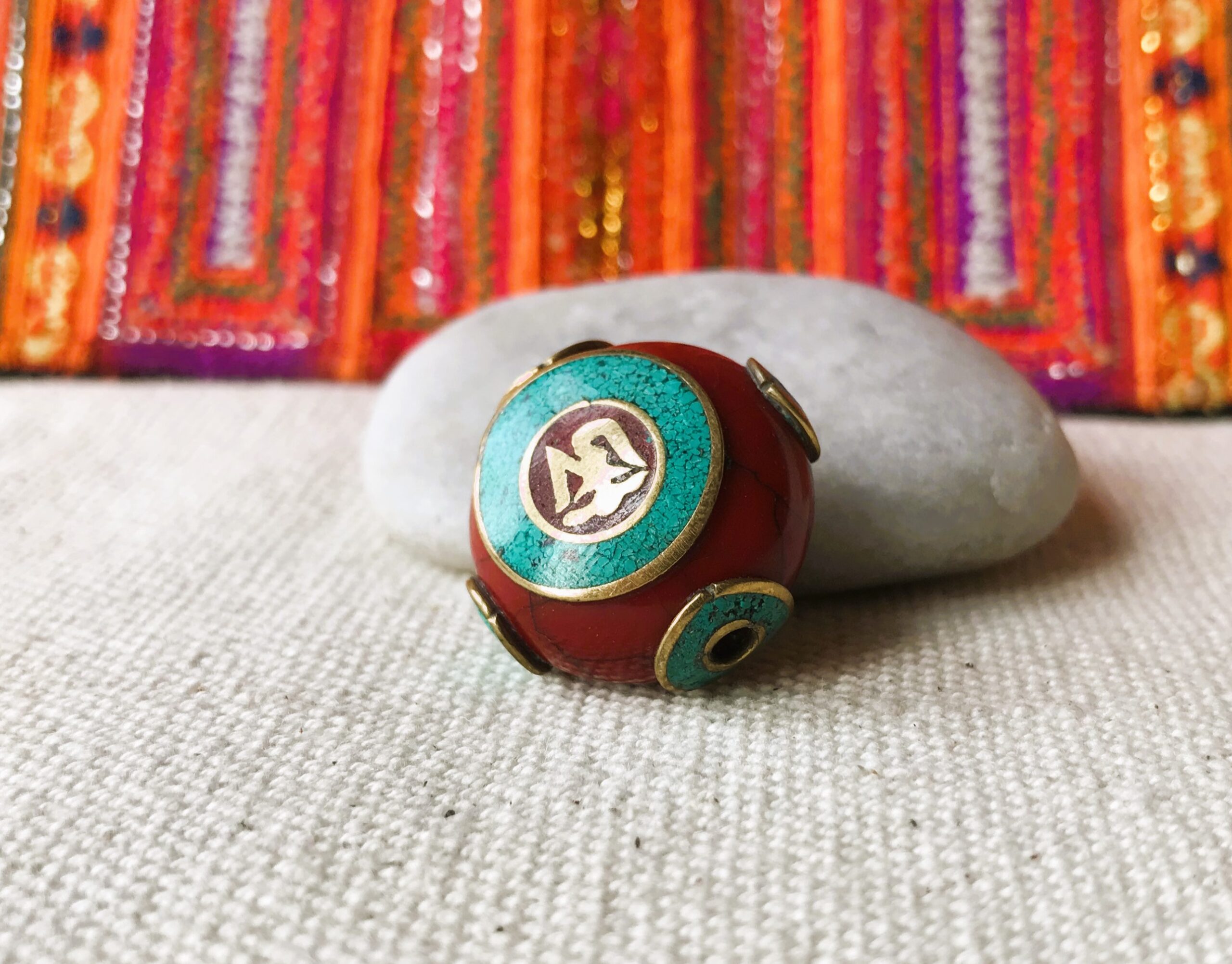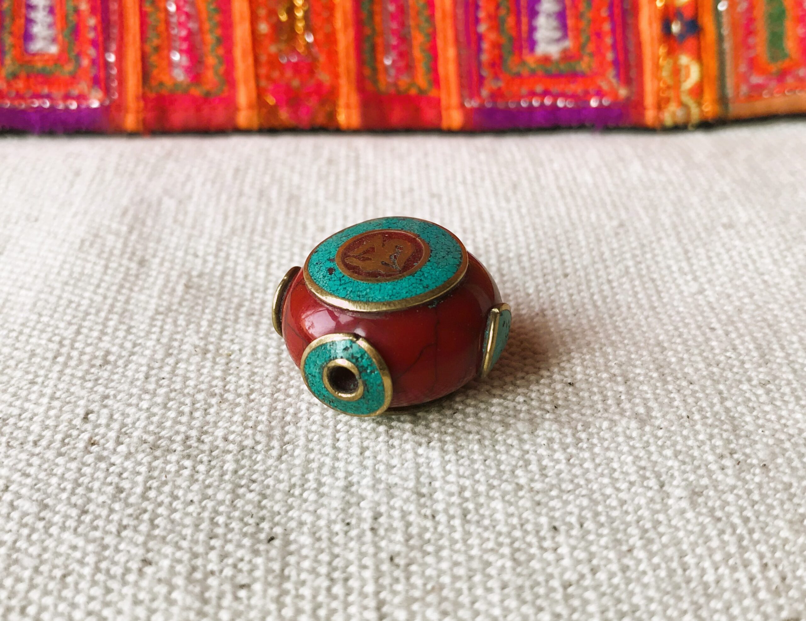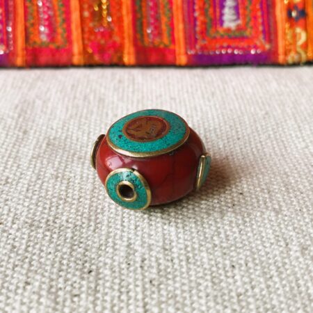 Magnifique perle traditionnelle du Tibet travaillée avec de la Turquoise, du Corail, de la Résine ambrée et du laiton. Le symbole qui noté sur les deux cotés est le « OM ».