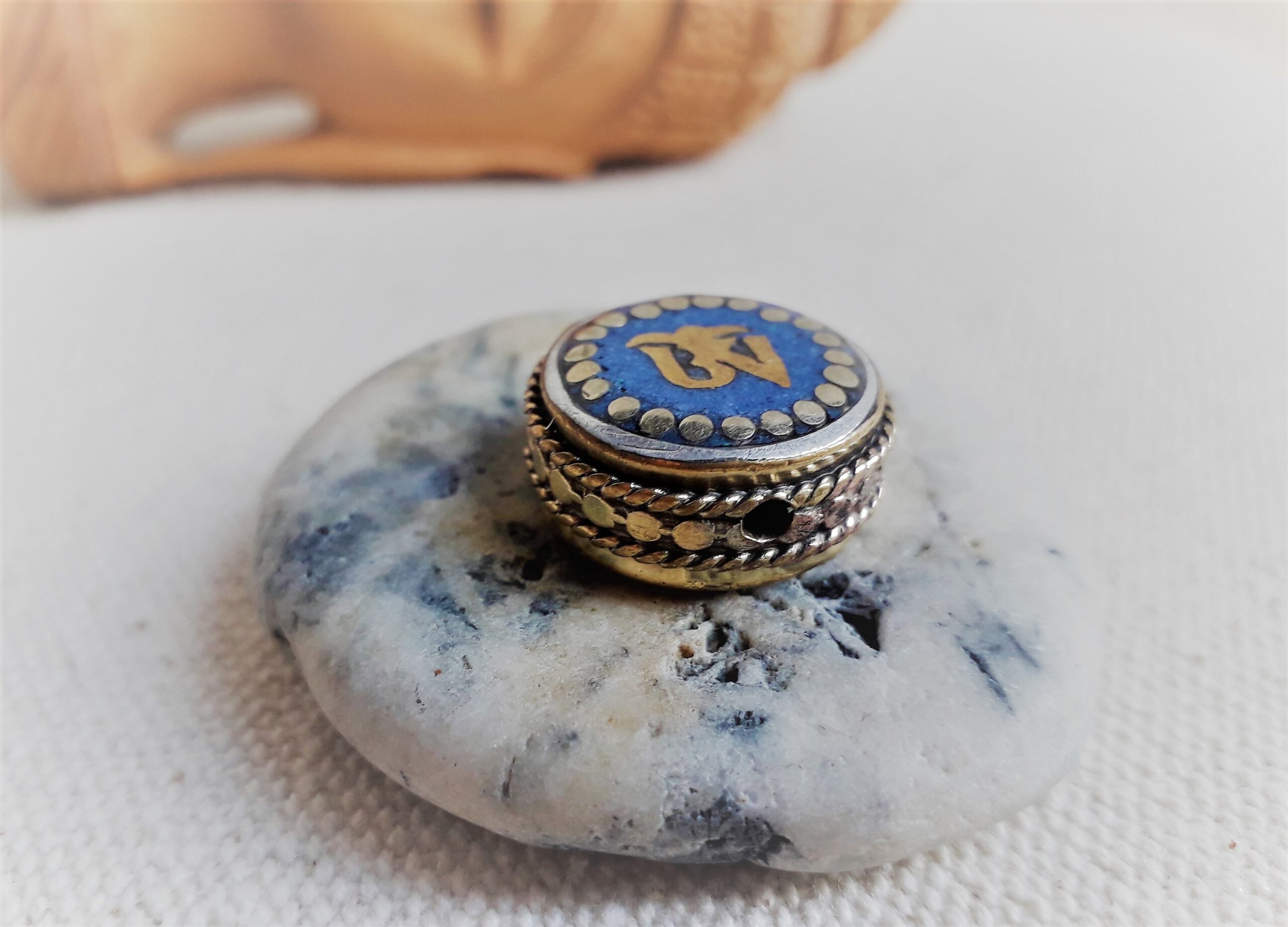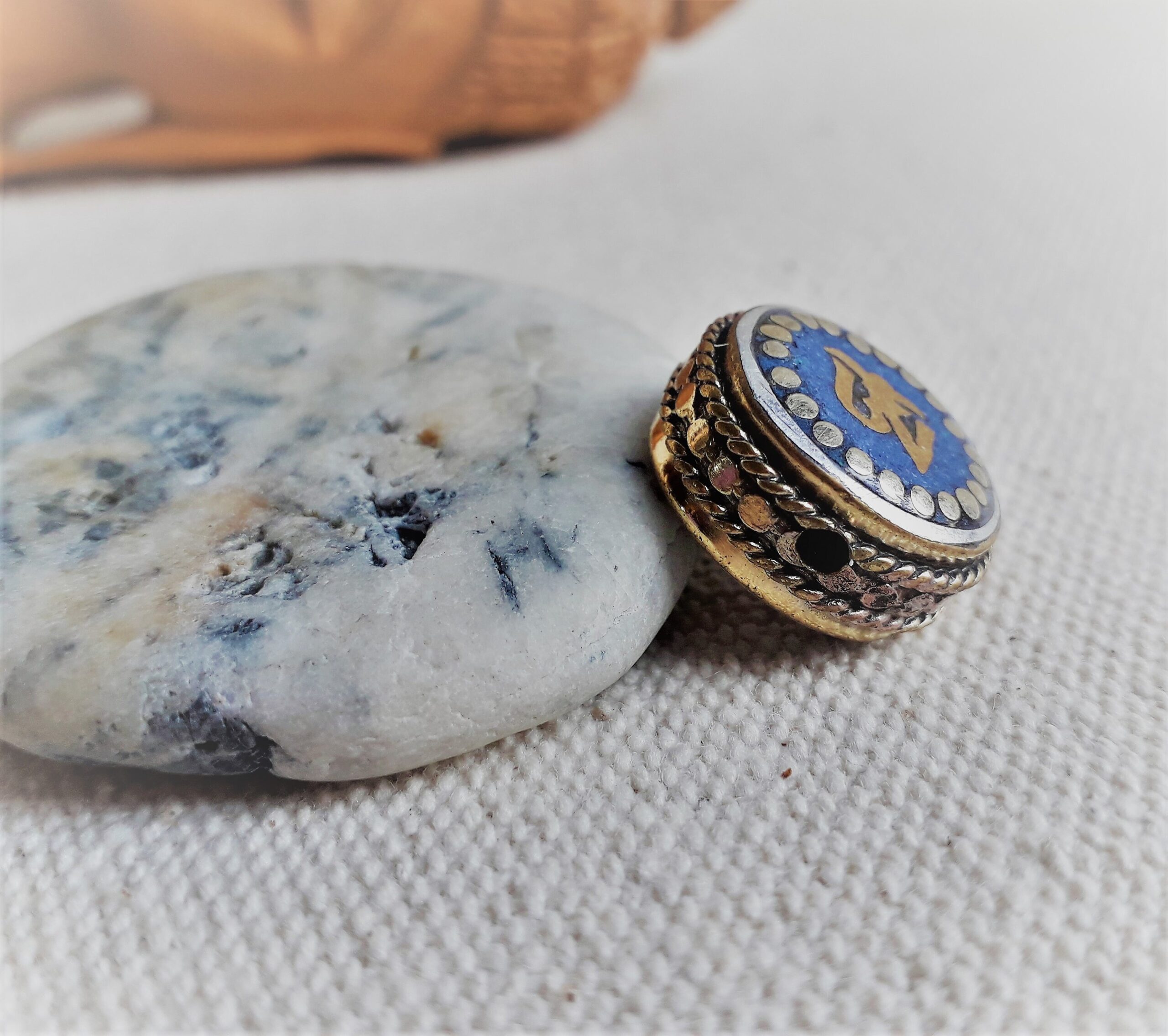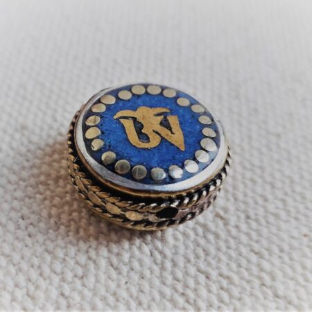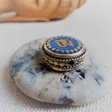 C’est une perle composée de Lapis Lazuli ainsi que de laiton. Très belle pièce entièrement fabriquée à la main.