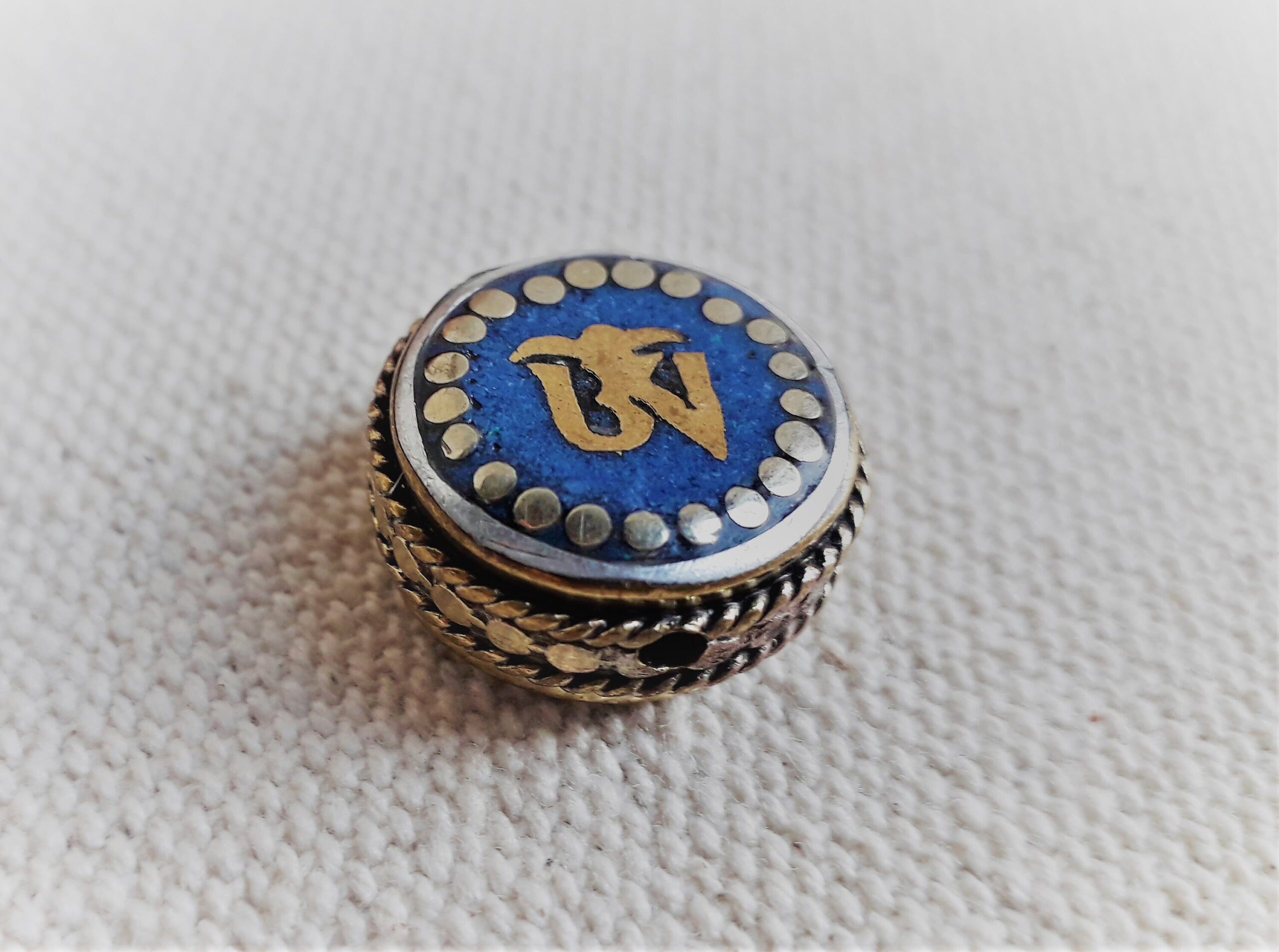 Le symbole qui est noté sur les deux cotés est le « OM ». C’est une syllabe sanskrite que l’on retrouve dans plusieurs religions : l’hindouisme et ses yogas, le bouddhisme, le jaïnisme, le sikhisme, et le brahmanisme. Cette syllabe serait la somme et la substance du son de l’Univers