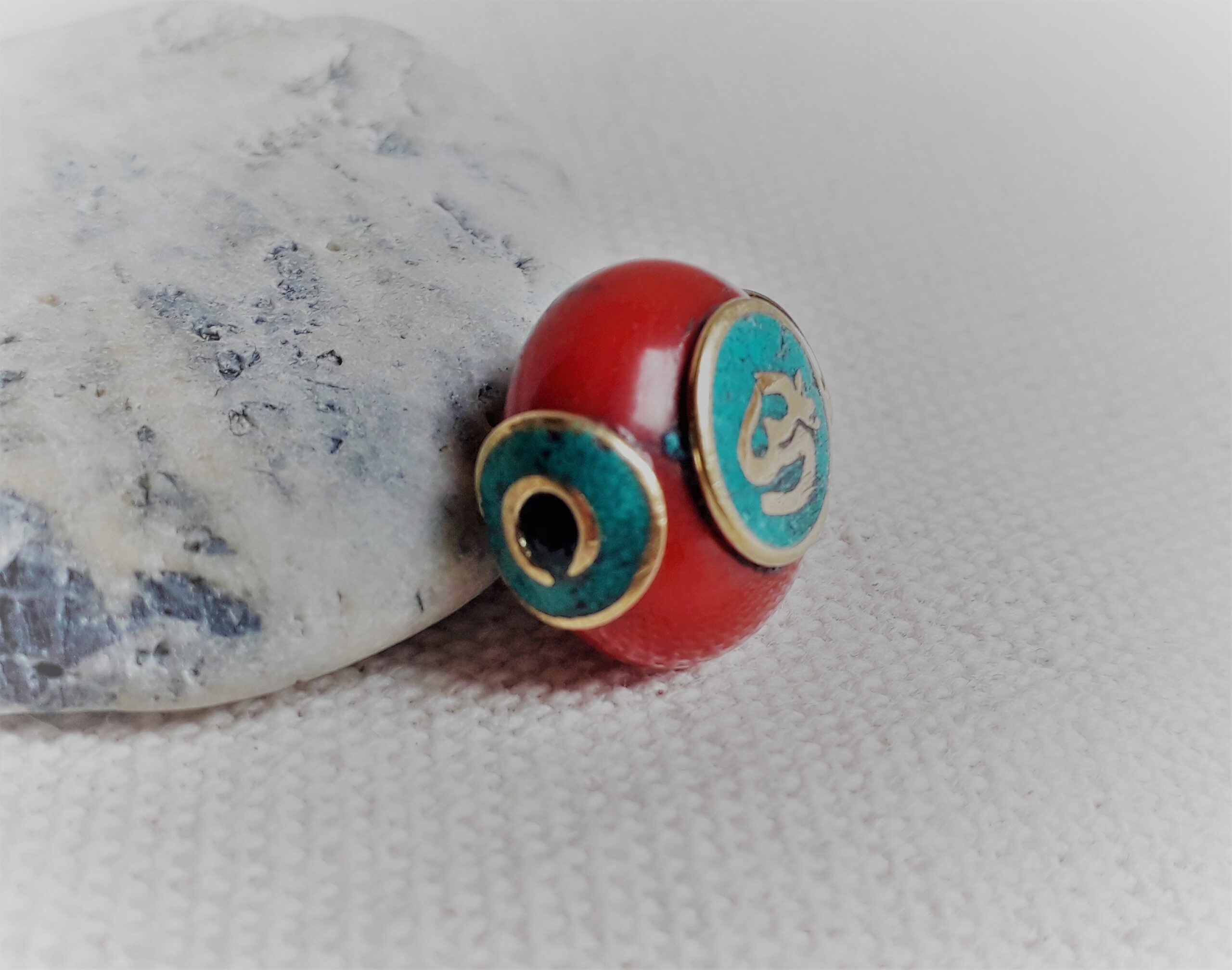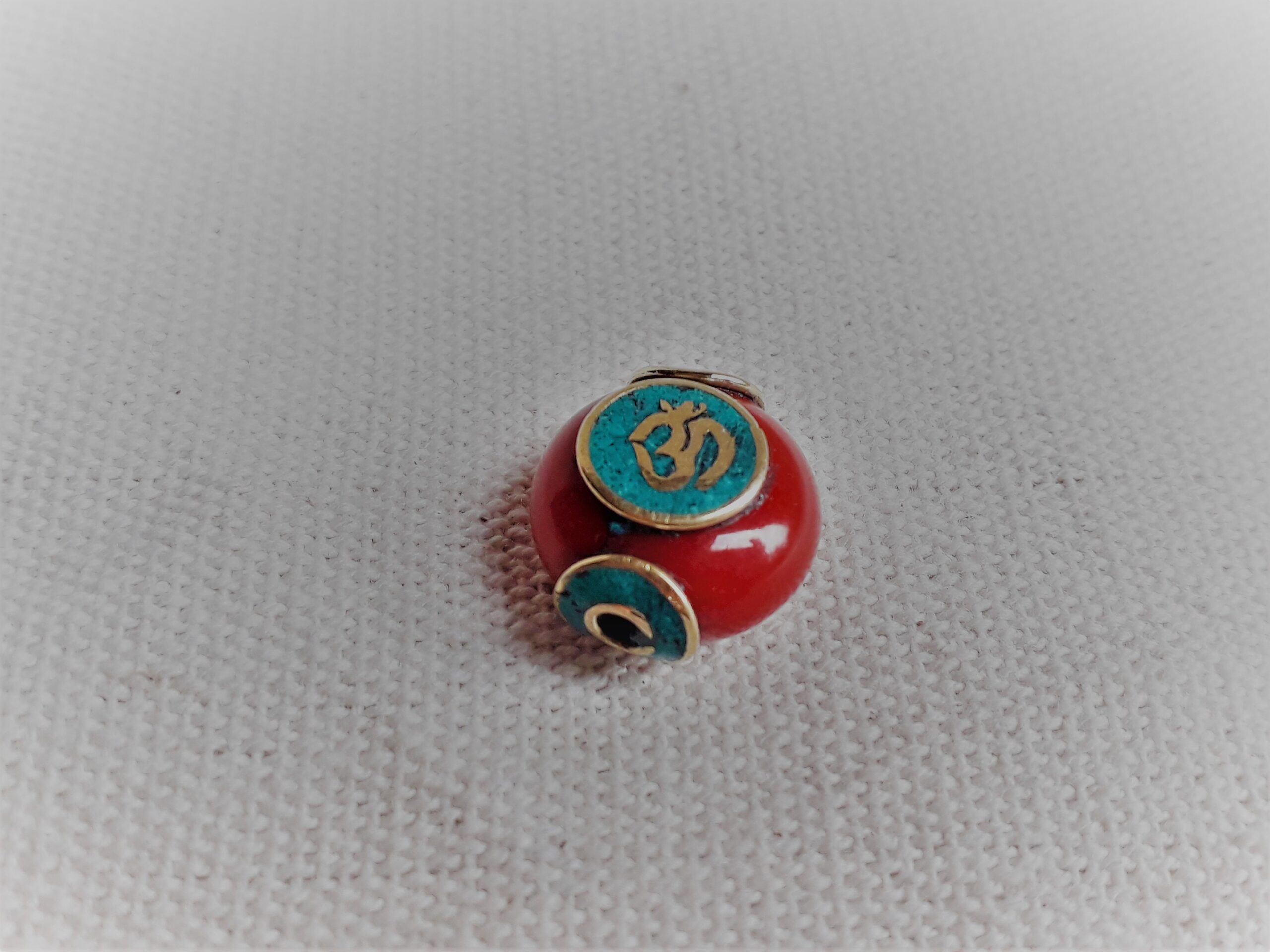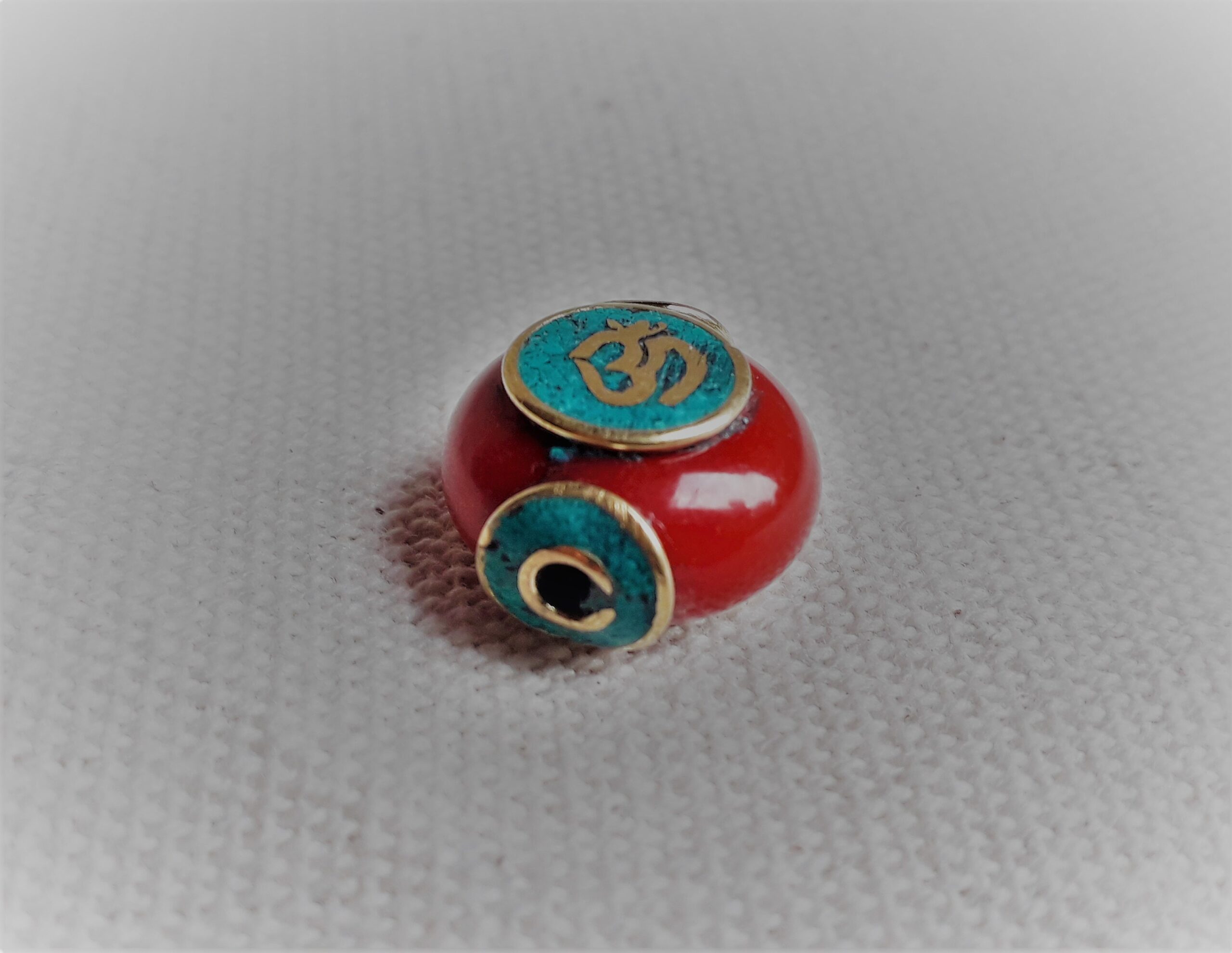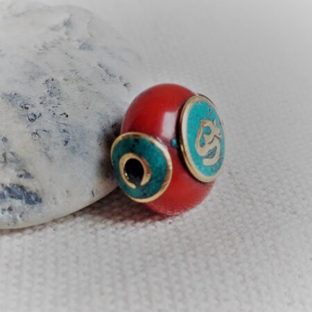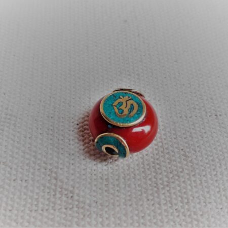 Magnifique perle traditionnelle du Tibet travaillée avec de la Turquoise, de la Résine et du laiton. Le symbole qui est noté sur les deux cotés est le « OM ». C’est une syllabe sanskrite que l’on retrouve dans plusieurs religions : l’hindouisme, le bouddhisme, le jaïnisme, le sikhisme, et le brahmanisme. Cette syllabe serait la somme et la substance du son de l’Univers.