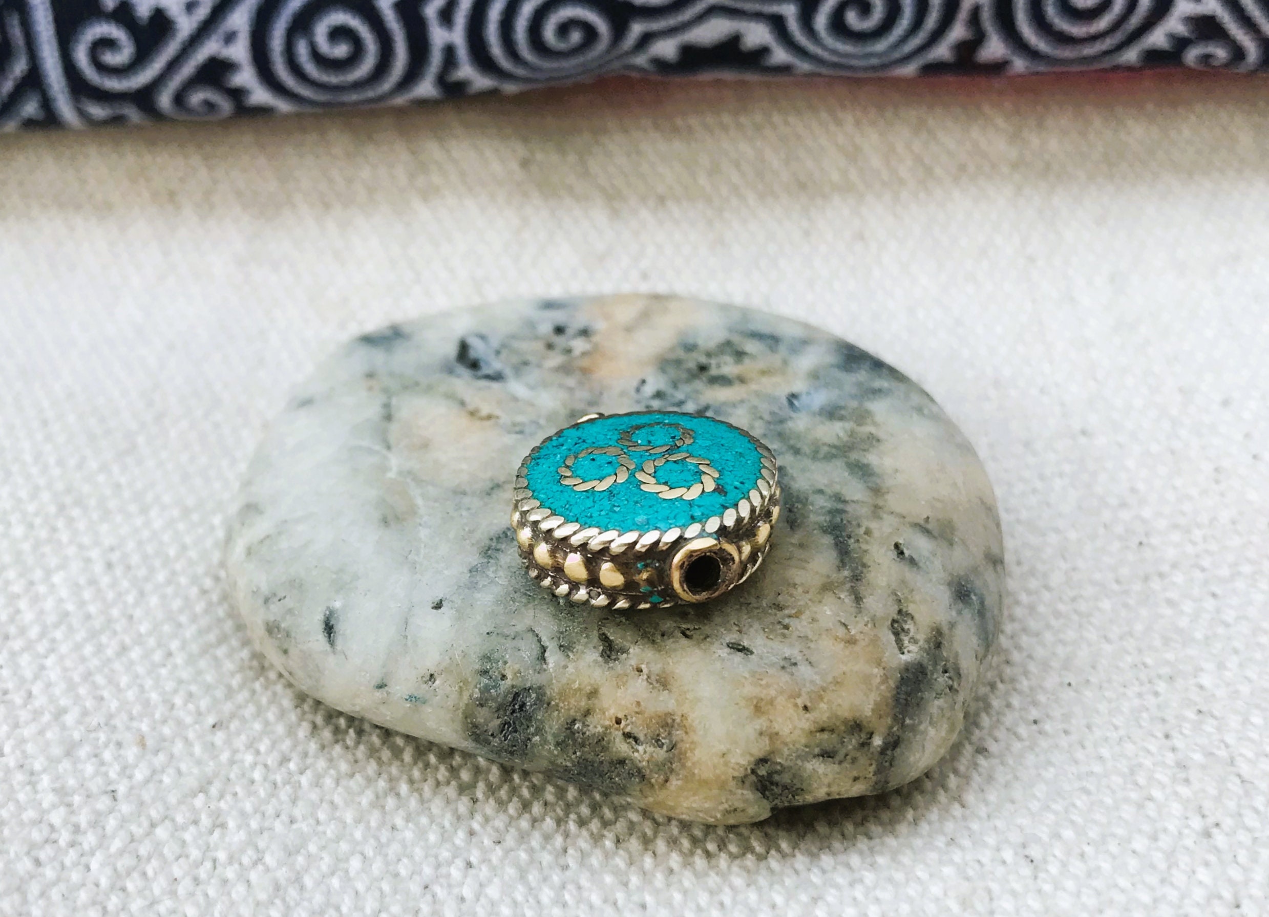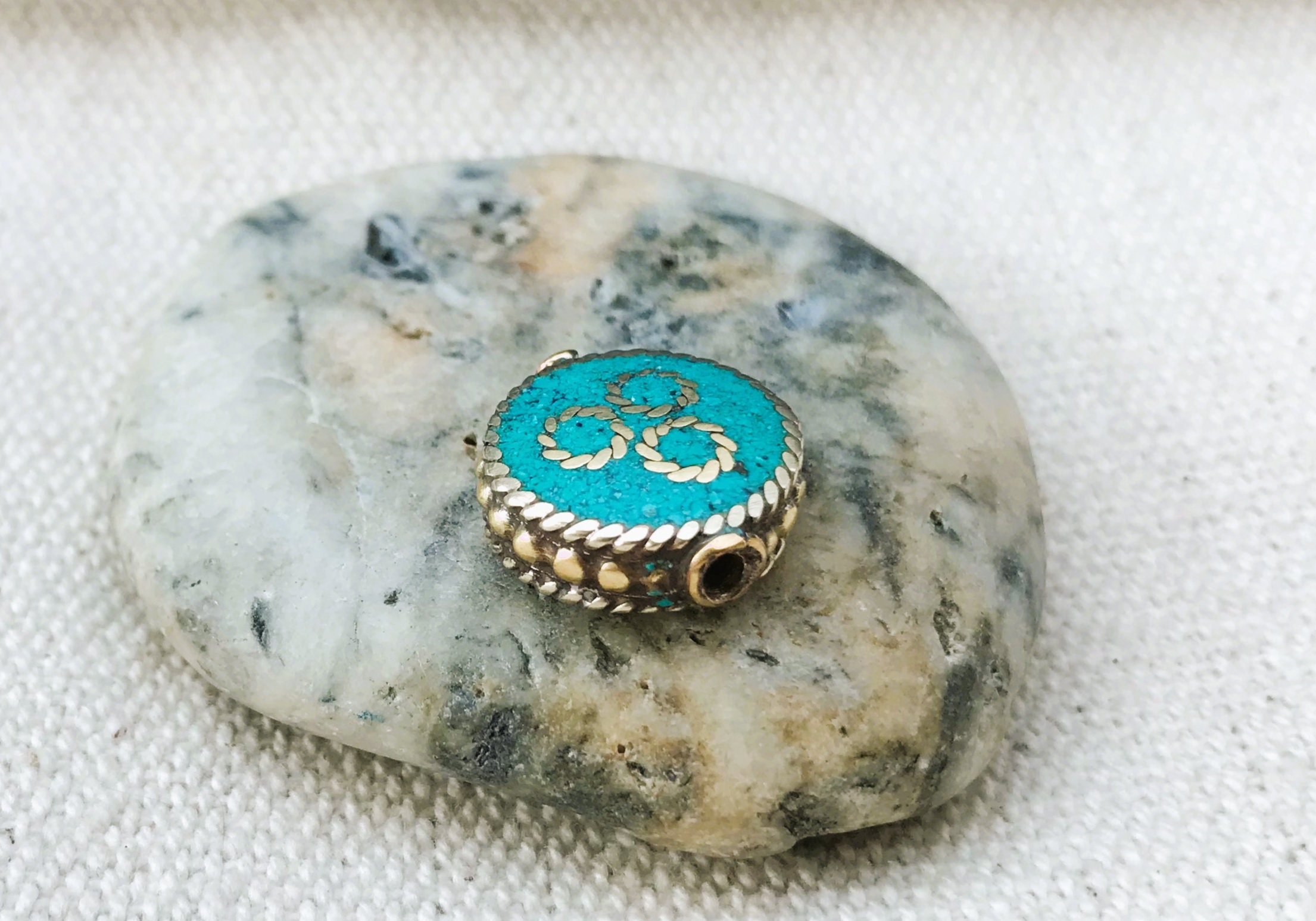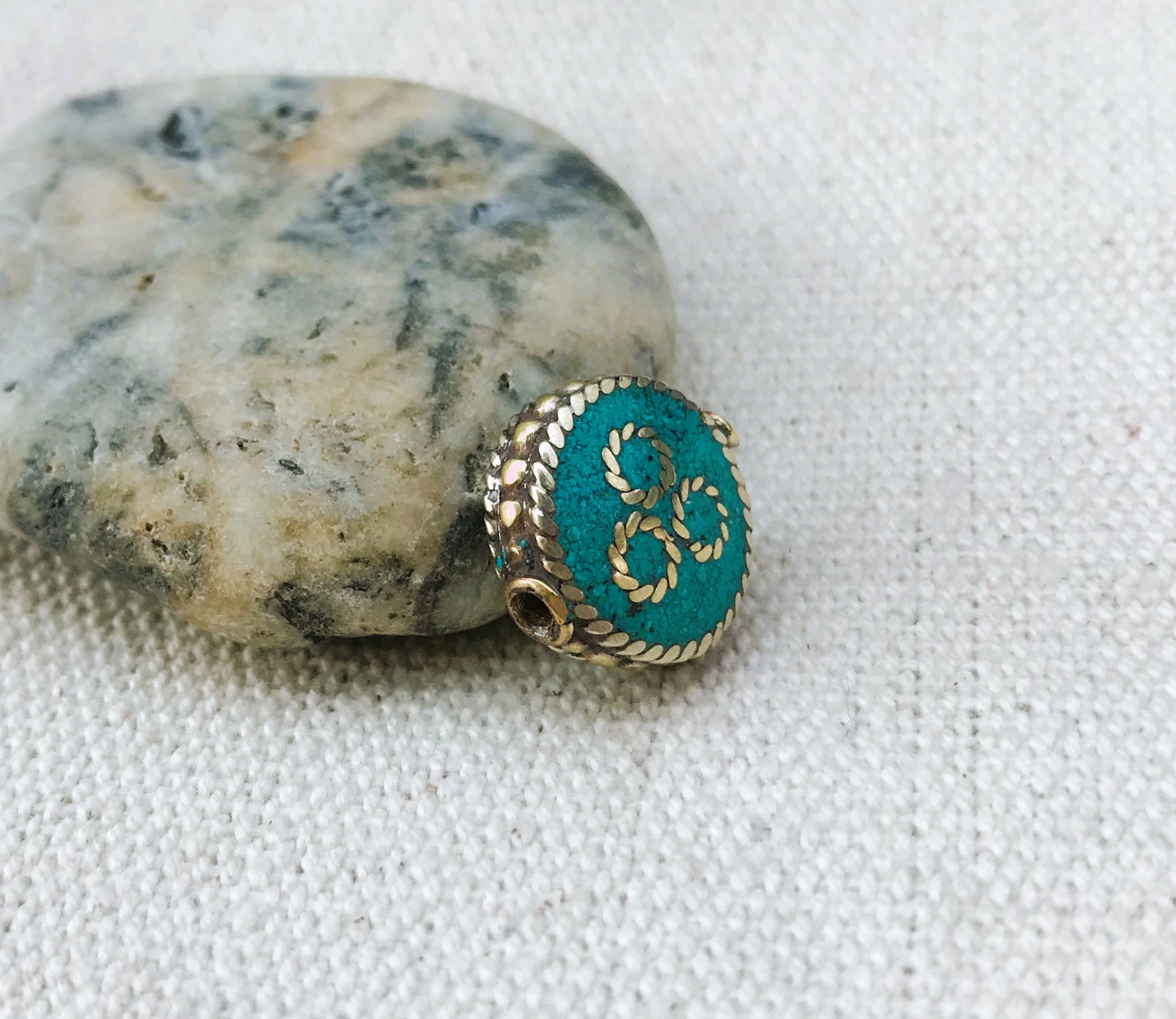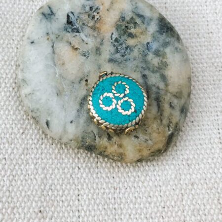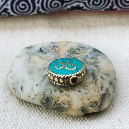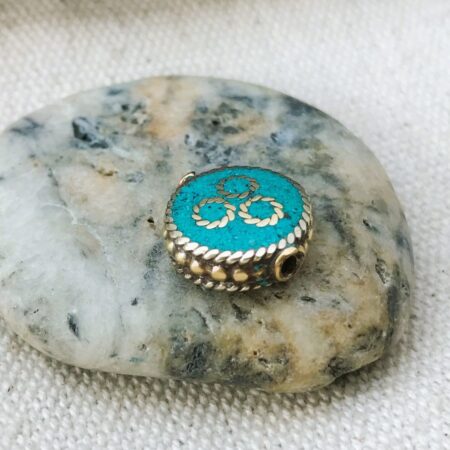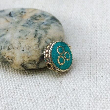 C’est une perle composée de turquoise ainsi que de laiton. Très belle pièce entièrement fabriquée à la main.