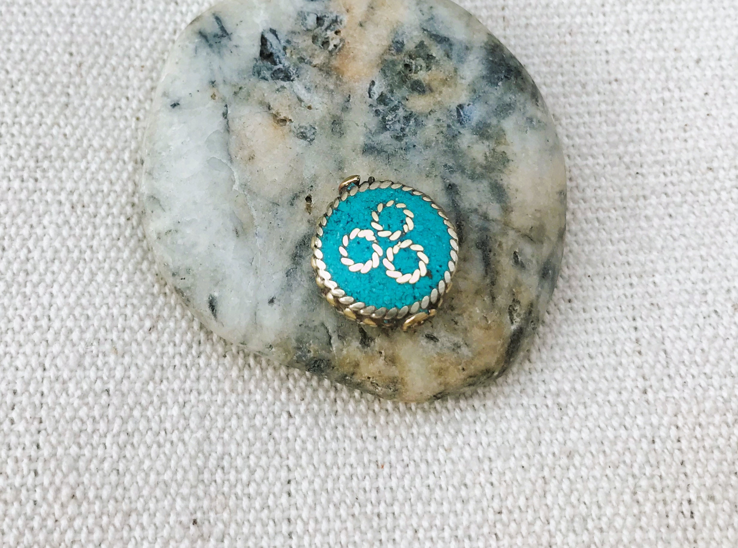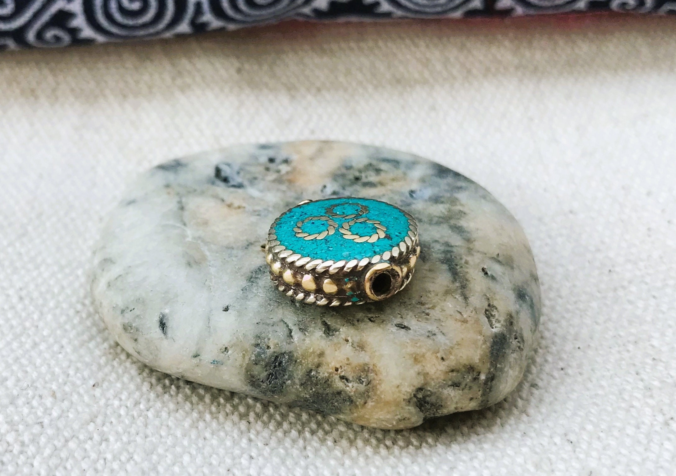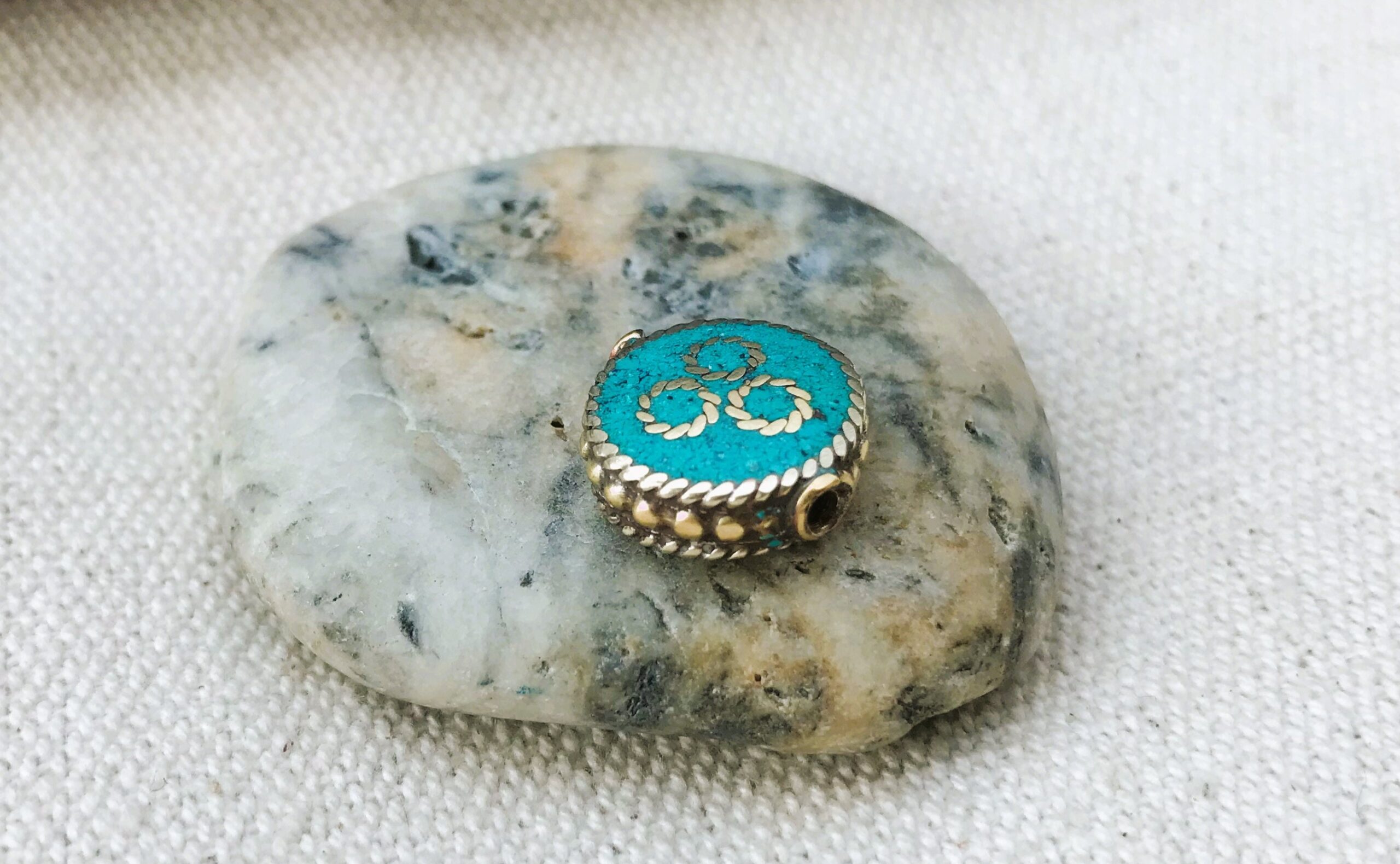 C’est une perle composée de turquoise ainsi que de laiton. Très belle pièce entièrement fabriquée à la main.