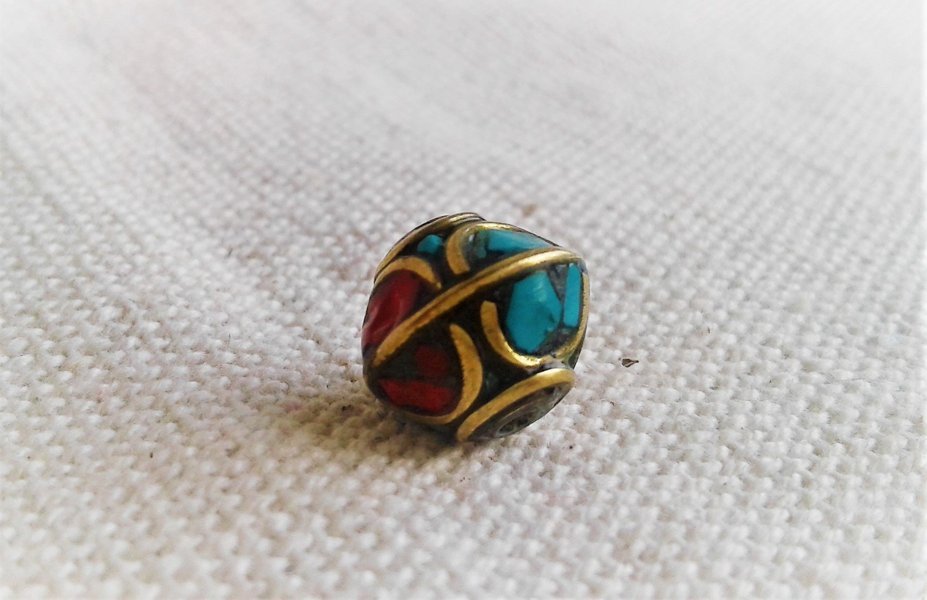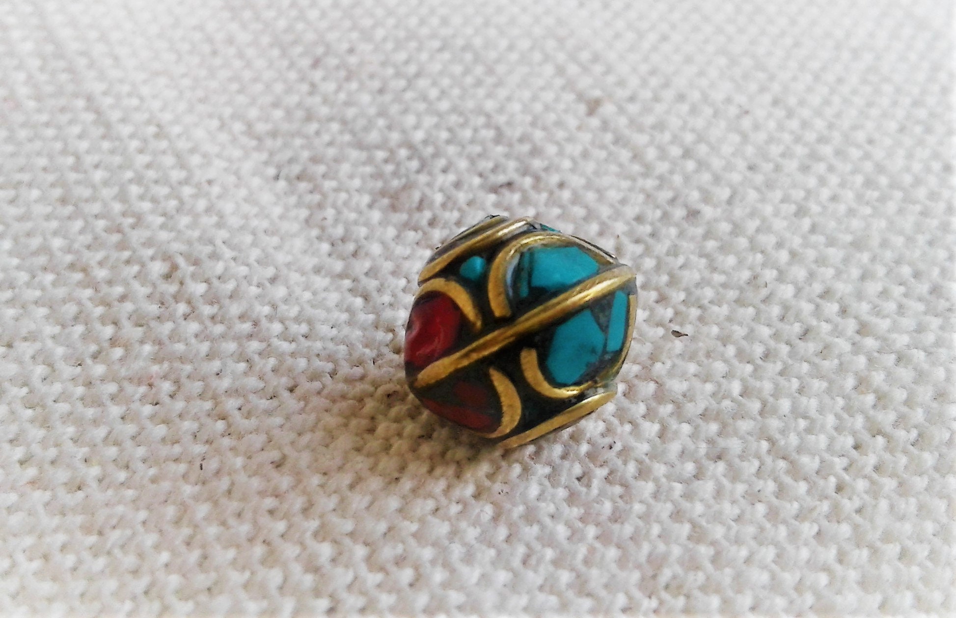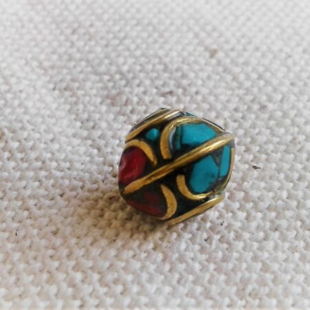 Une Perle traditionnelle du Népal Tibet travaillée avec de la Turquoise, du corail et du laiton.