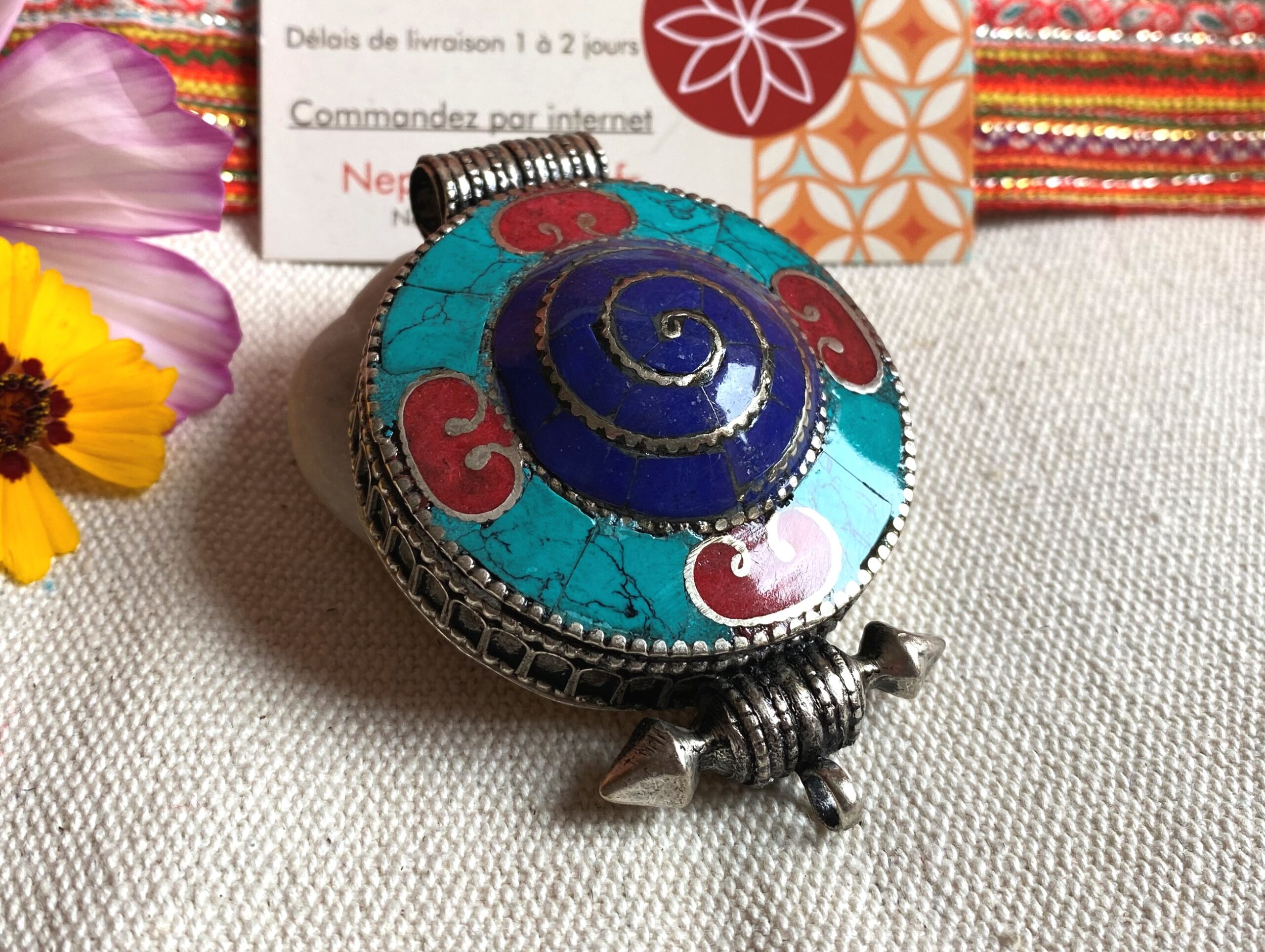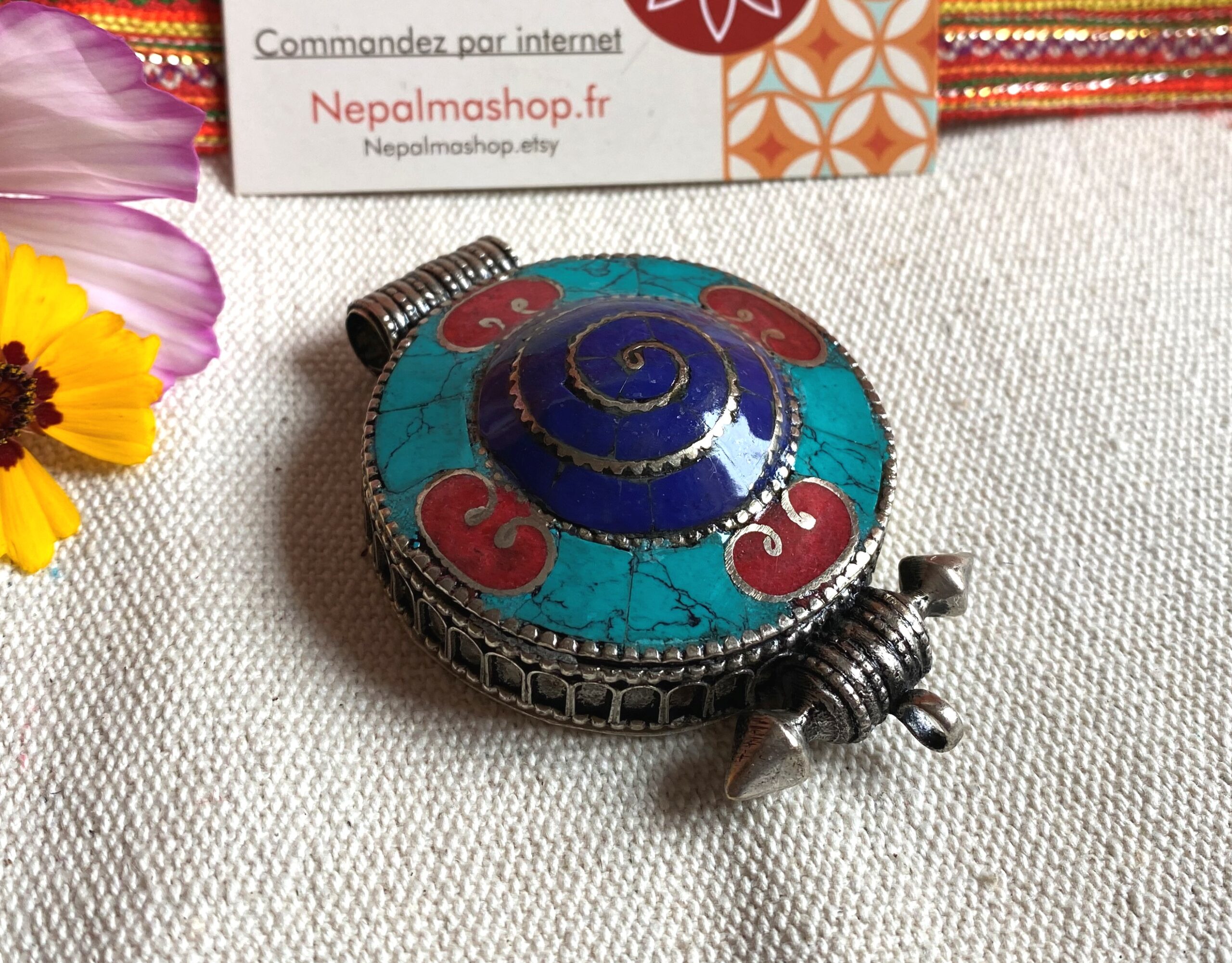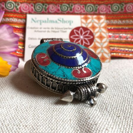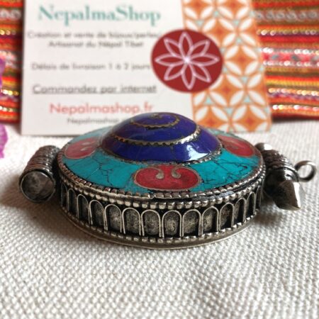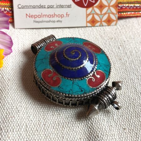 Un magnifique pendentif traditionnel Tibétain, il est en forme de cercle et sa particularité c’ est qu’il est également une boite dans laquelle vous pouvez glisser une photo, un porte bonheur, des mantras…