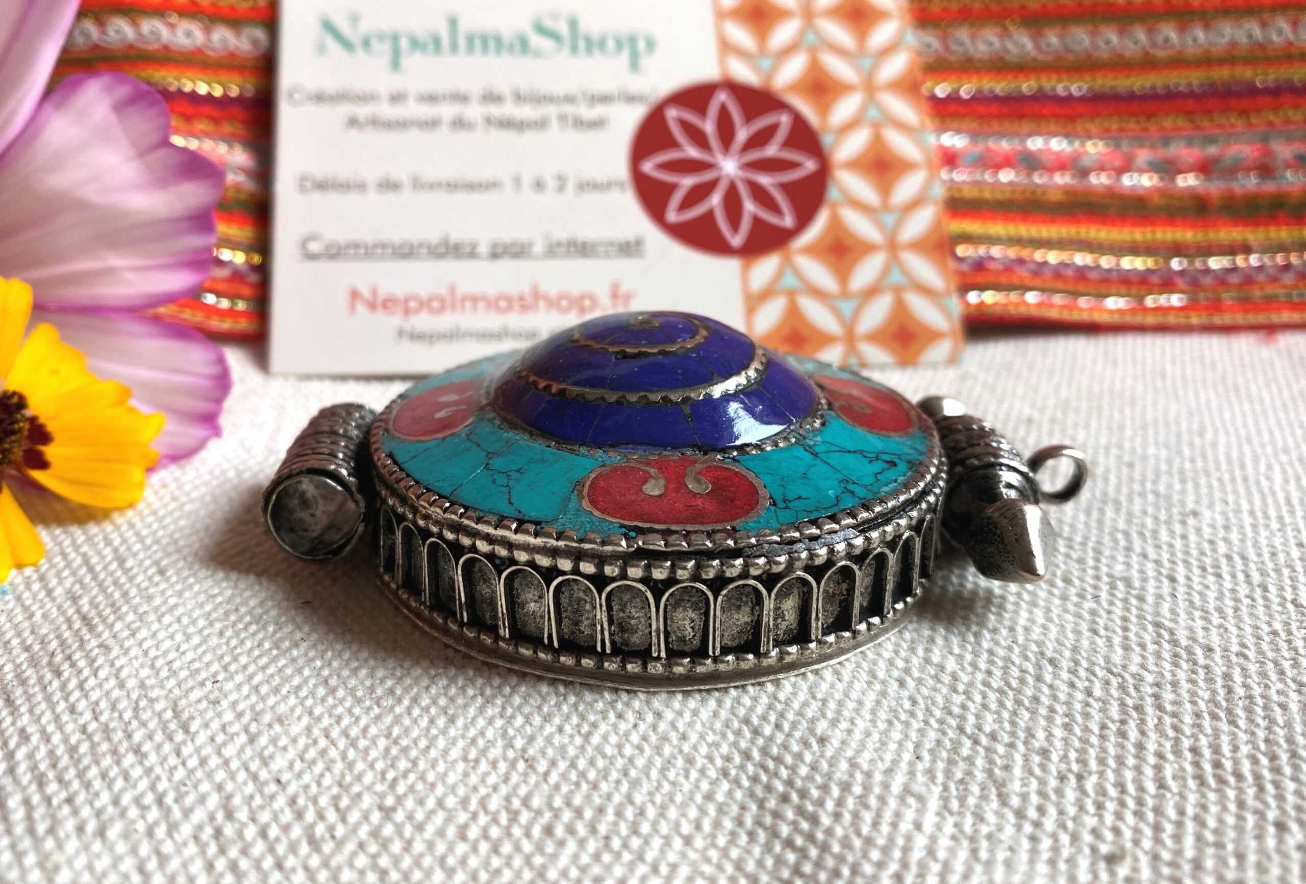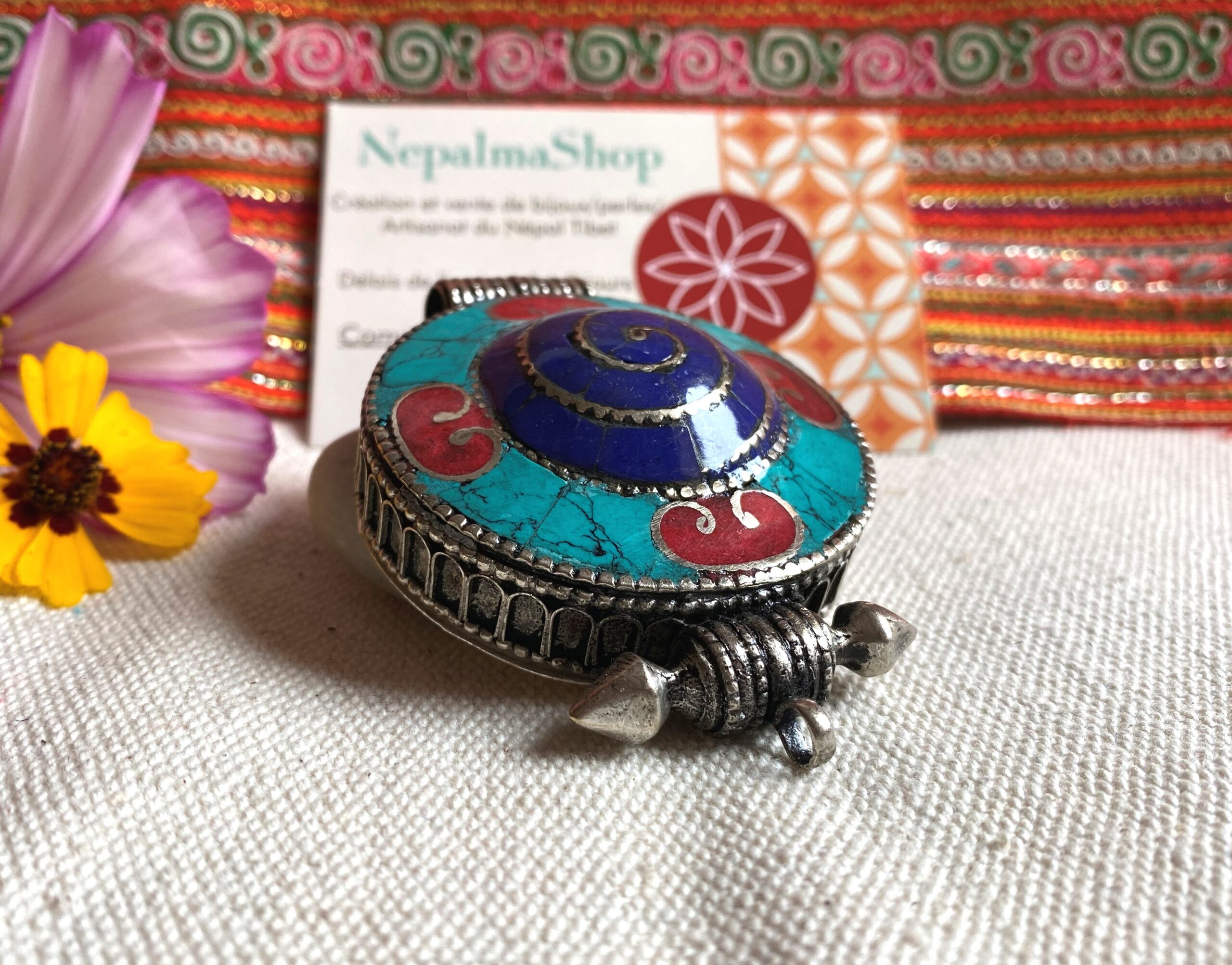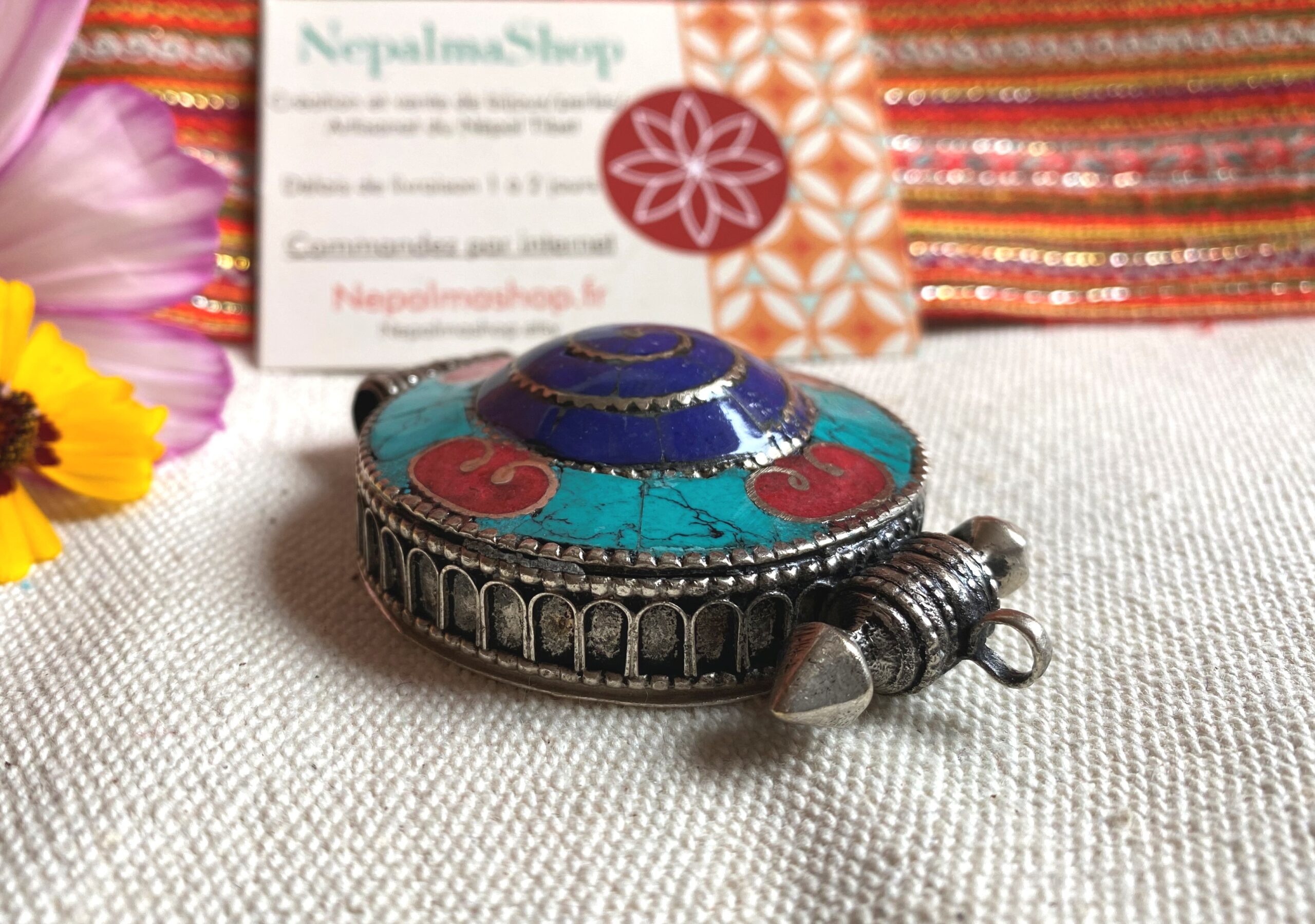 Un magnifique pendentif traditionnel Tibétain, il est en forme de cercle et sa particularité c’ est qu’il est également une boite dans laquelle vous pouvez glisser une photo, un porte bonheur, des mantras…